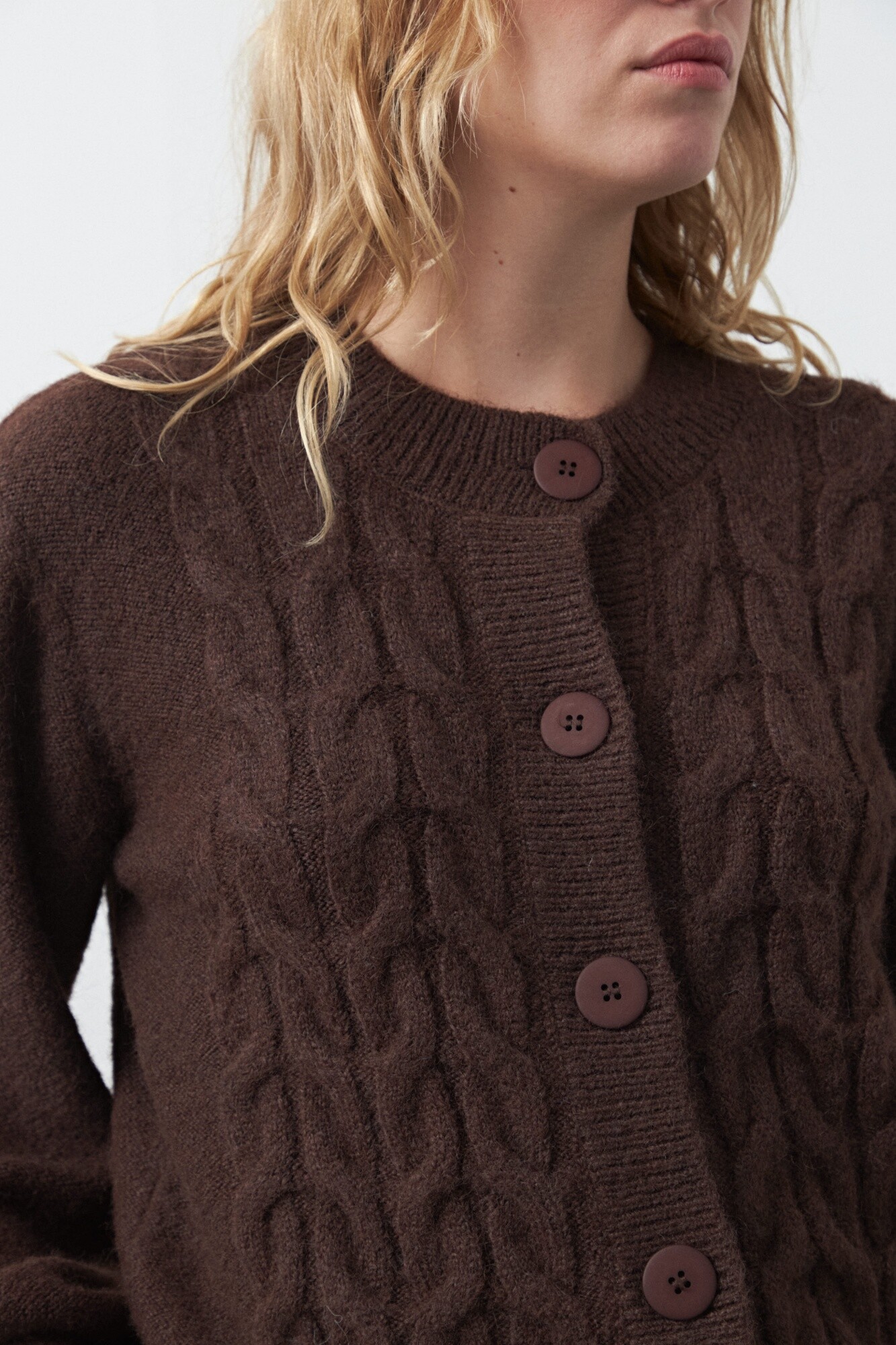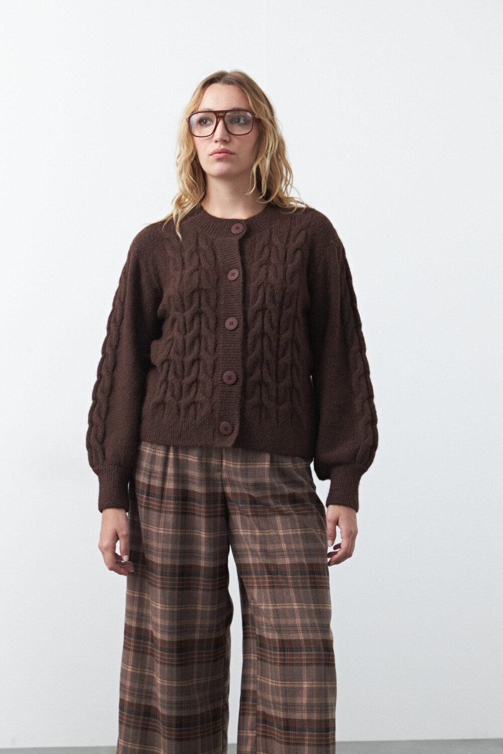 Cardigan tejido con diseño de trenzas que aporta textura y volumen, ideal para sumar calidez con un aire clásico renovado. Su silueta relajada con botones al frente y terminaciones acanaladas lo convierte en una prenda versátil, perfecta para looks de todos los días con un toque trendy.