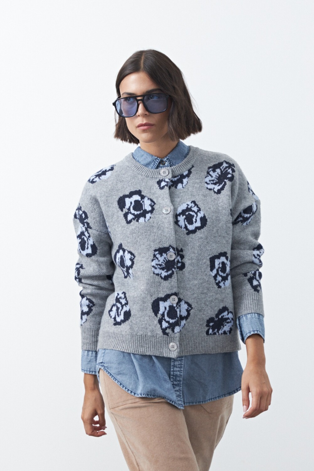 Cardigan jacquard con motivo floral que aporta textura y protagonismo al look. De silueta recta y cuello redondo, presenta cierre frontal con botones y terminaciones acanaladas que aseguran un calce cómodo. El tejido suave y con elasticidad lo convierte en una prenda versátil, ideal para usar como capa liviana sobre camisas o remeras y sumar un toque en tendencia.