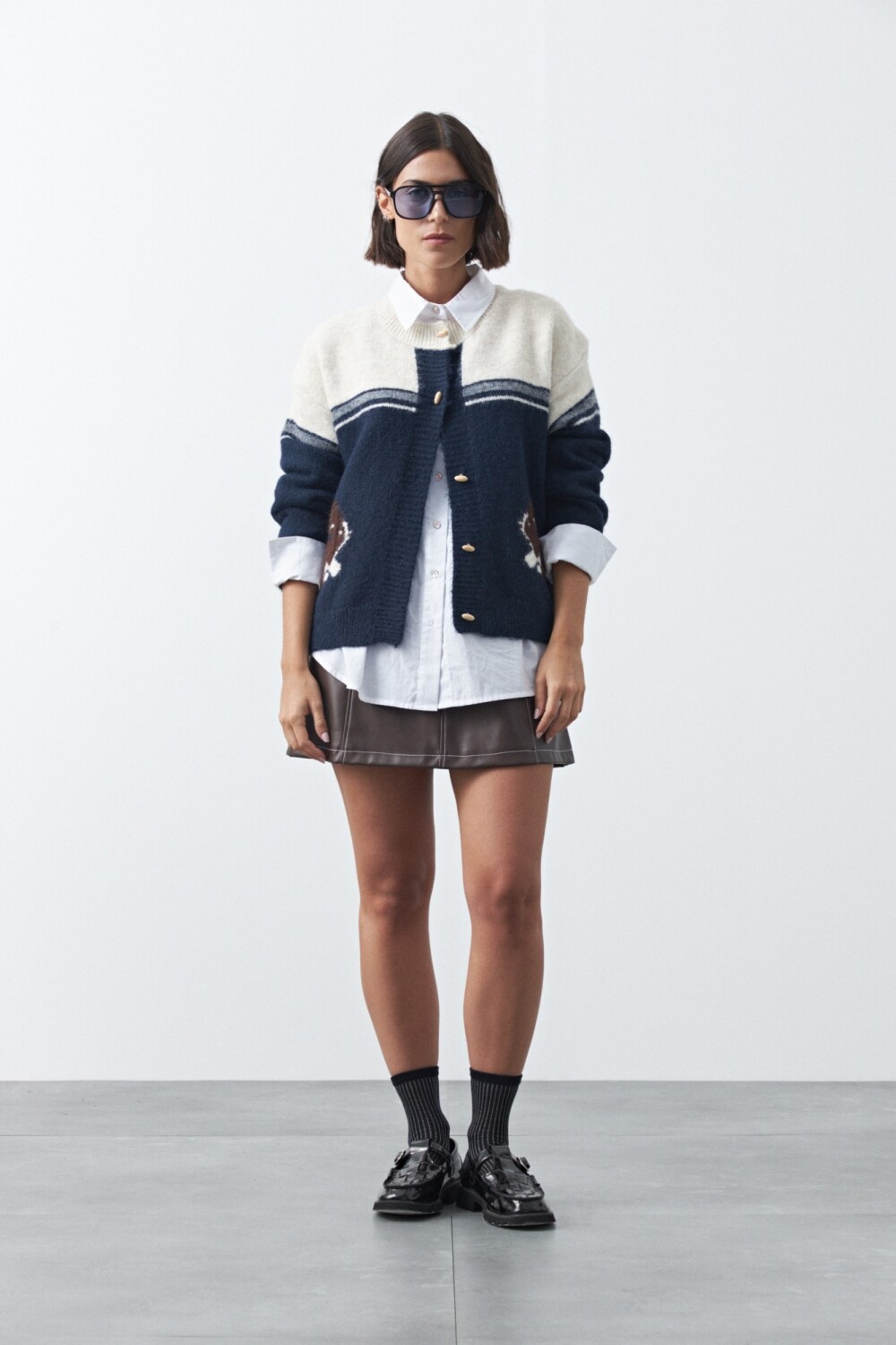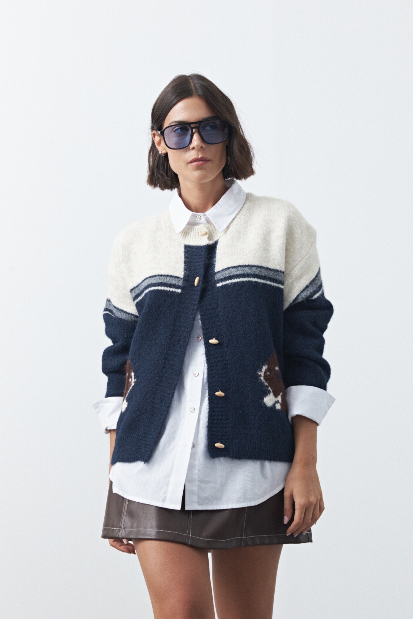Cardigan de tejido jacquard con diseño y detalles de conejitos a los laterales que aportan un toque distintivo y lúdico, ideal para elevar looks cotidianos con un guiño en tendencia. Su silueta relajada con botones al frente y terminaciones suaves lo convierte en una prenda cómoda y versátil para usar en capas.