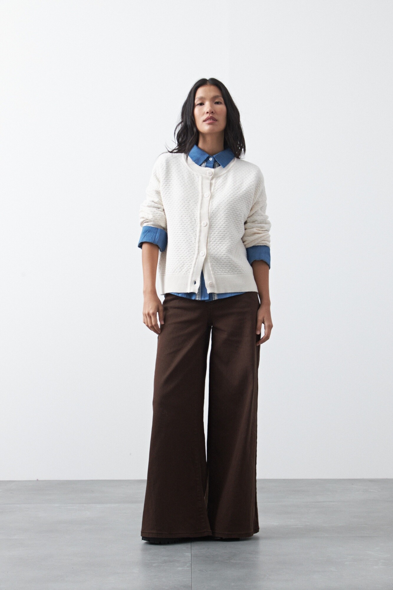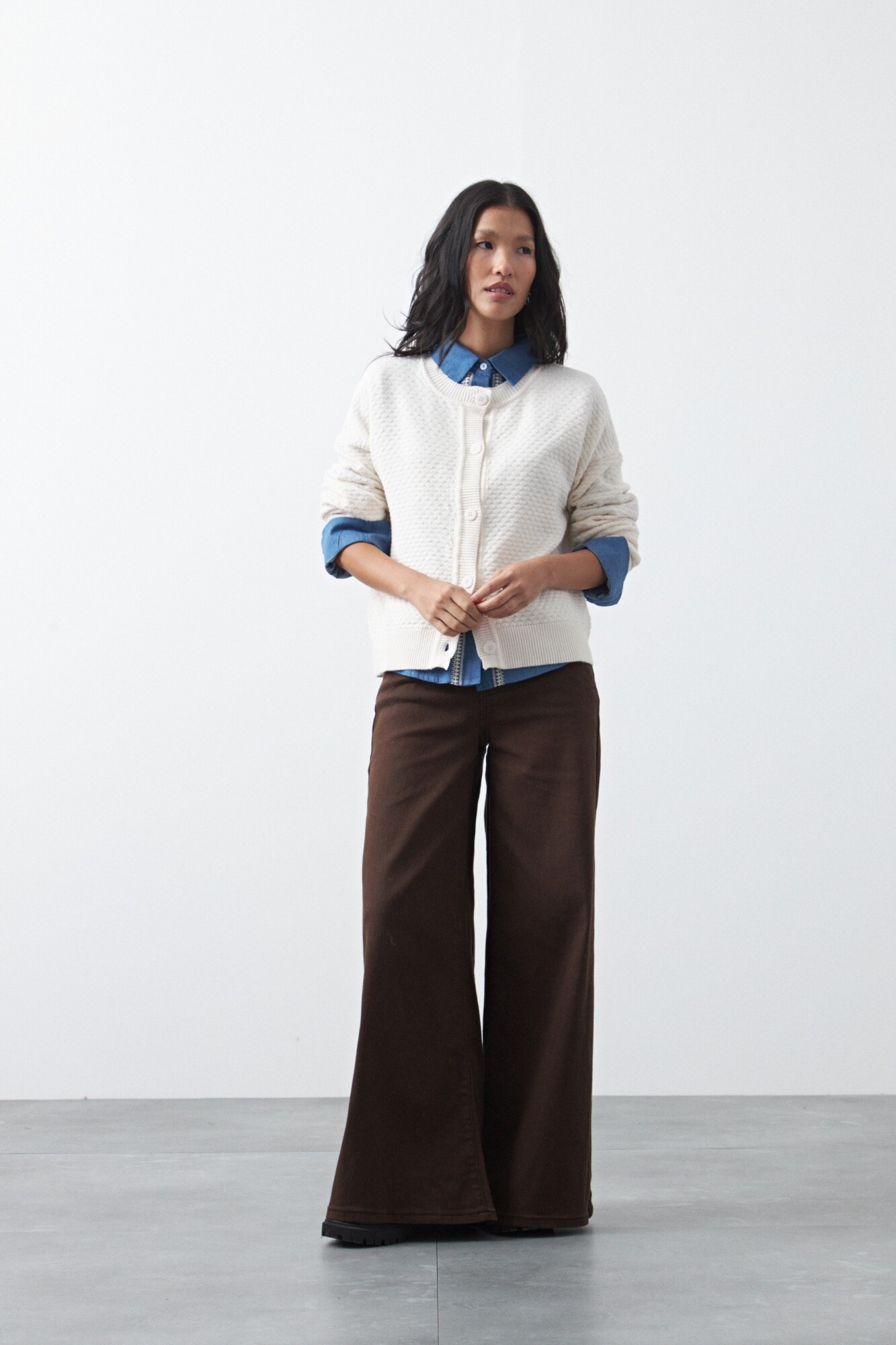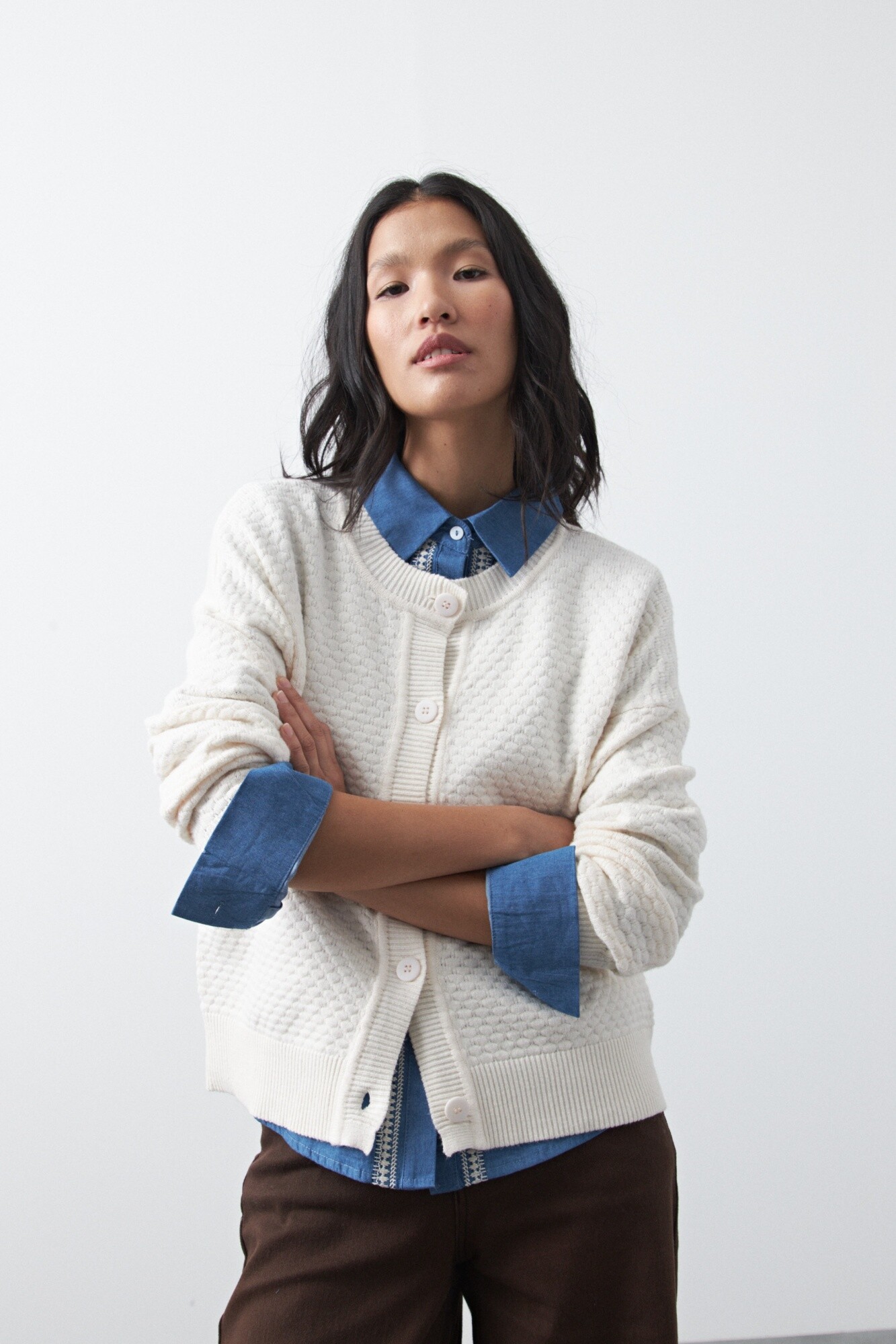 Cardigan de textura tramada con diseño sutil que aporta profundidad visual y una estética moderna. Su silueta relajada lo convierte en una prenda versátil, ideal para sumar a looks de oficina o más descontracturados, funcionando como una capa liviana pero con presencia.