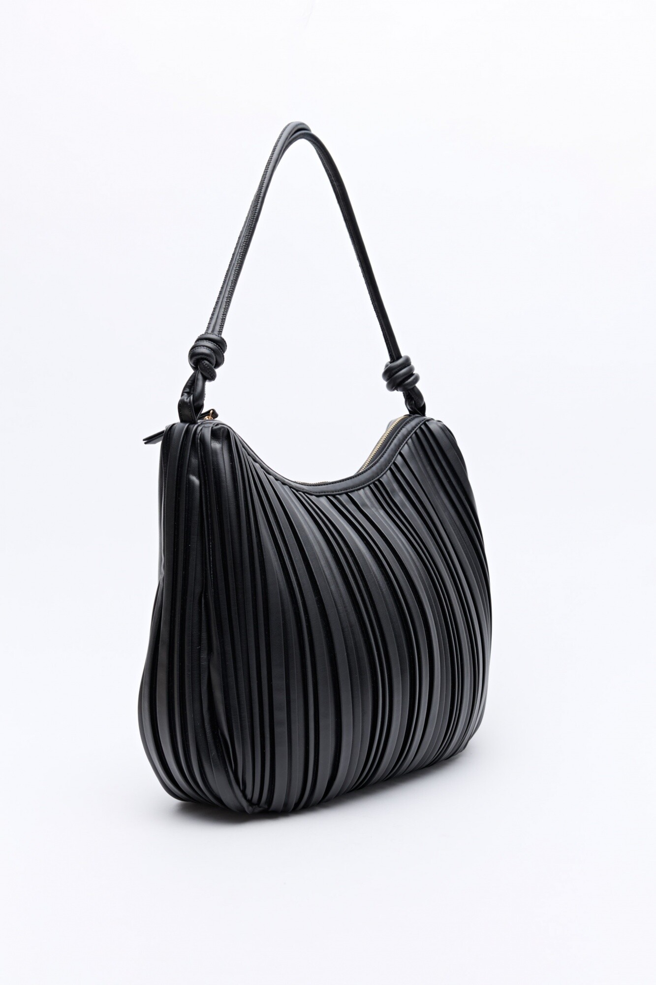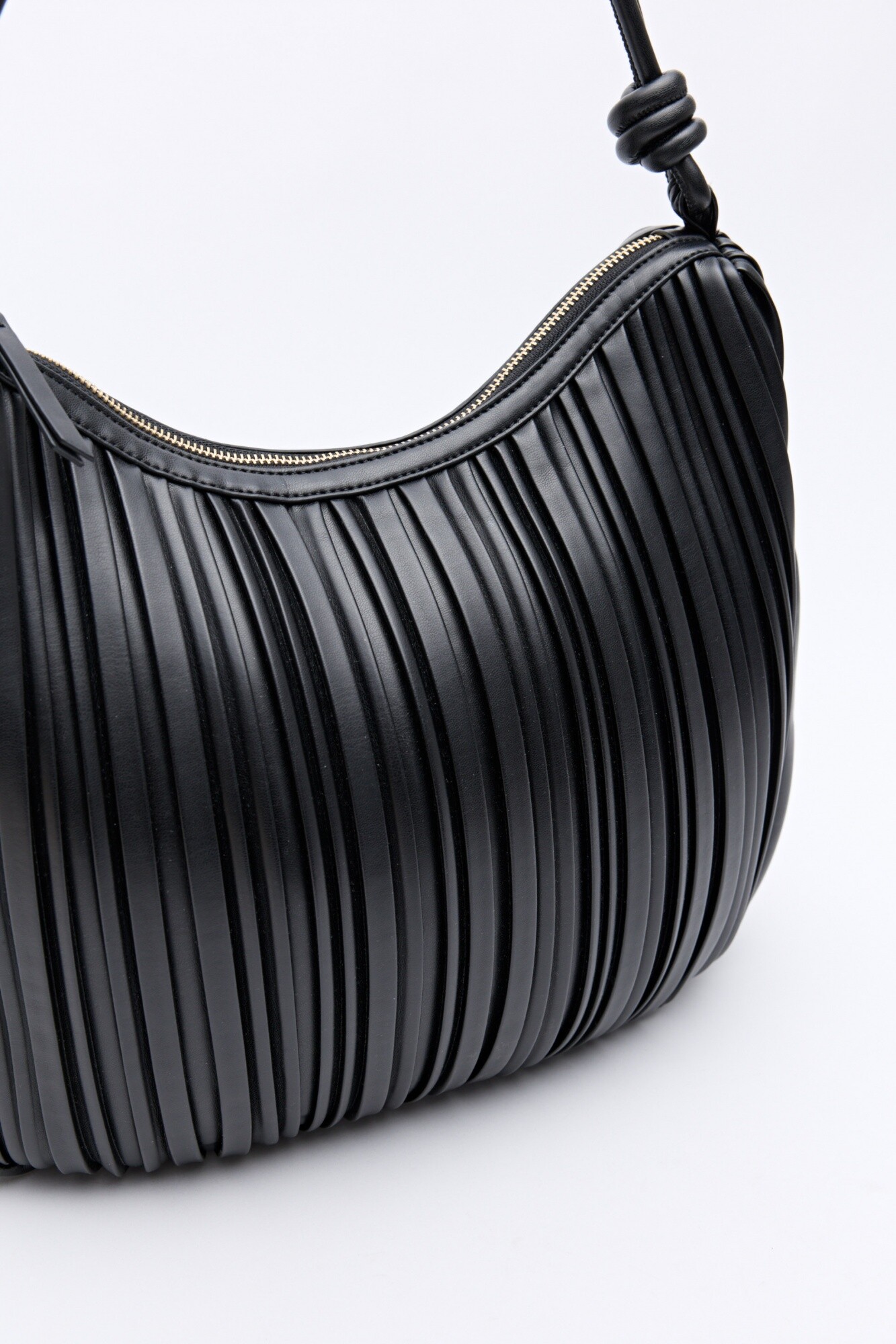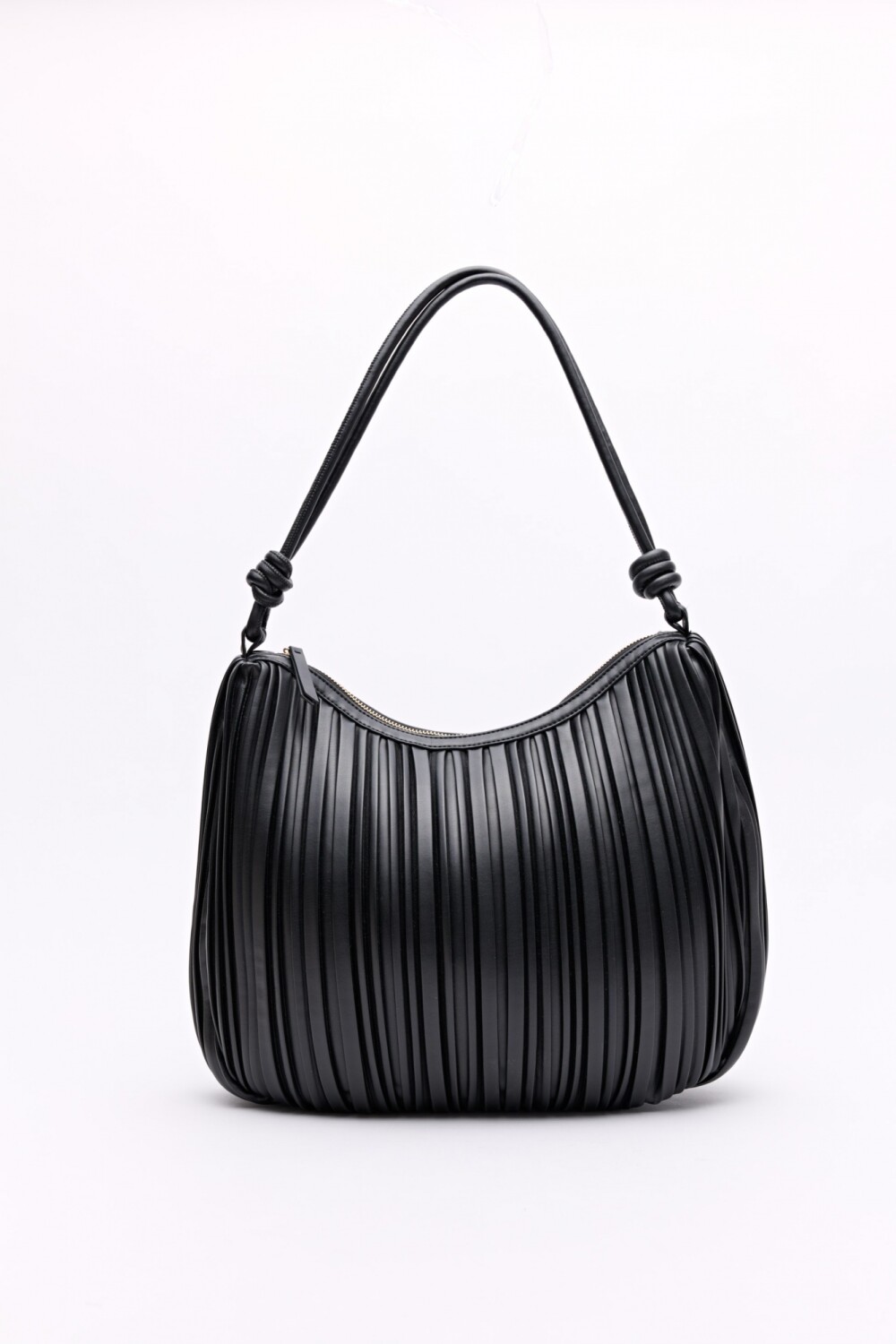 Cartera de hombro con diseño plisado que aporta textura y movimiento, logrando una silueta suave y femenina. Su formato se adapta al cuerpo con naturalidad, mientras que el fruncido vertical estiliza visualmente y suma un detalle en tendencia. Las asas largas con nudos decorativos refuerzan su identidad moderna y la convierten en una pieza versátil, ideal para acompañar looks de día o elevar estilismos más sofisticados sin esfuerzo. Un modelo liviano y funcional, pensado para llevar lo esencial con estilo. Mide 35cm de alto, 9cm de base y 40cm de ancho.