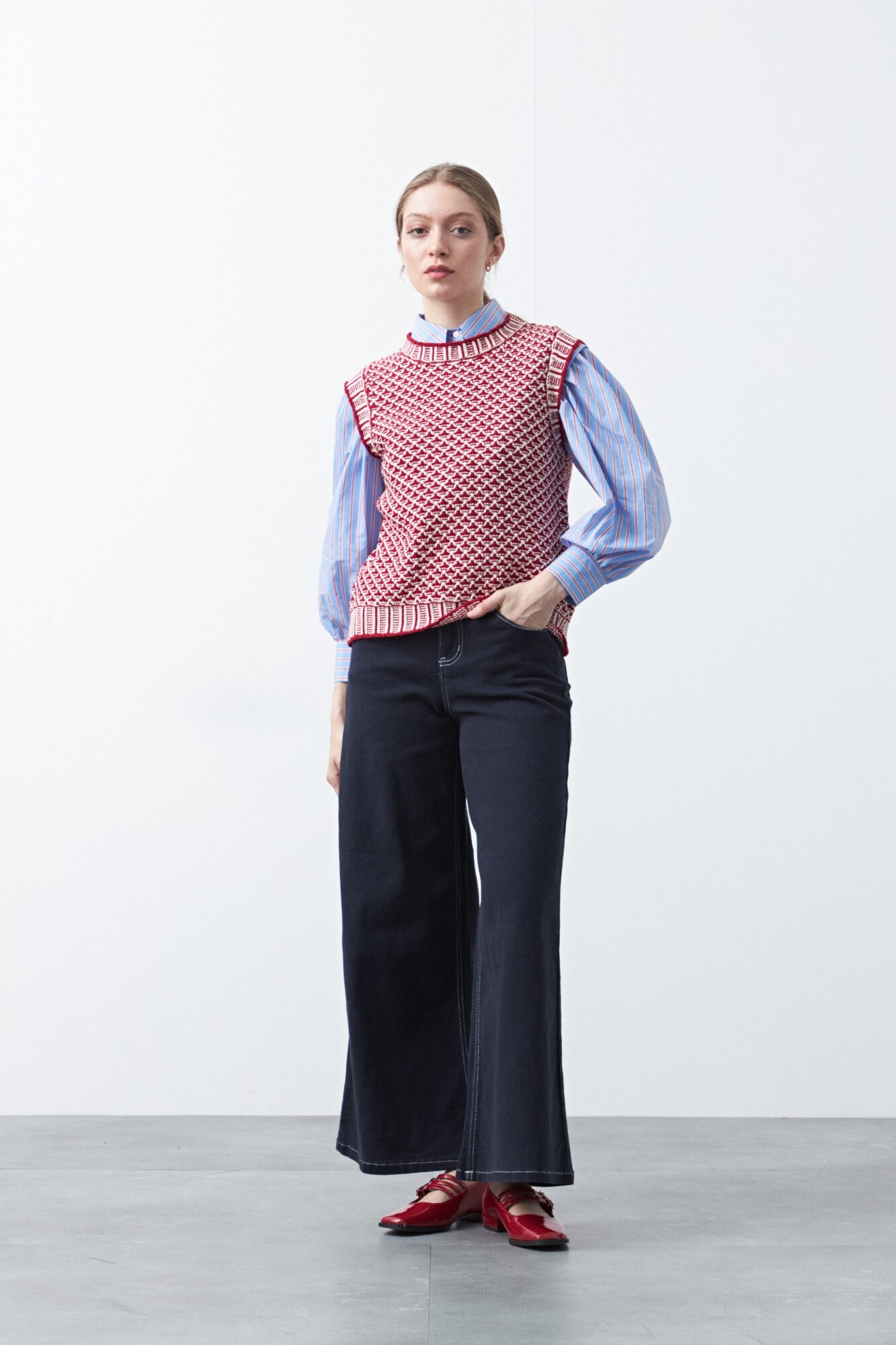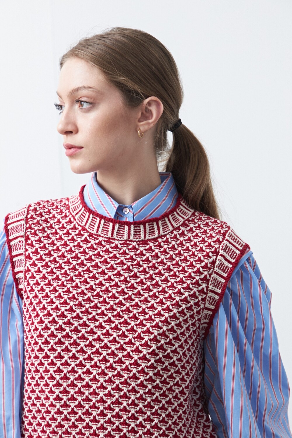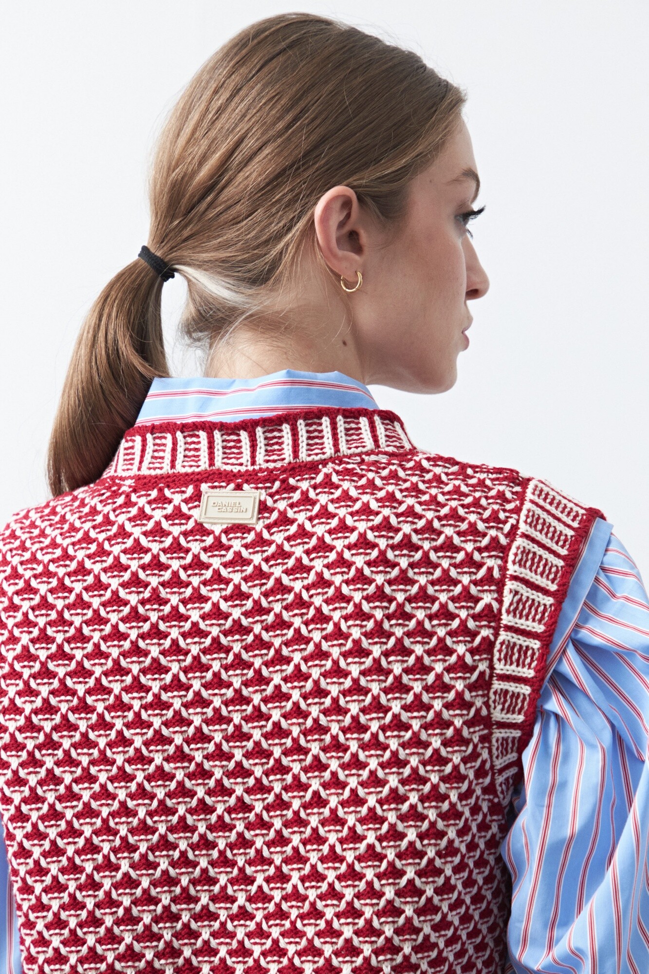 Chaleco tejido de algodón y acrílico, con un trabajo de punto protagonista que aporta textura y carácter a la prenda. El entramado artesanal le da profundidad visual y una impronta cuidada, ideal para sumar interés a looks de base simples. Su diseño sin mangas lo vuelve versátil para superponer sobre camisas o remeras, logrando un estilismo pulido con un guiño contemporáneo. Una pieza con identidad propia que suma abrigo liviano y estilo sin esfuerzo.