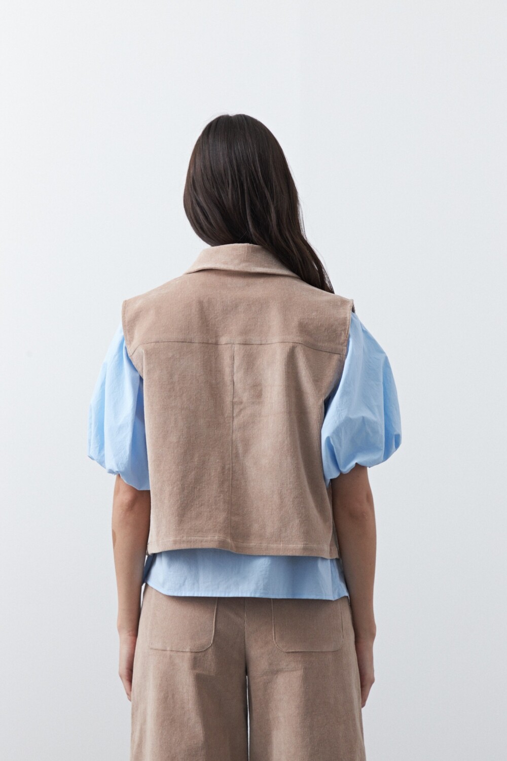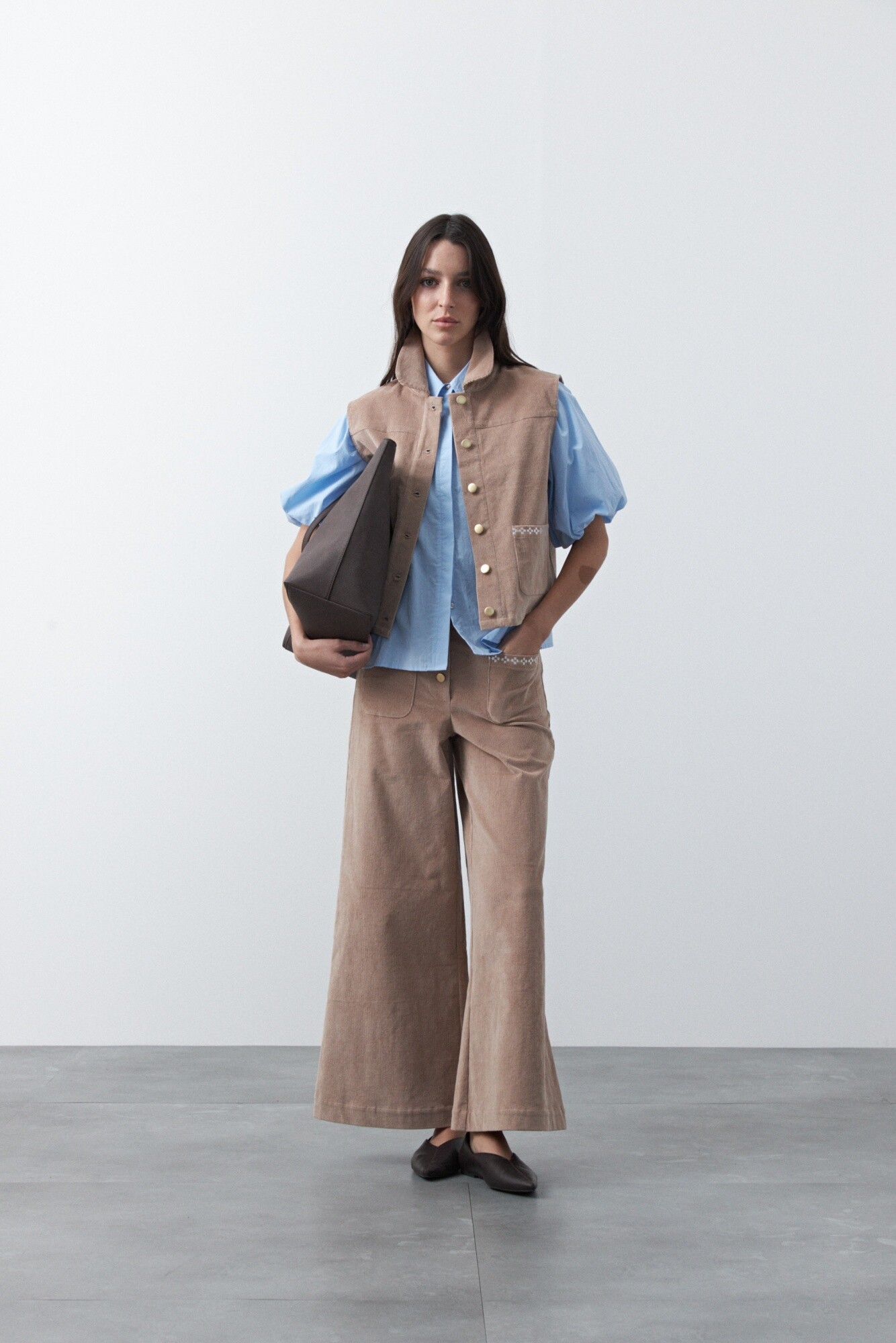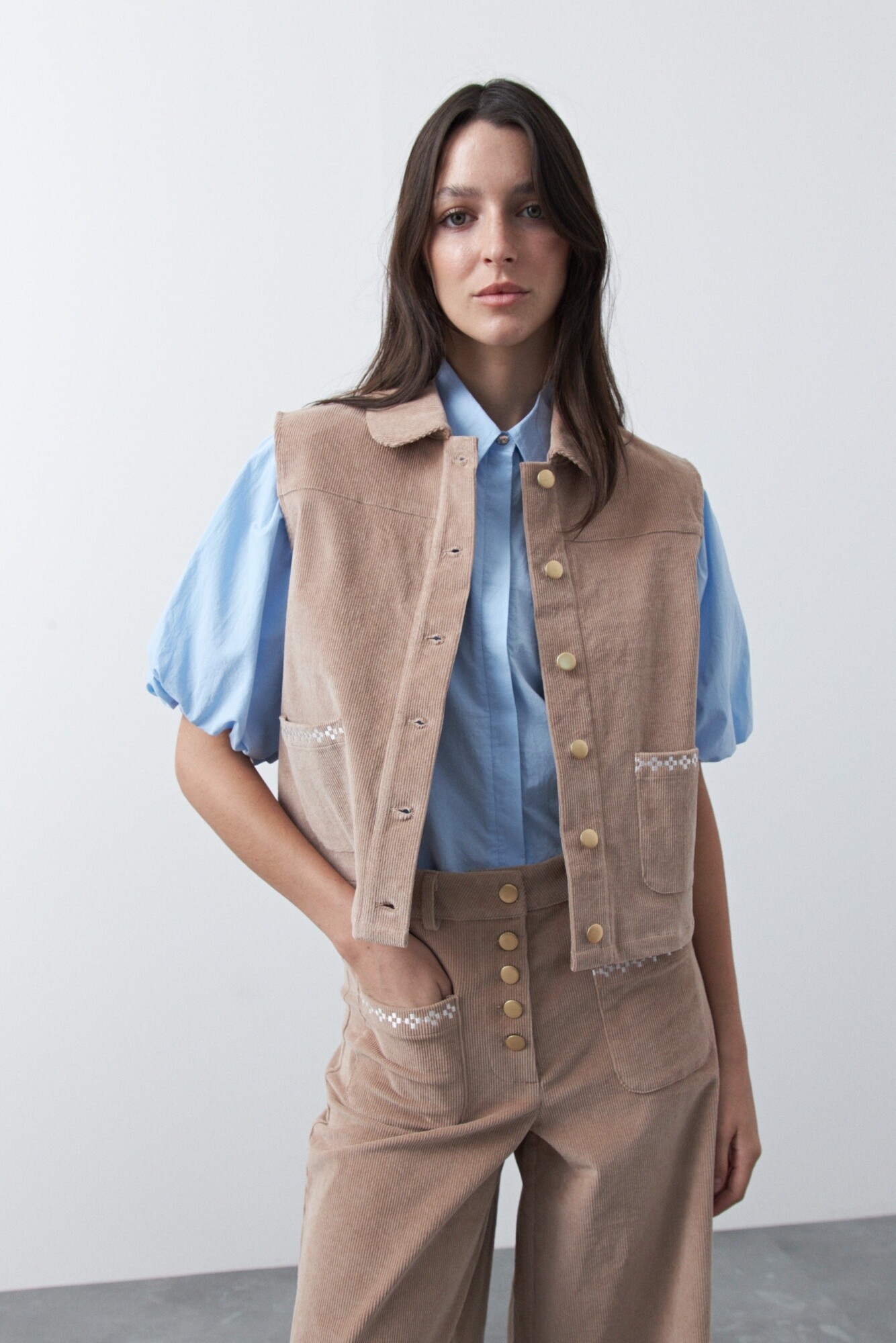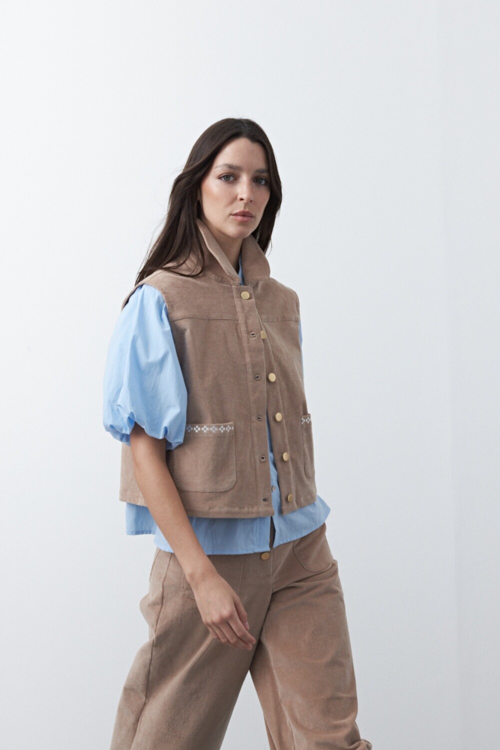 20 Chaleco de pana que aporta estructura y un aire retro actualizado. Los bordados sutiles en los bolsillos suman un detalle diferencial, mientras que la botonadura metálica refuerza su impronta. Ideal para superponer sobre camisas o sweaters livianos y lograr un look en capas con identidad.