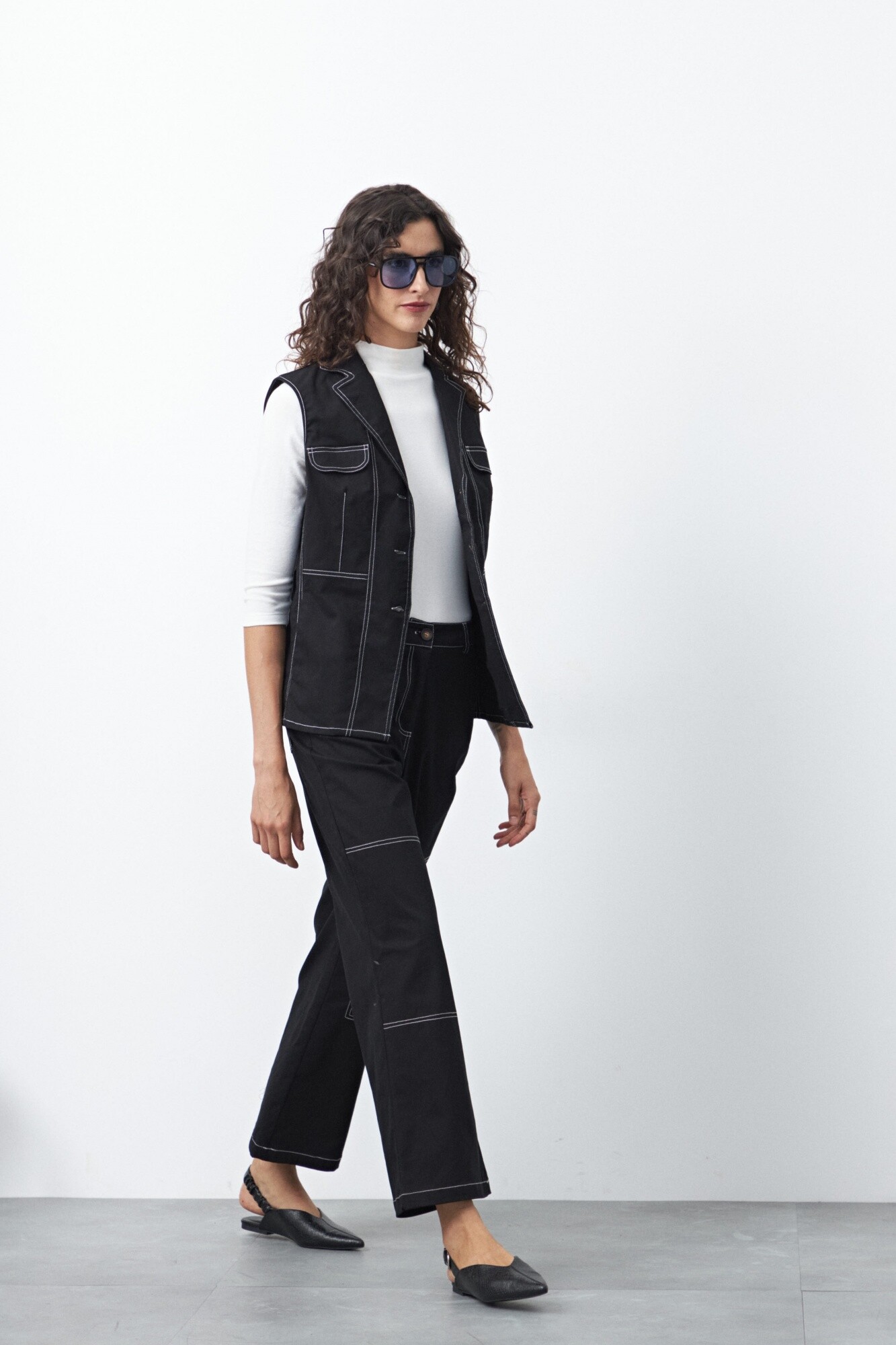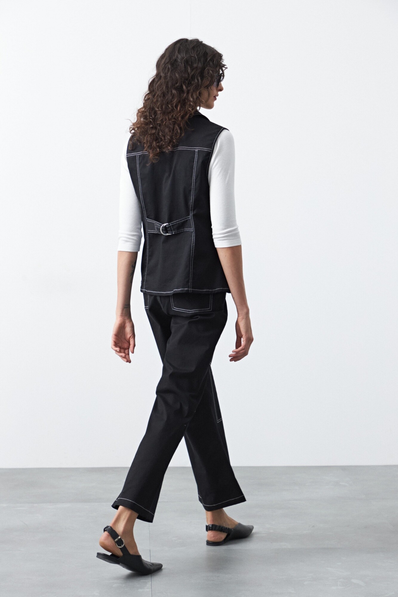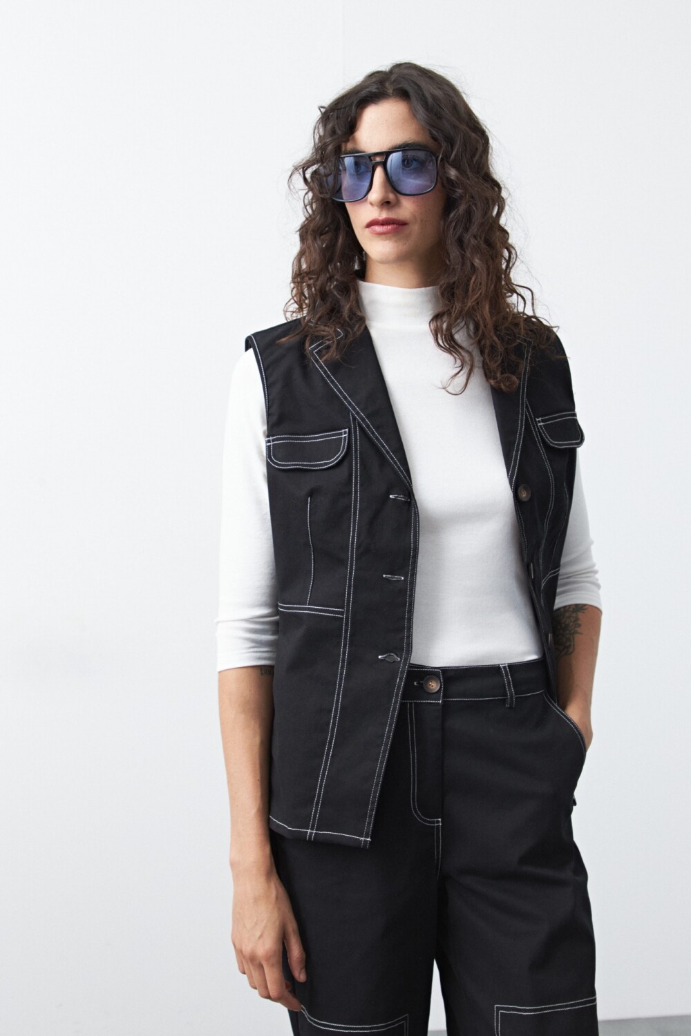 Chaleco con pespuntes a contratono de inspiración utilitaria, una pieza que combina estructura y diseño en una silueta femenina y actual. Su corte sastrero sin mangas, con solapa y botones frontales, aporta un aire sofisticado mientras que los pespuntes marcados refuerzan su impronta moderna.