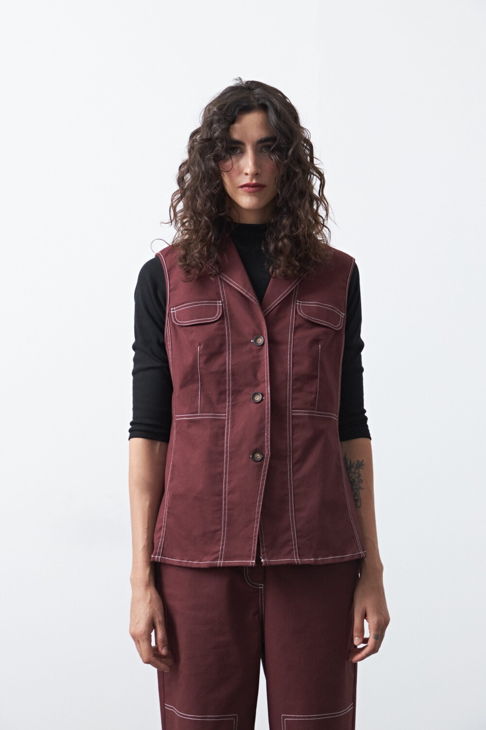 Daniel Cassin CHALECO BERTA CHALECO BERTA Chaleco con pespuntes a contratono de inspiración utilitaria, una pieza que combina estructura y diseño en una silueta femenina y actual. Su corte sastrero sin mangas, con solapa y botones frontales, aporta un aire sofisticado mientras que los pespuntes marcados refuerzan su impronta moderna.