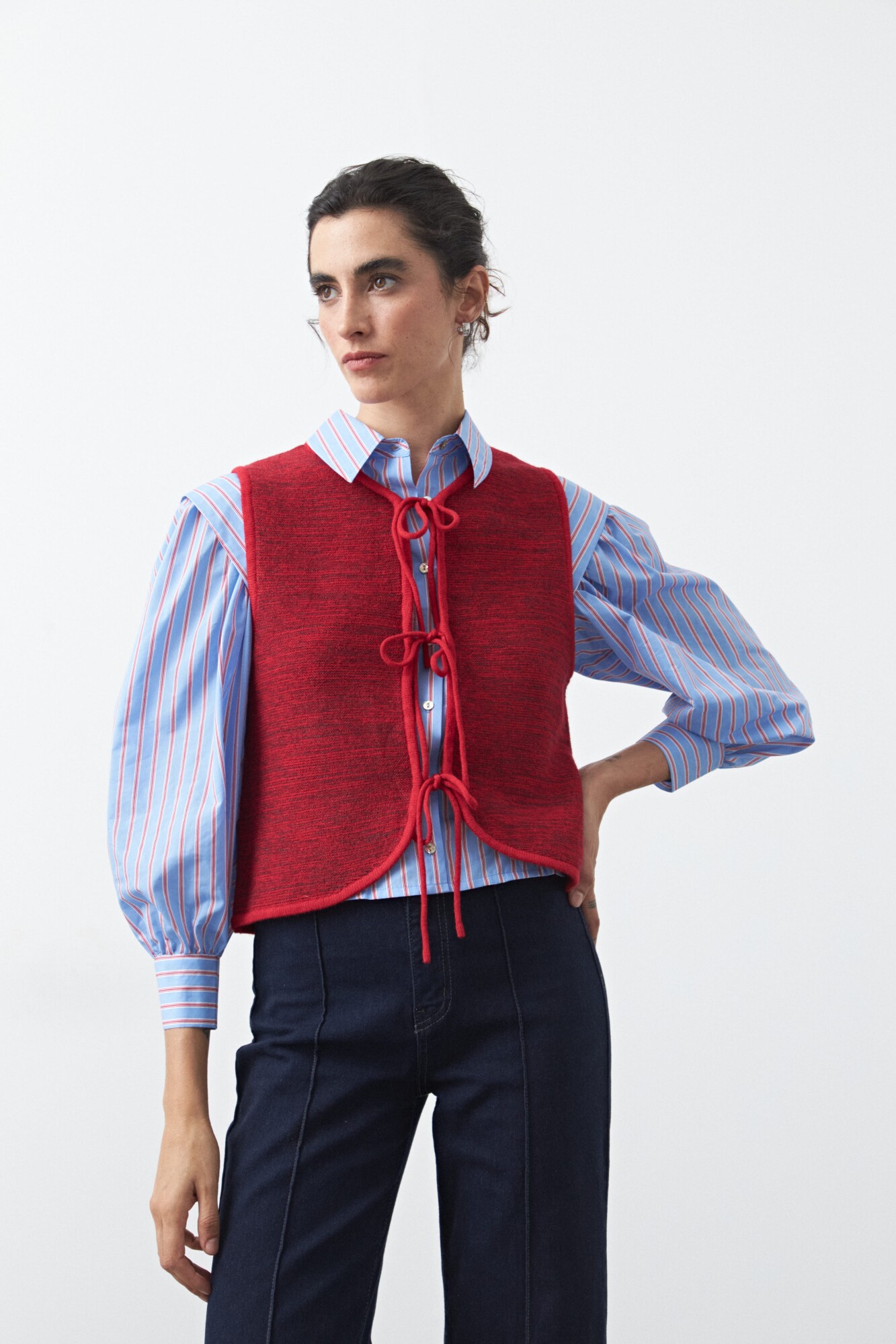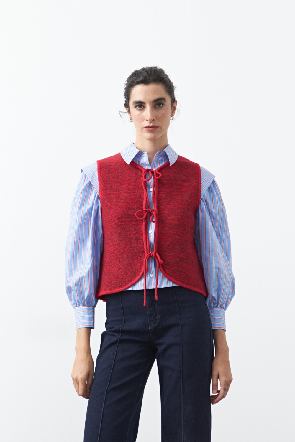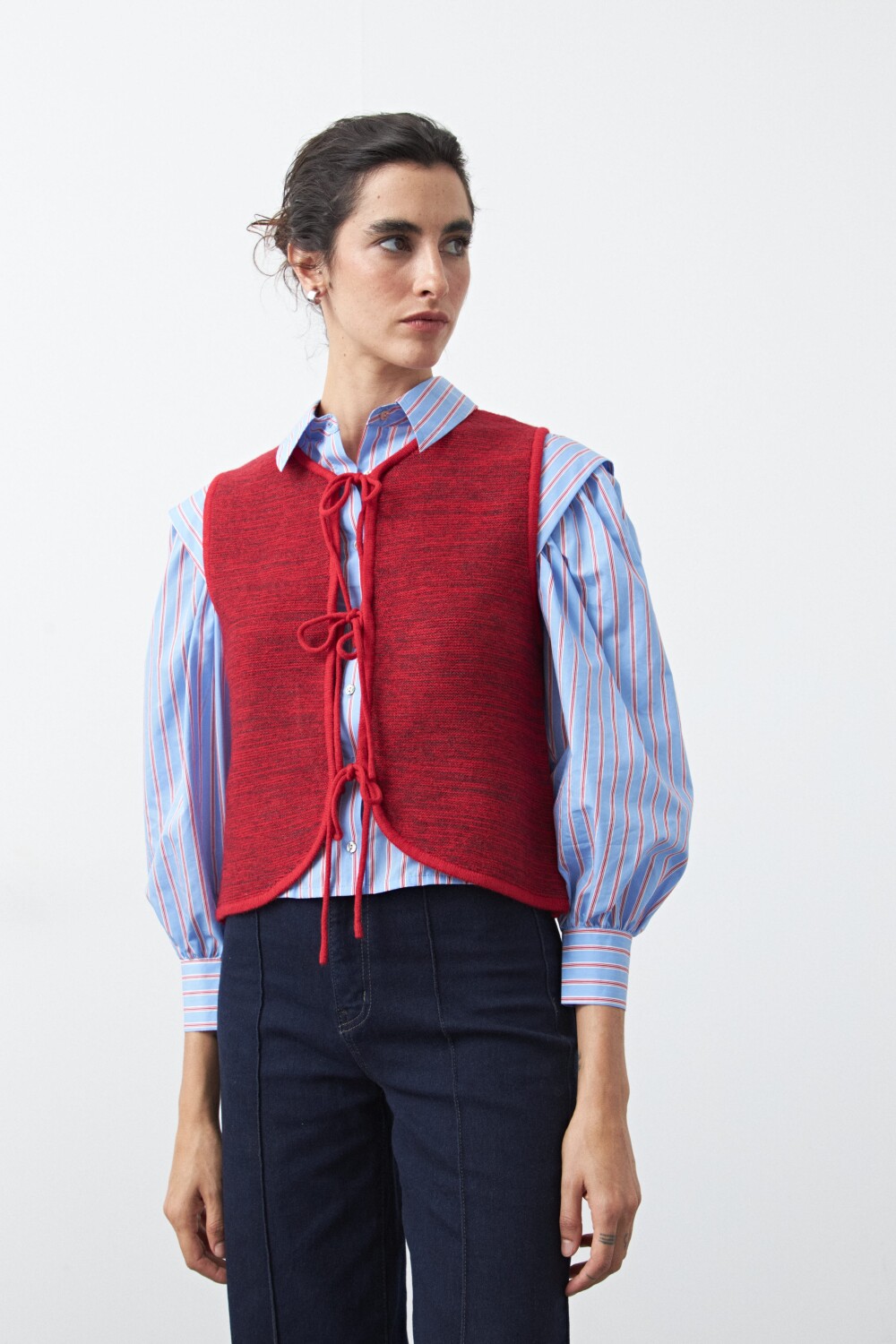 Chaleco tejido con lazos frontales, una pieza versátil que suma textura y profundidad a cualquier estilismo. Su diseño sin mangas y escote redondeado lo convierte en el complemento ideal para superponer sobre camisas, blusas o vestidos, aportando un guiño clásico con aire actual.