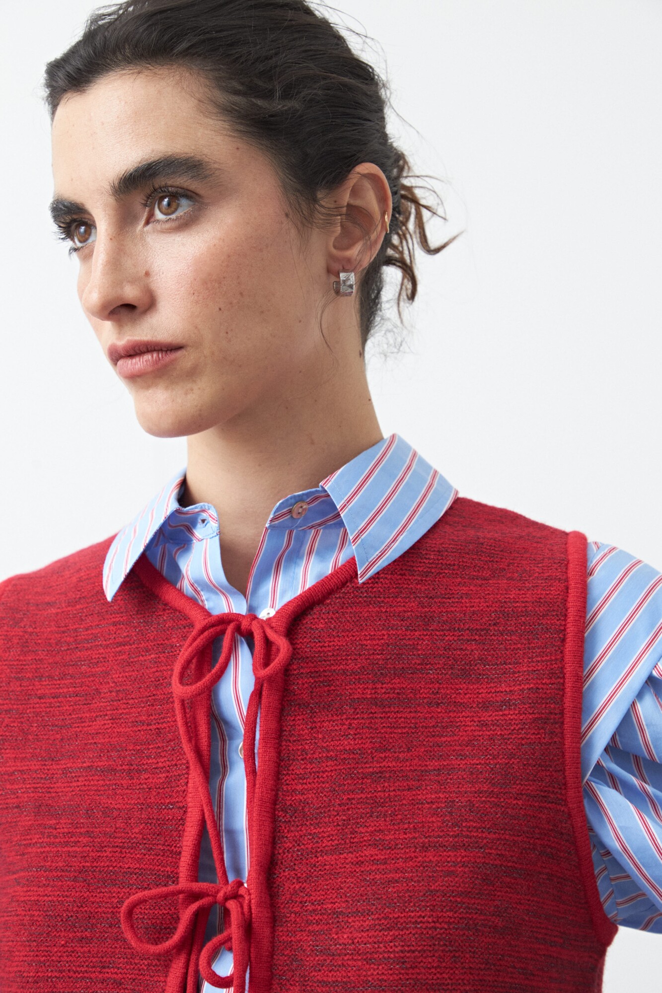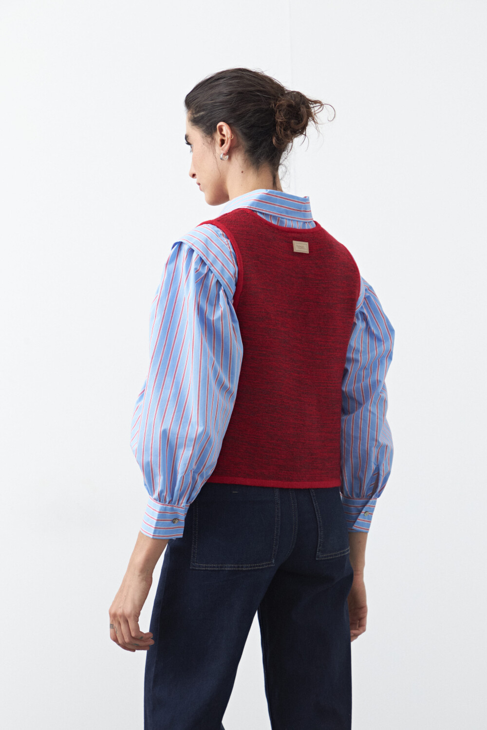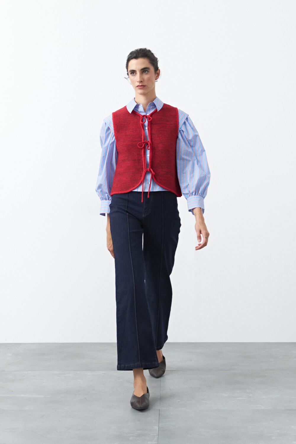 Chaleco tejido con lazos frontales, una pieza versátil que suma textura y profundidad a cualquier estilismo. Su diseño sin mangas y escote redondeado lo convierte en el complemento ideal para superponer sobre camisas, blusas o vestidos, aportando un guiño clásico con aire actual.