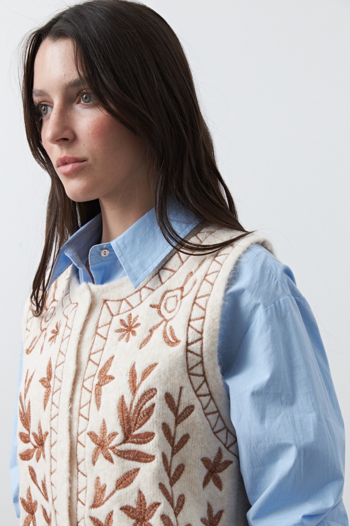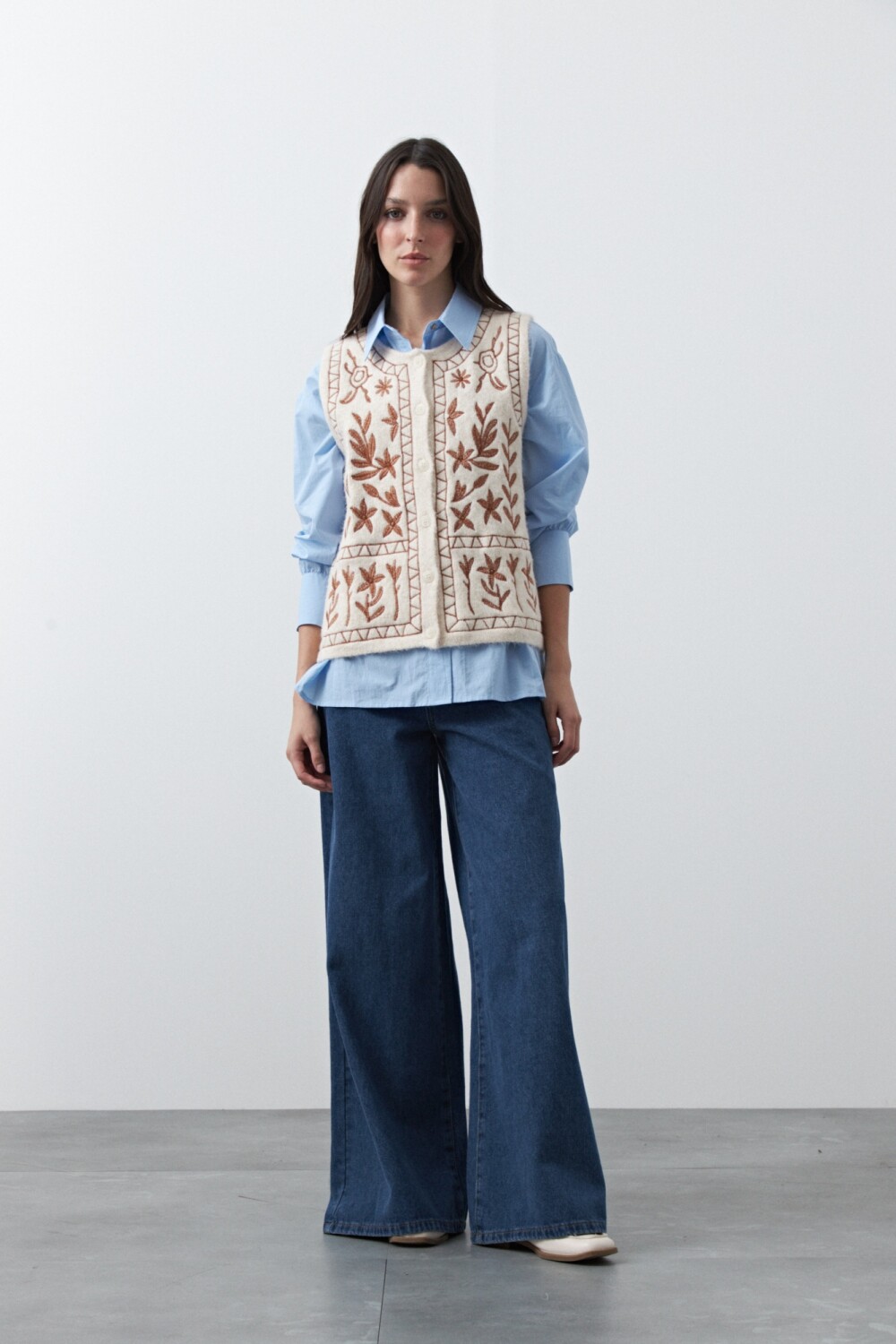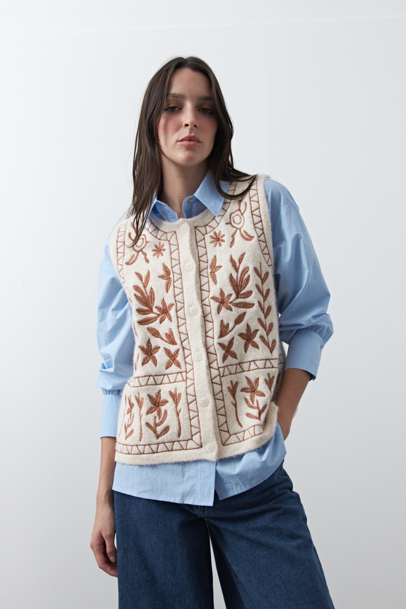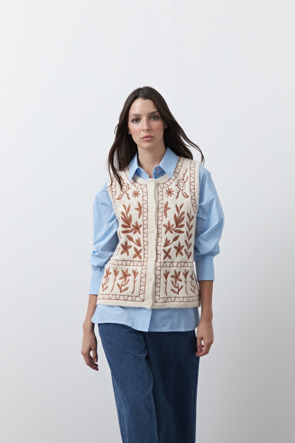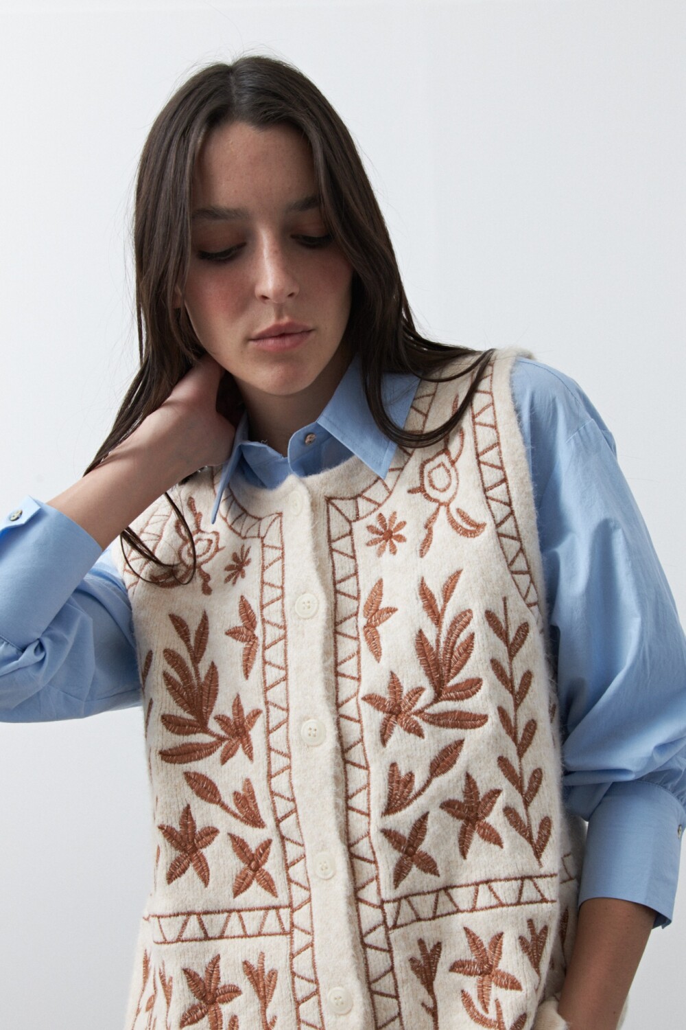 20 Chaleco tejido bordado con motivos artesanales que realzan la prenda y aportan un aire distintivo. Su textura suave y su diseño sin mangas lo convierten en una opción versátil para superponer con camisas, logrando un look cuidado y en tendencia, ideal para elevar cualquier outfit.