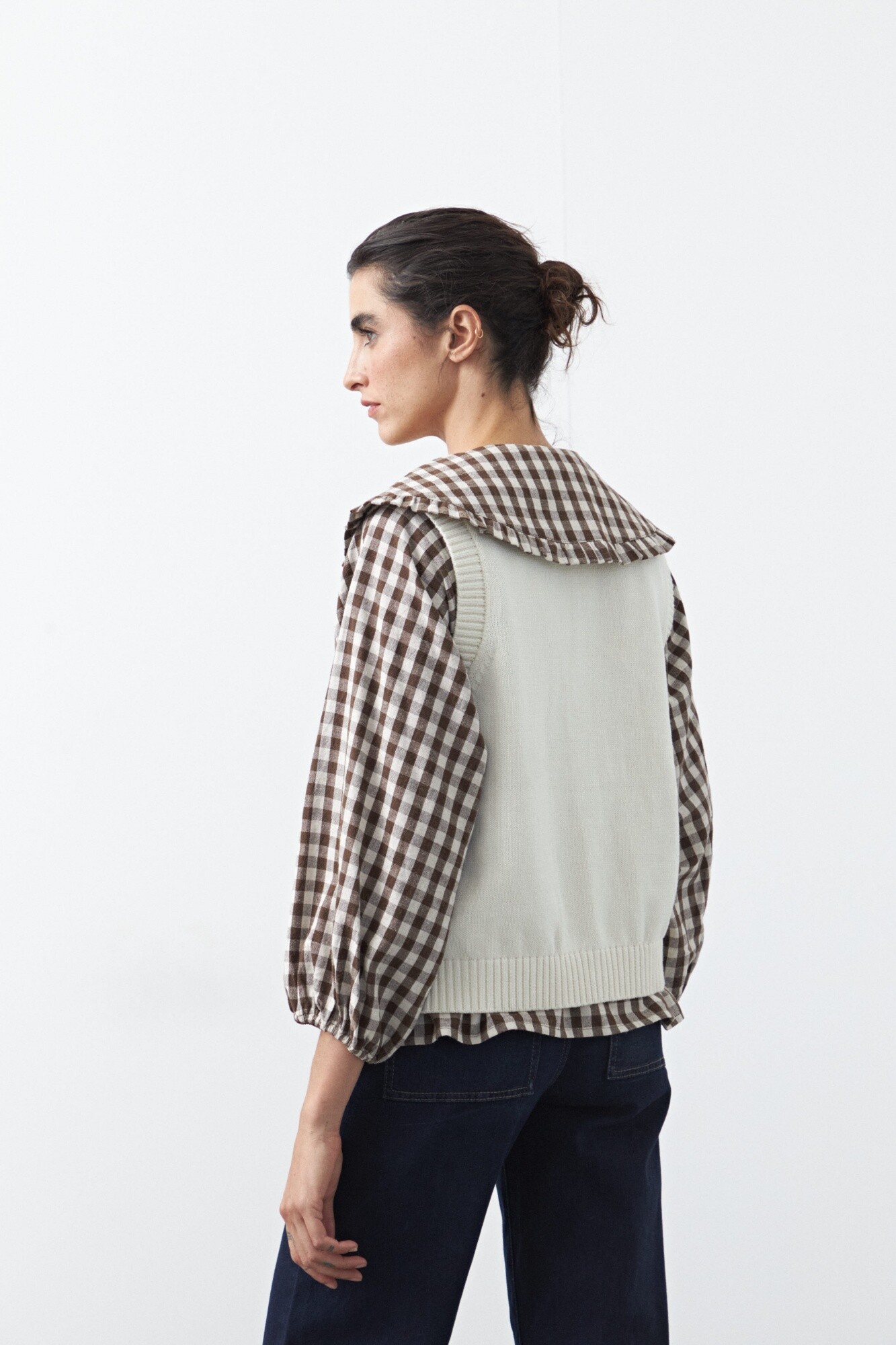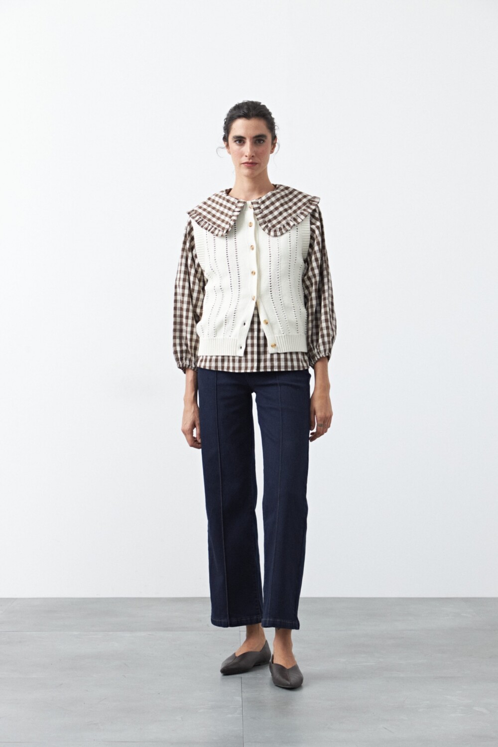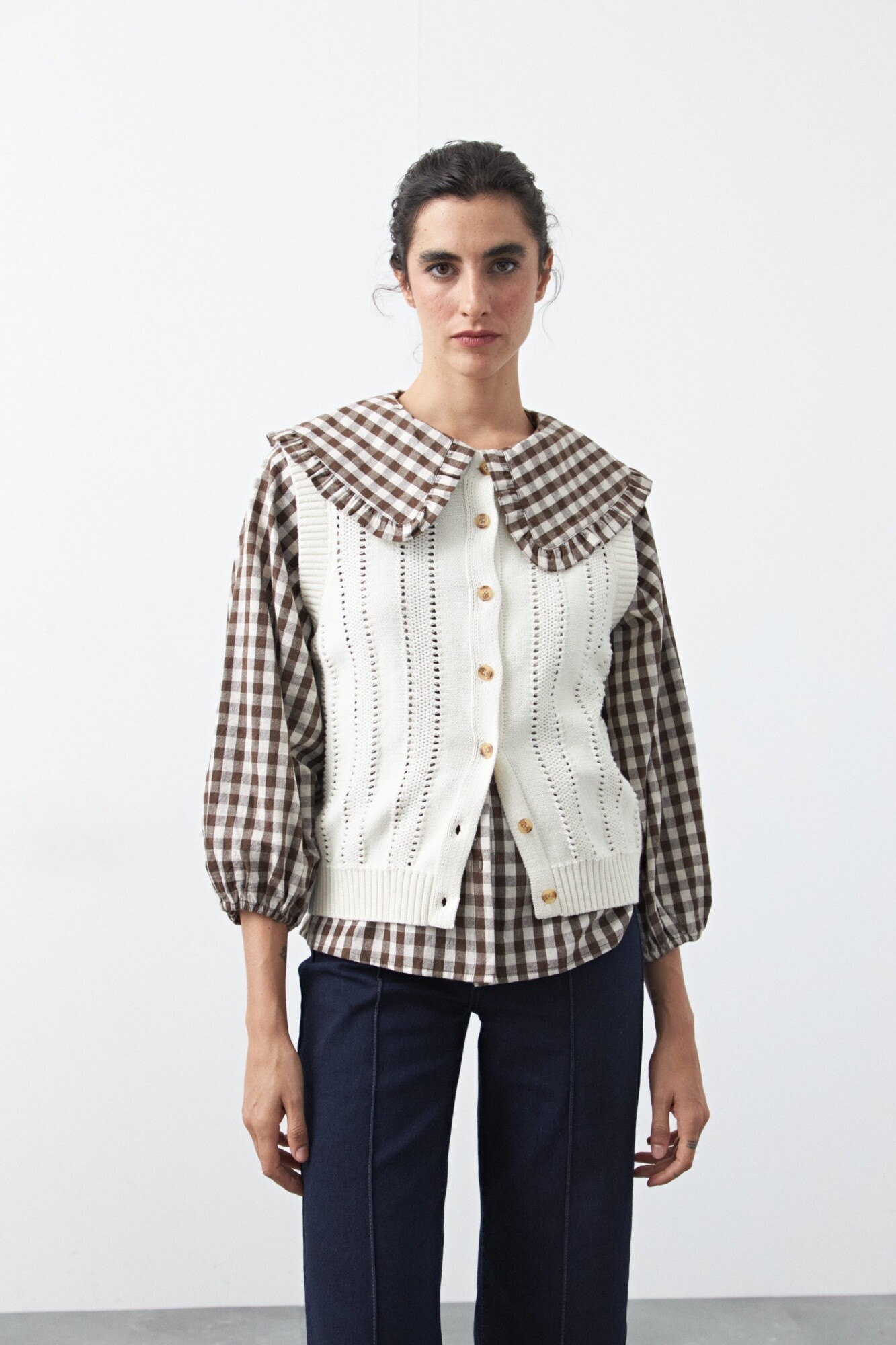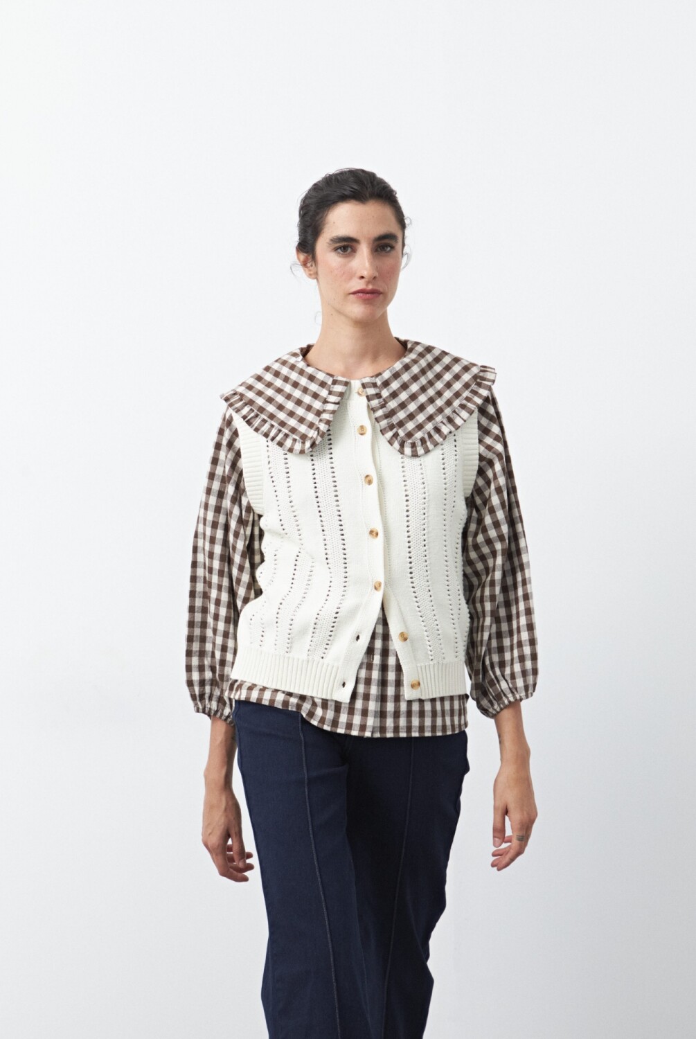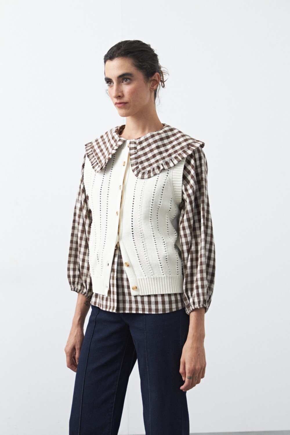 Chaleco tejido de algodón con diseño clásico y detalles de tejido calado que aportan textura y profundidad visual. Su moldería recta lo vuelve fácil de superponer sobre camisas o blusas, logrando un look prolijo y actual, ideal para estilismos de oficina o propuestas más relajadas. El tejido de algodón suma confort y respirabilidad, mientras que la botonadura frontal refuerza su impronta atemporal.