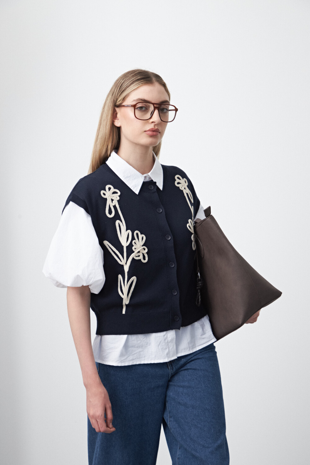 Chaleco tejido con bordado aplicado que suma textura y diseño a cualquier look. Su estructura liviana permite usarlo solo o en capas, aportando un detalle protagonista sin perder versatilidad. El bordado de inspiración orgánica realza la prenda y la convierte en una opción ideal para combinar con camisas, blusas o prendas básicas, logrando un estilismo cuidado y actual, clave para elevar cualquier look.