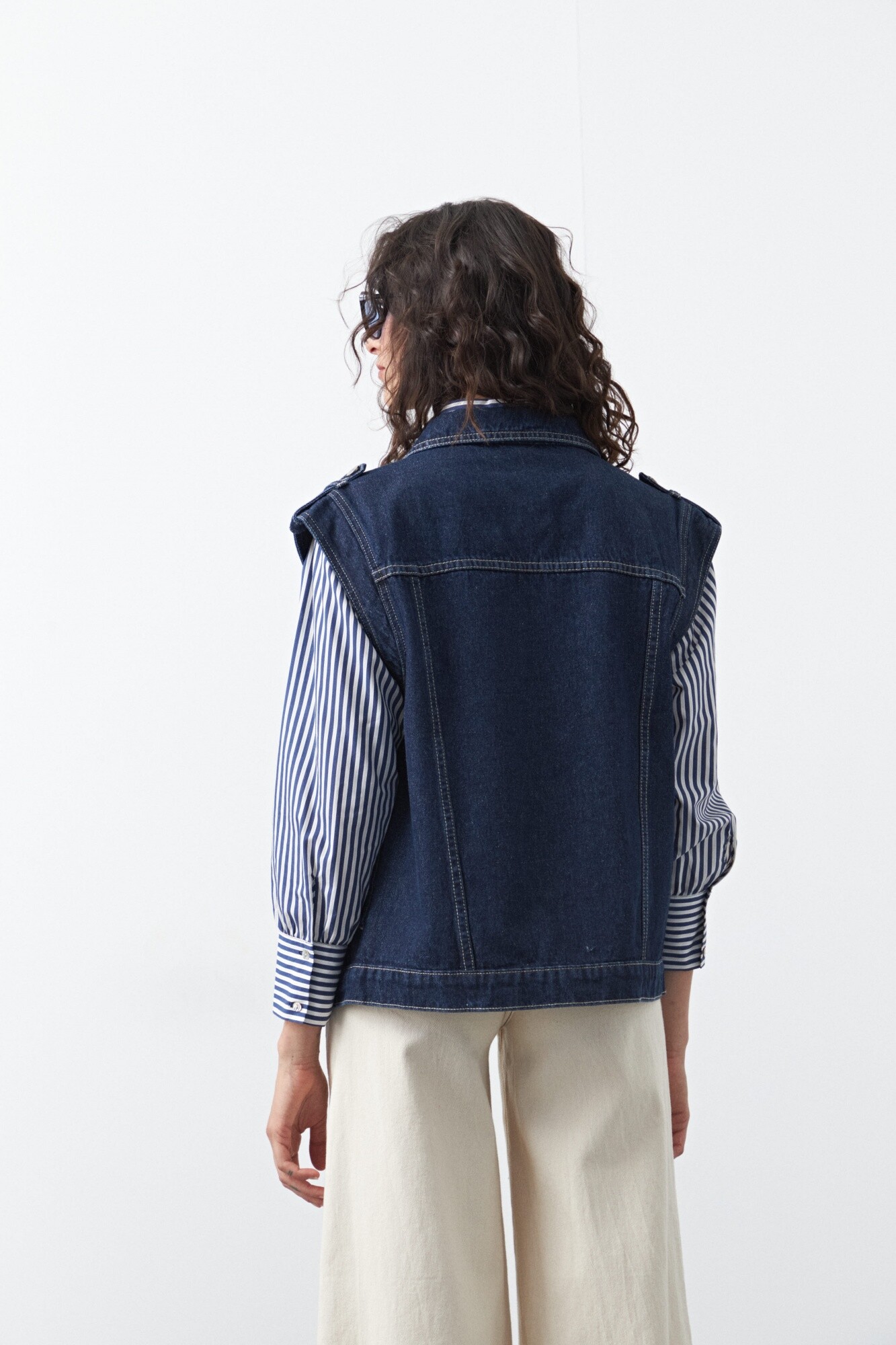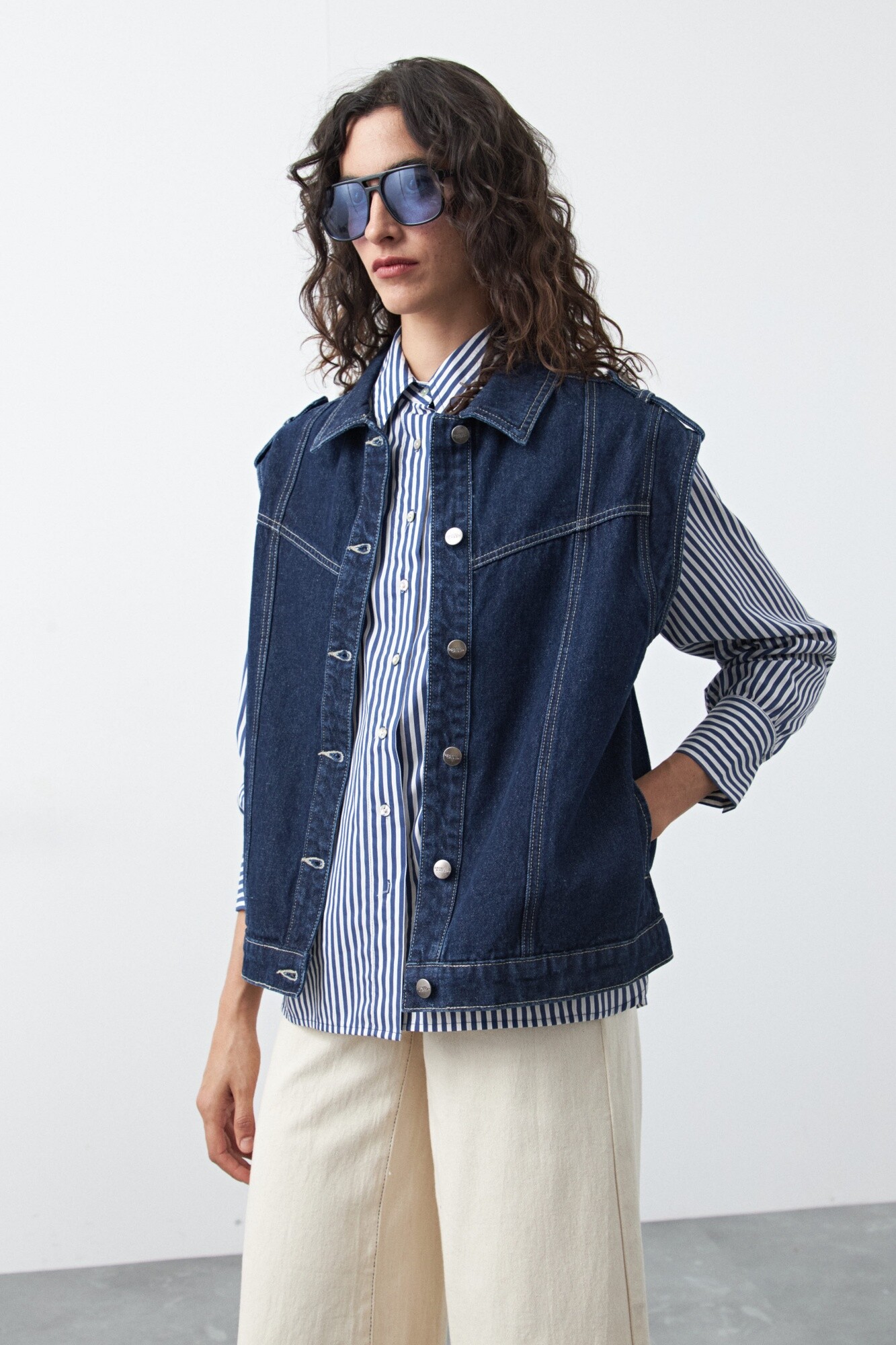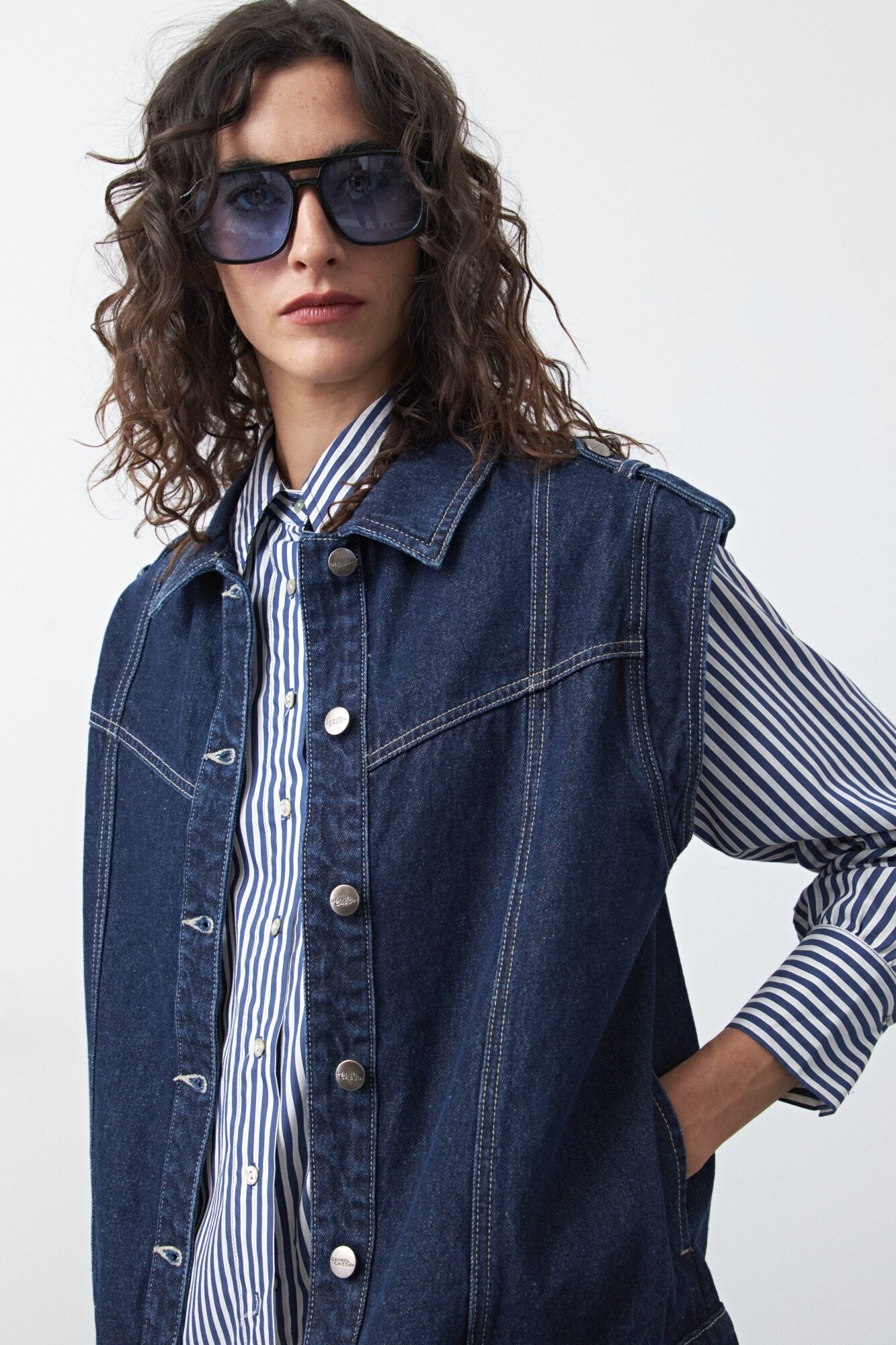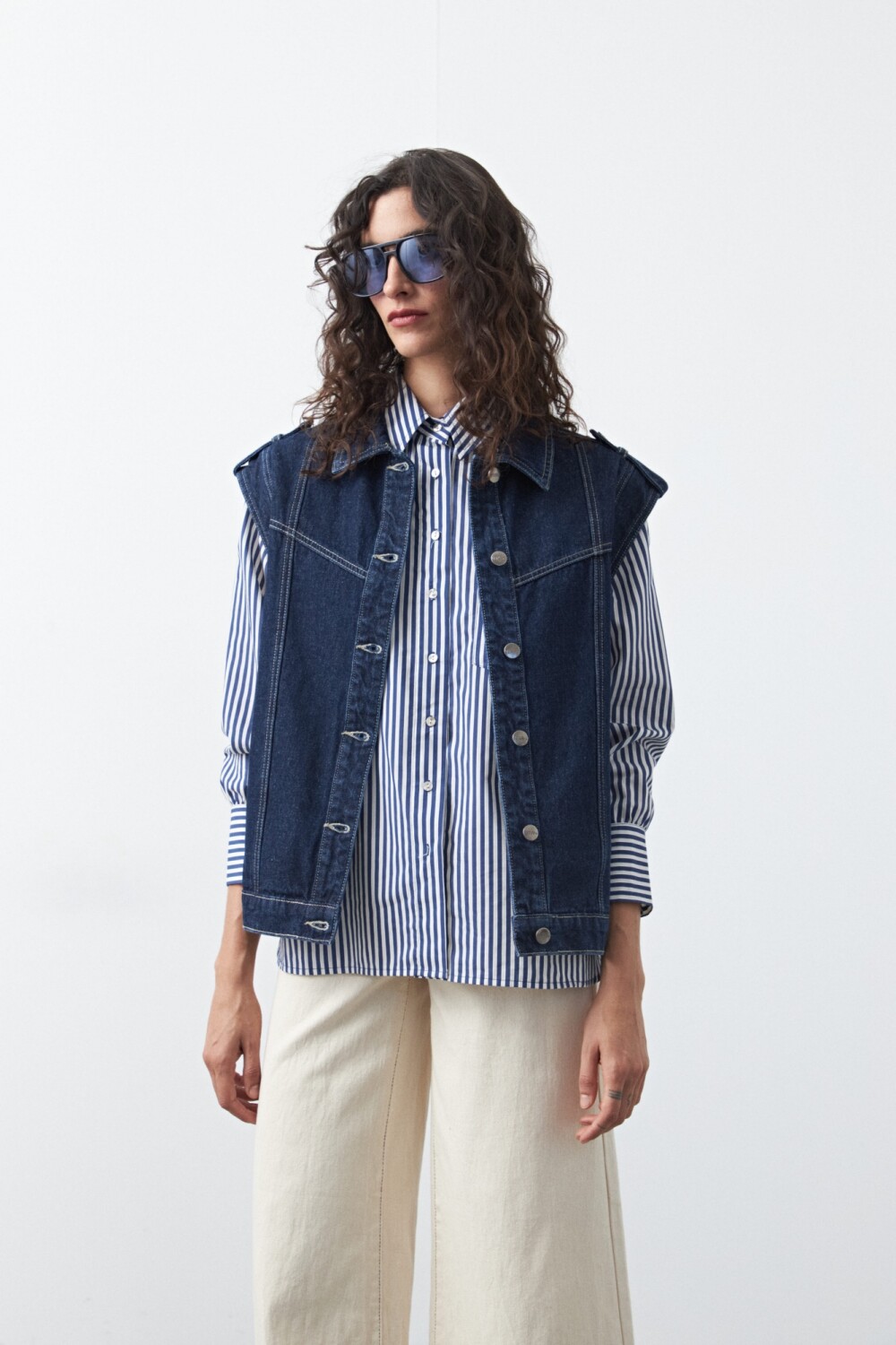 Chaleco de jean de silueta recta, una prenda versátil que reinterpreta el clásico denim en una versión moderna y fácil de combinar. Su diseño sin mangas permite superponerlo sobre camisas, sweaters o remeras, sumando textura y carácter a cualquier look. El frente con botones metálicos y las costuras visibles refuerzan su estética denim tradicional, mientras que el calce cómodo lo convierte en una opción práctica