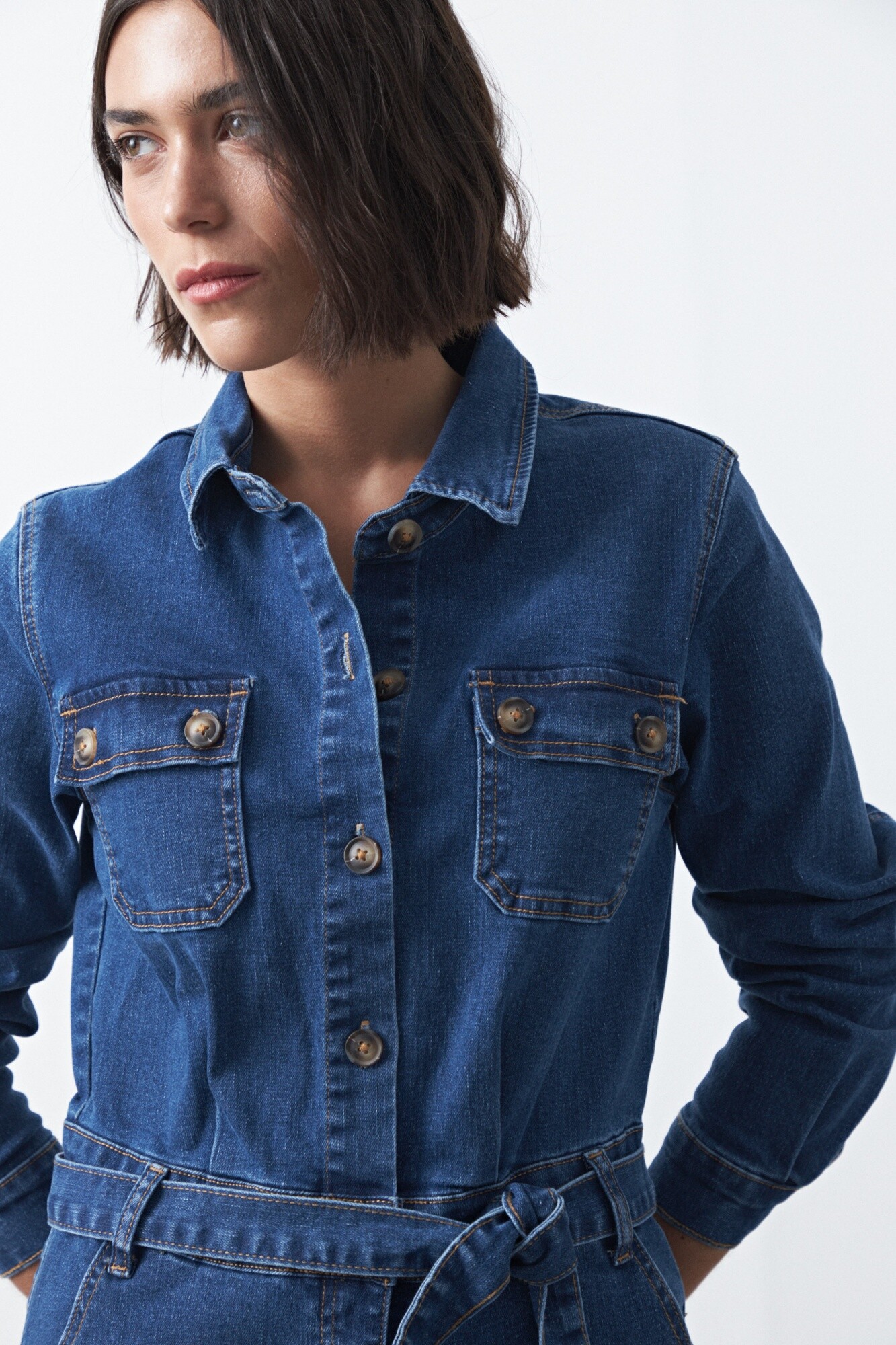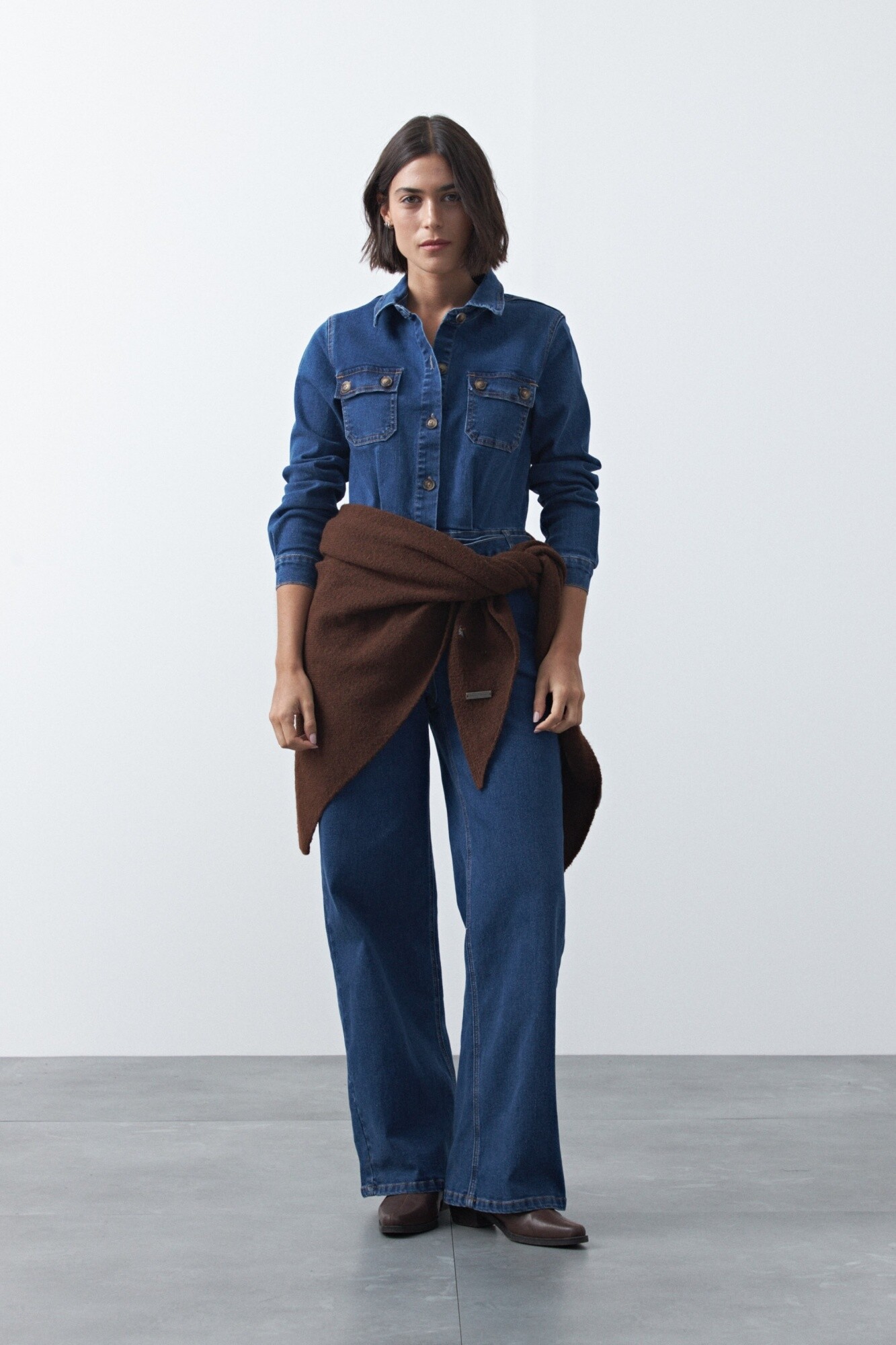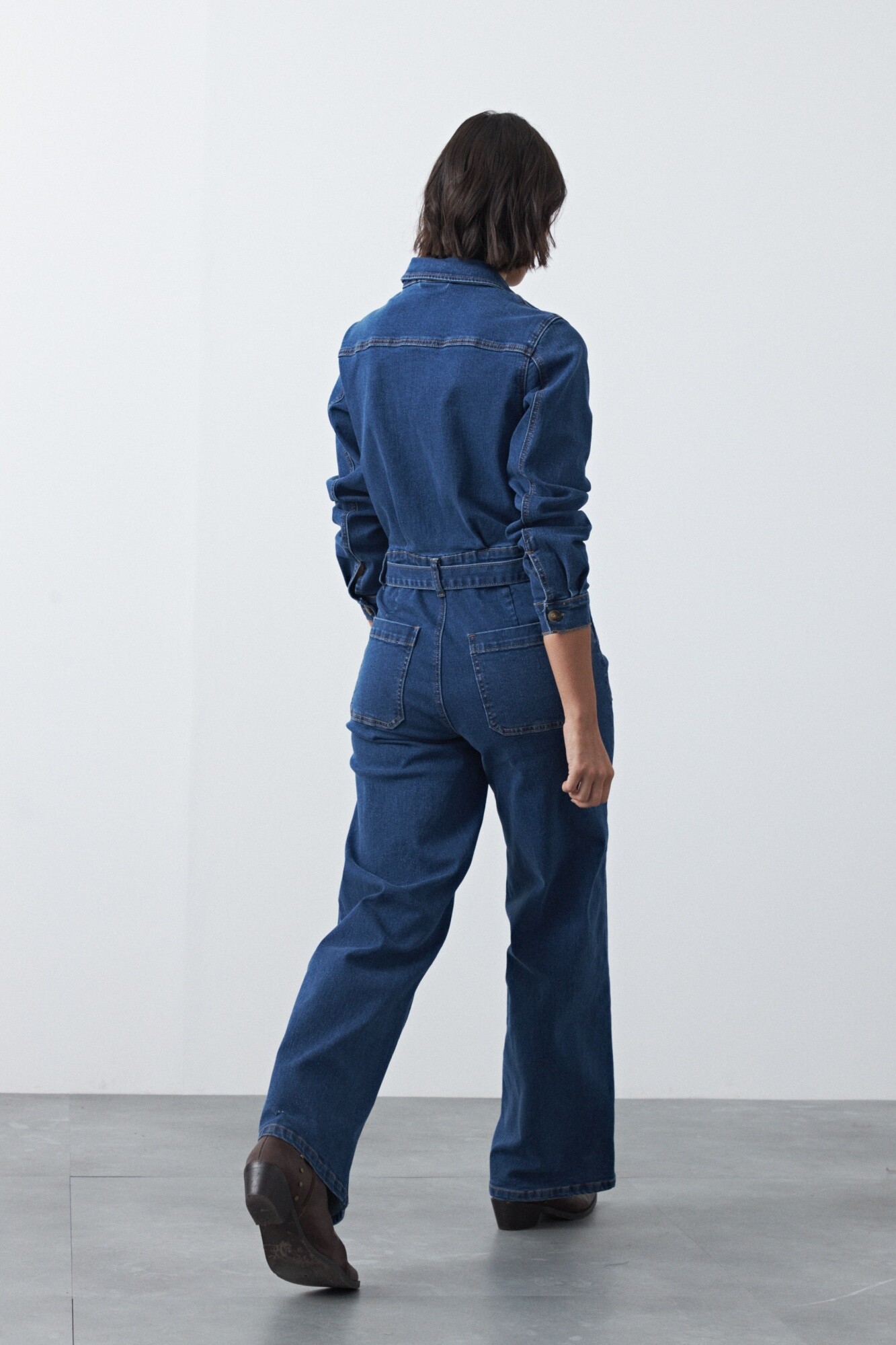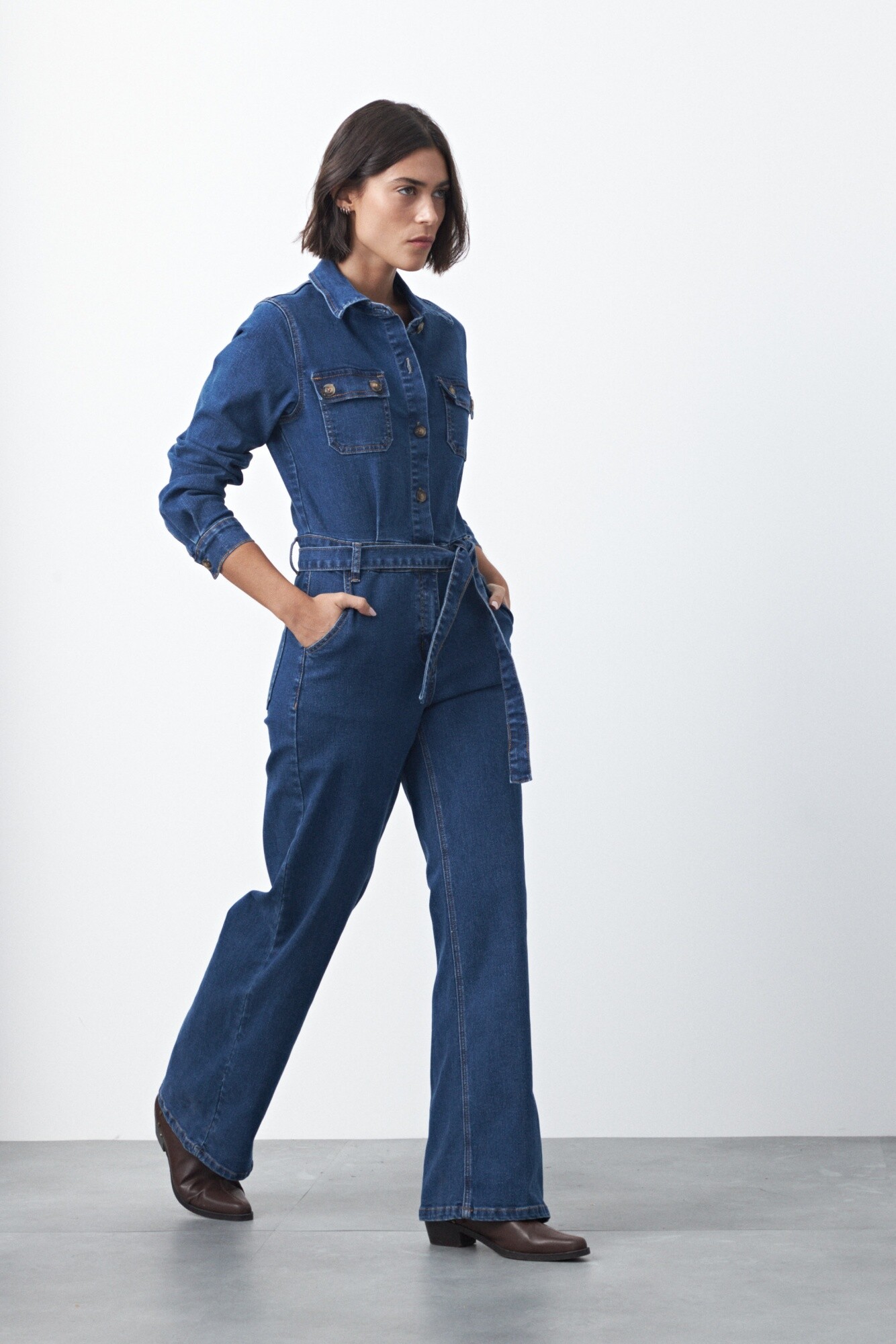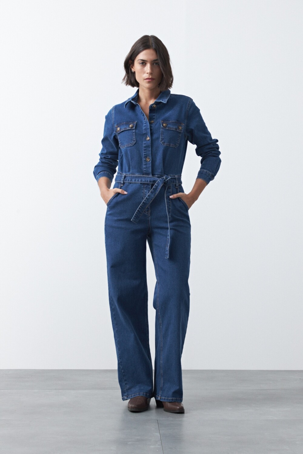 Enterito de jean de silueta recta con piernas amplias que estilizan y aportan un aire moderno. El diseño con bolsillos frontales, cierre con botones y cinturón del mismo tejido permite ajustar la cintura y definir la figura. De manga larga y estructura cómoda, es una prenda versátil que funciona tanto para looks casuales como para opciones más elevadas según cómo se combine.