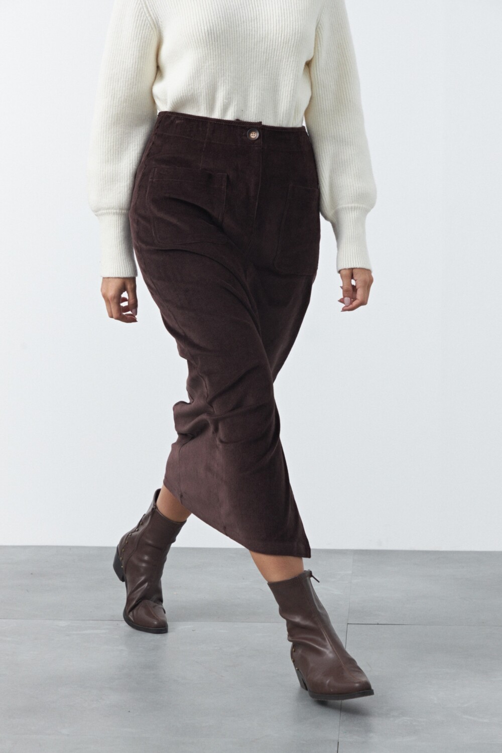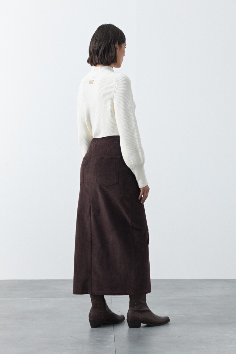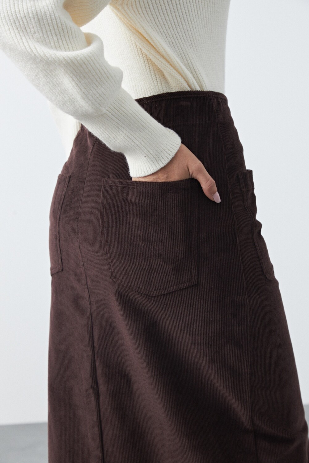 Maxifalda de pana de silueta recta que estiliza y aporta un aire moderno. El diseño de tiro alto con bolsillos delanteros y abertura frontal suma funcionalidad y movimiento, ideal para looks de temporada. La textura acanalada característica de la pana le da profundidad al conjunto y la convierte en una prenda versátil para combinar con tejidos o camisas.