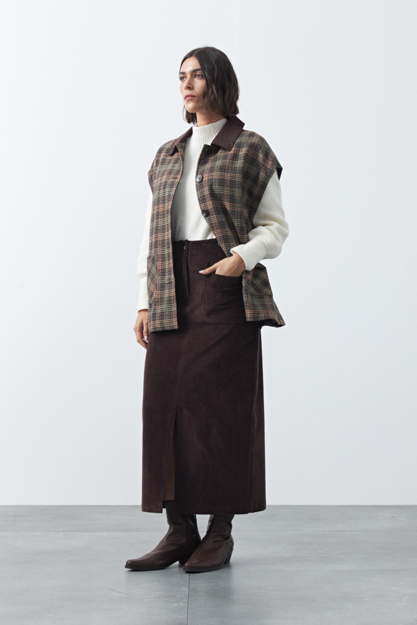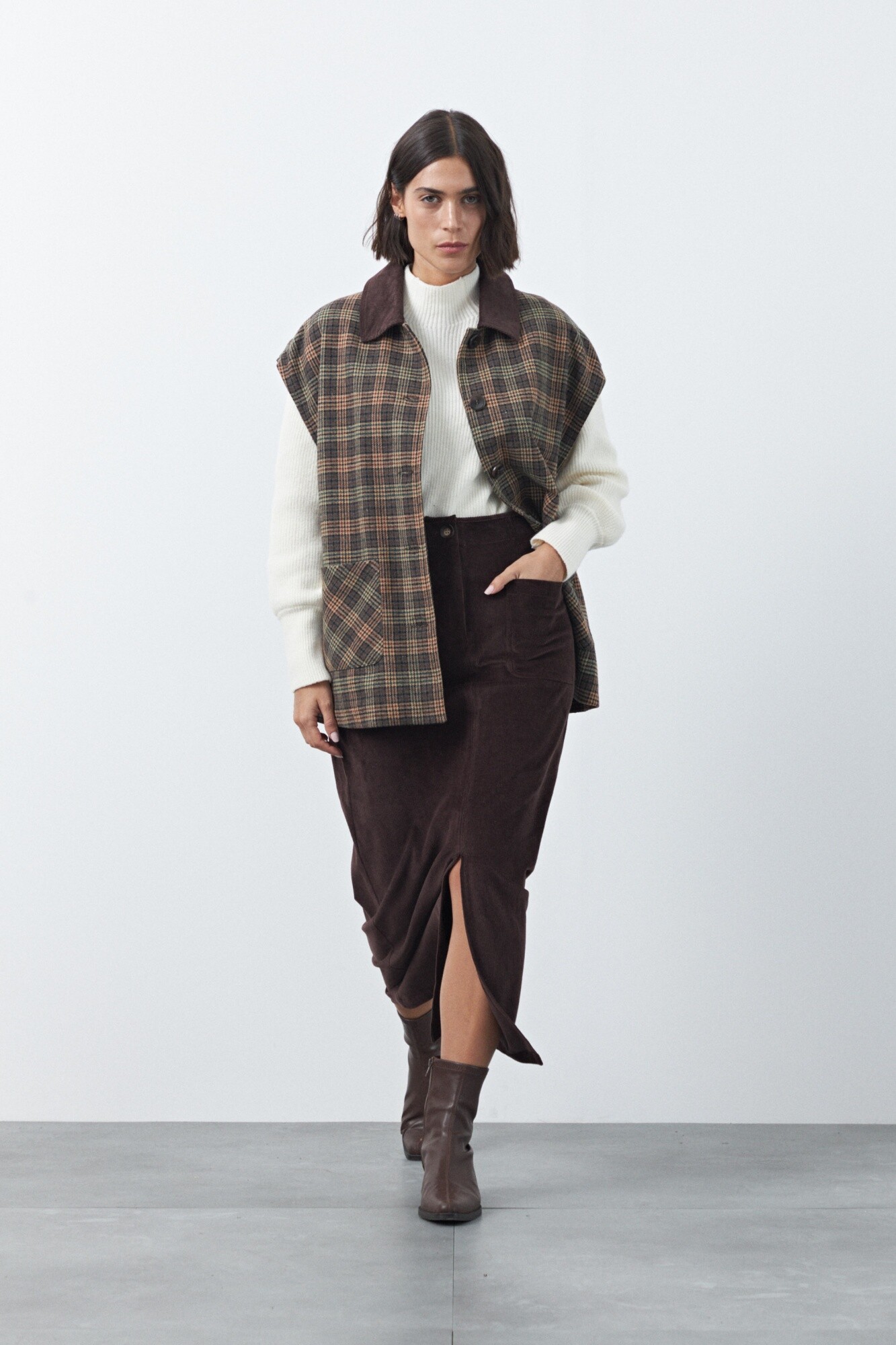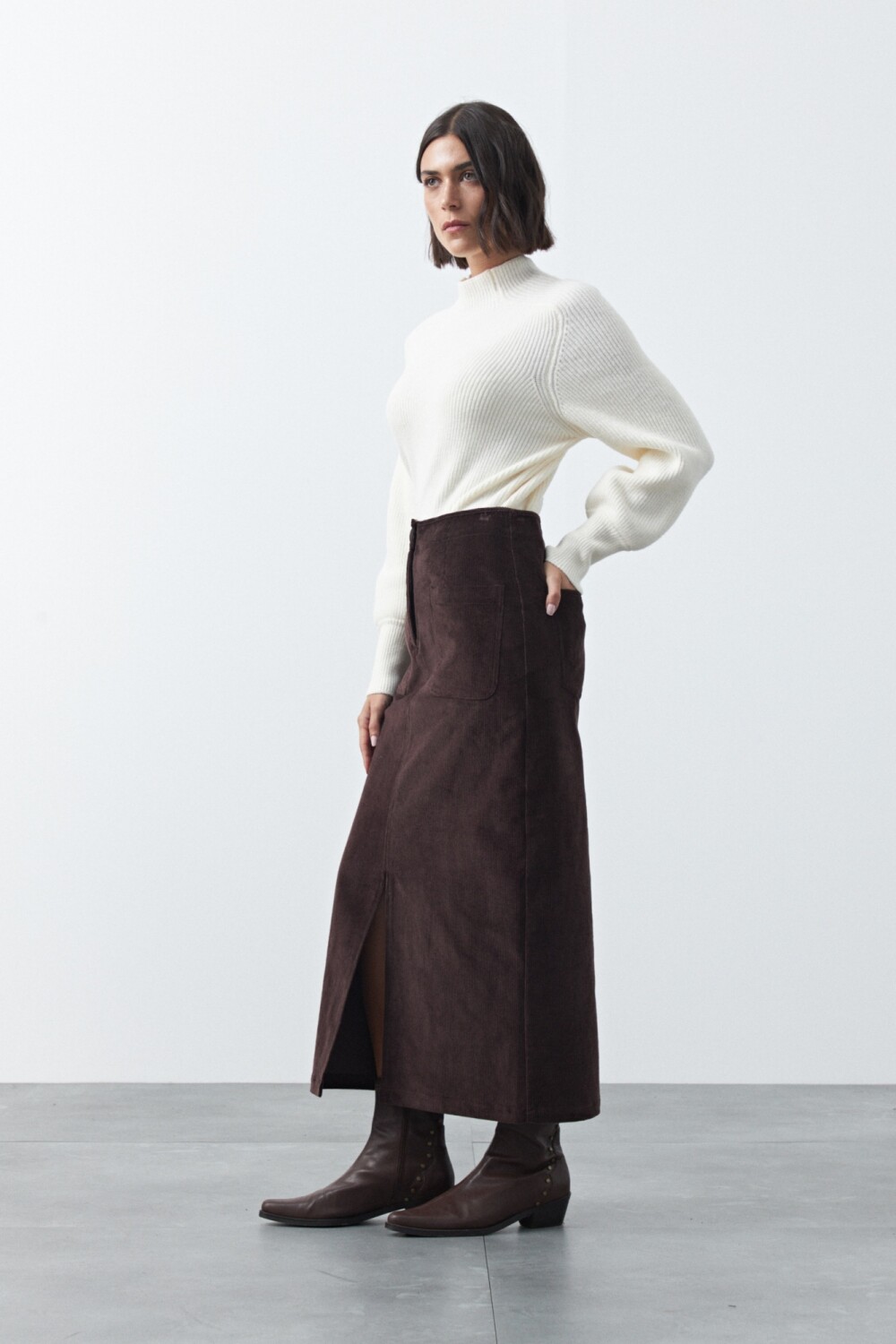 Maxifalda de pana de silueta recta que estiliza y aporta un aire moderno. El diseño de tiro alto con bolsillos delanteros y abertura frontal suma funcionalidad y movimiento, ideal para looks de temporada. La textura acanalada característica de la pana le da profundidad al conjunto y la convierte en una prenda versátil para combinar con tejidos o camisas.