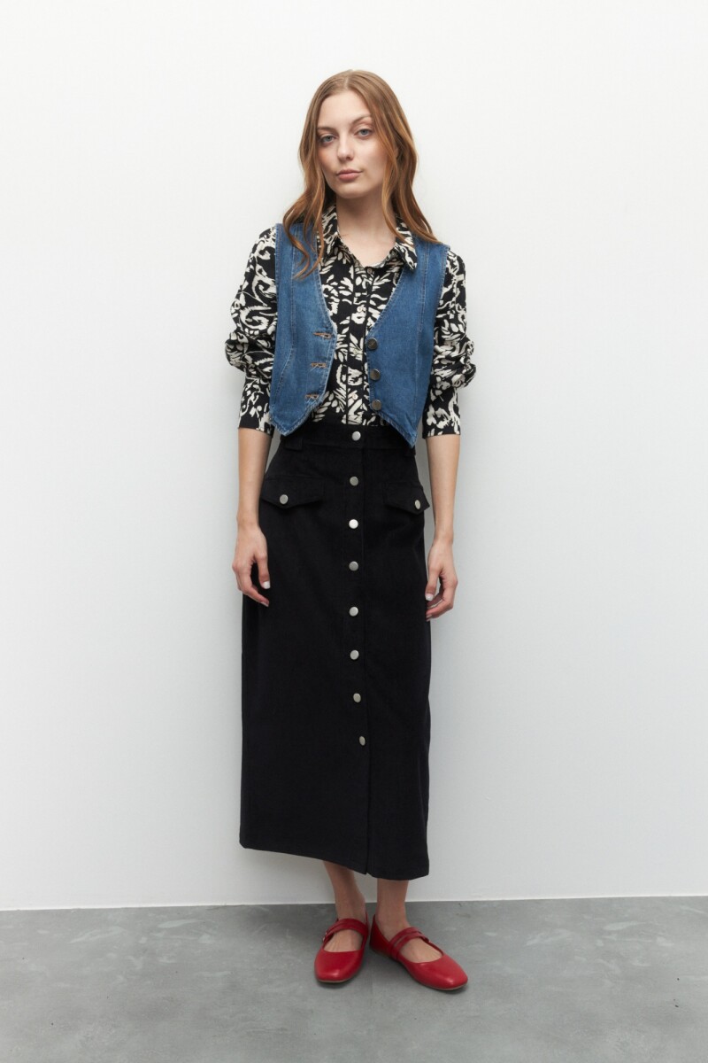 2409 Maxifalda de pana de botones metálicos y cuatro bolsillos, dos de ellos de solapa.