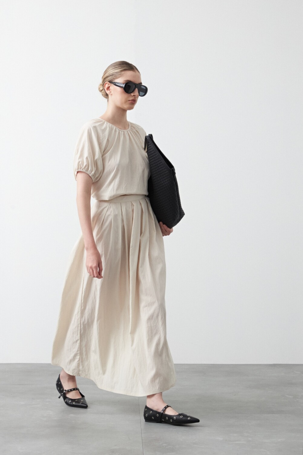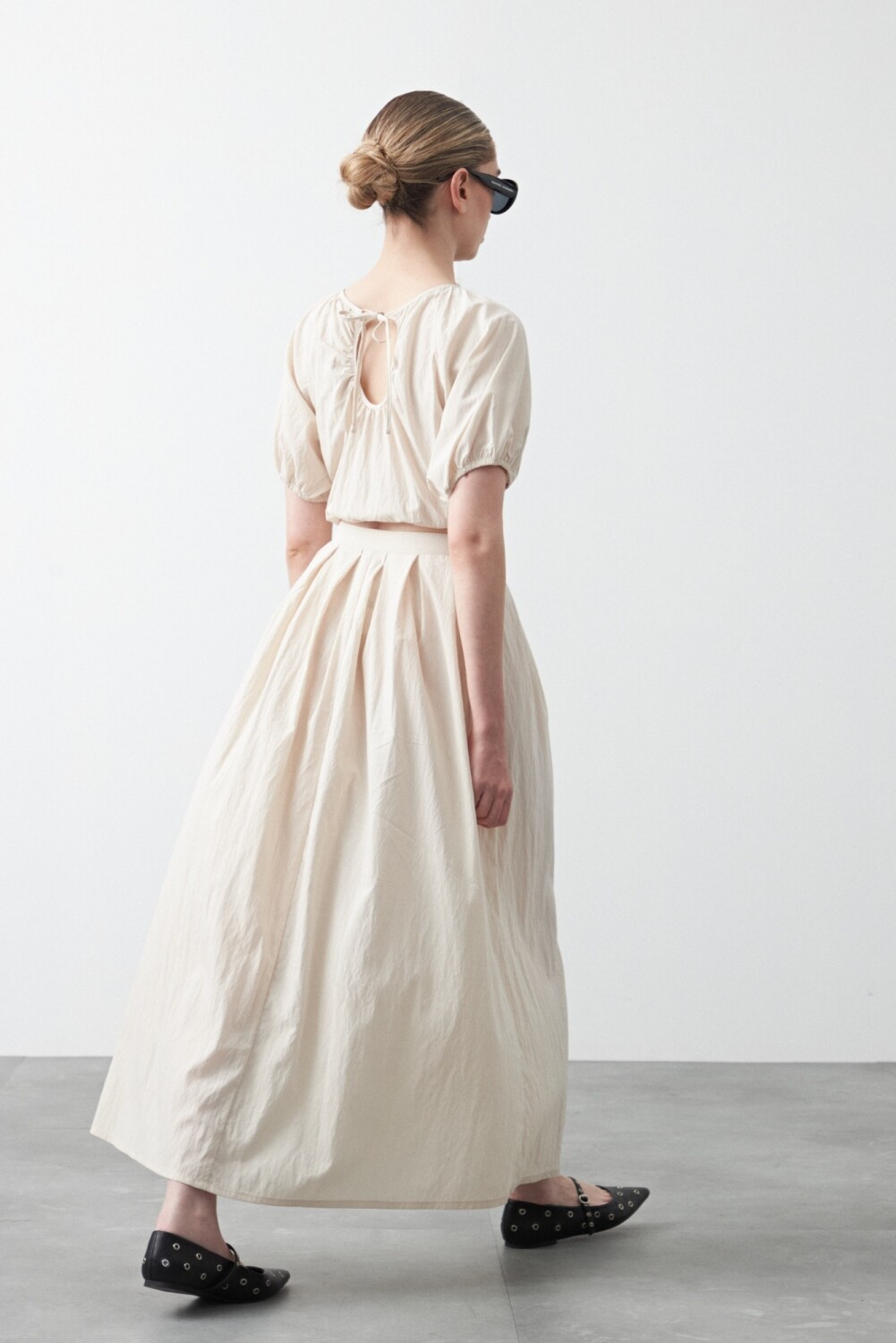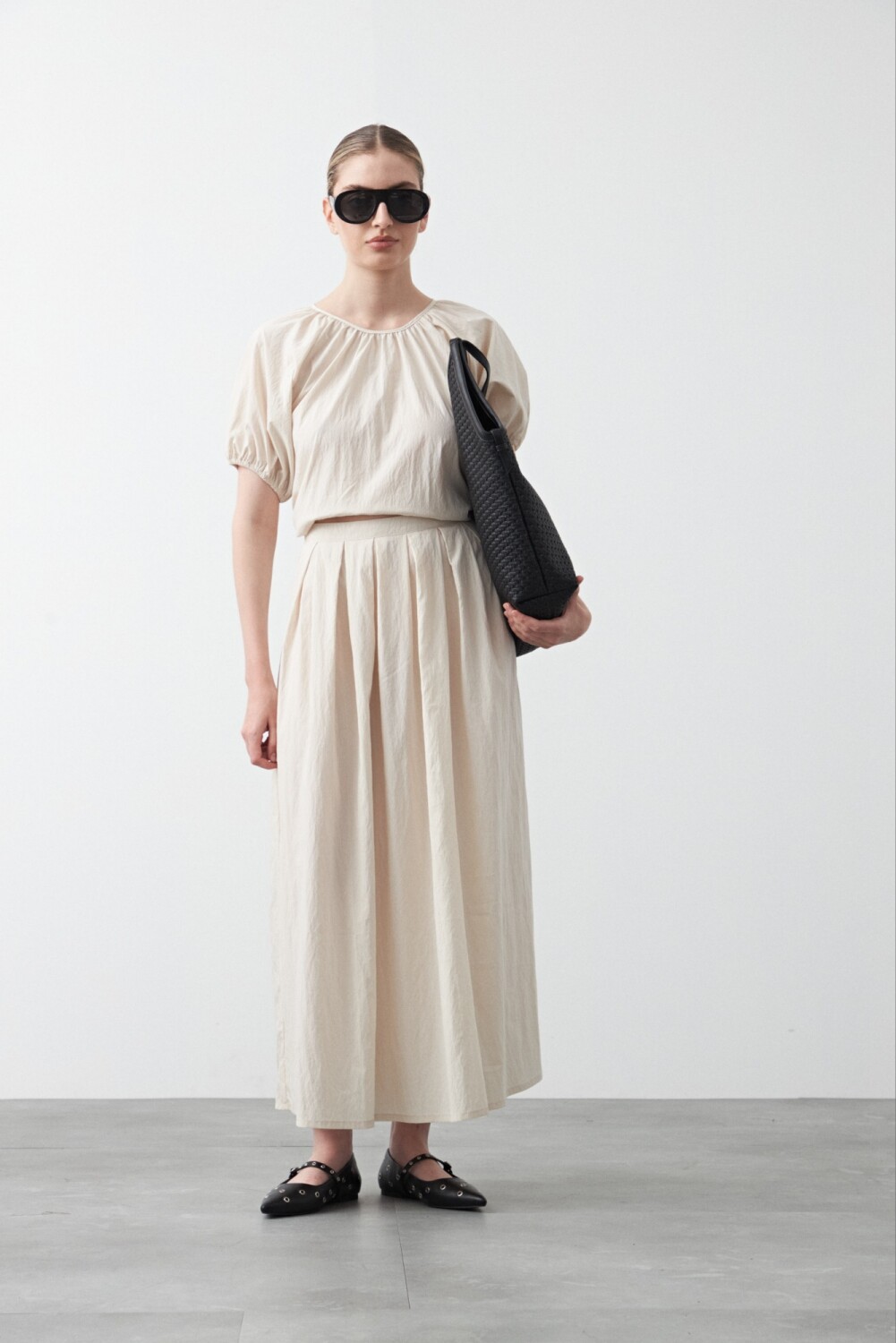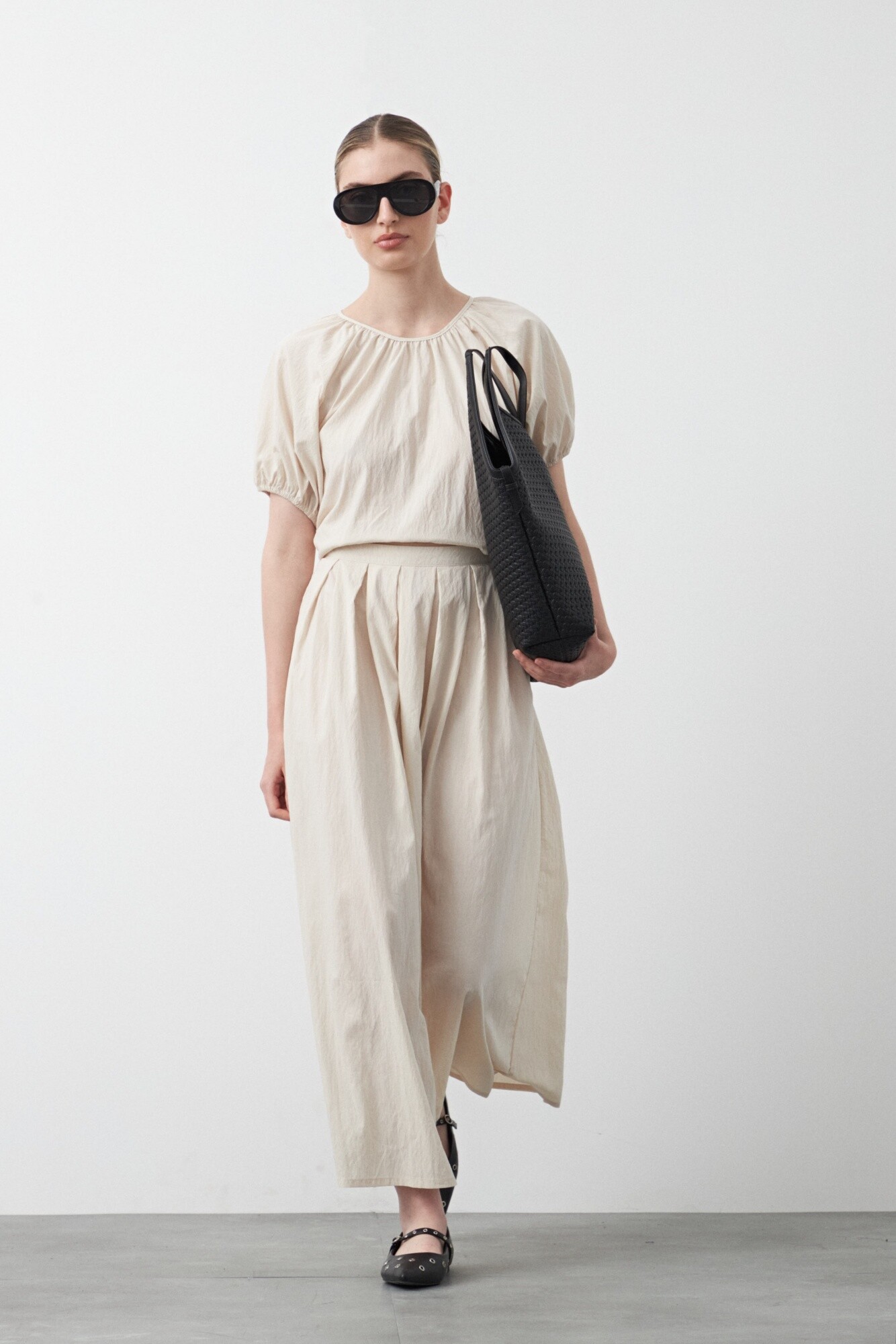 Falda larga plisada, de silueta amplia y caída fluida que aporta movimiento y un calce elegante. El diseño con pliegues definidos acompaña la forma sin marcar, mientras la cintura realza la silueta y suma comodidad. Una opción versátil para armar looks urbanos o más pulidos según cómo se combine.