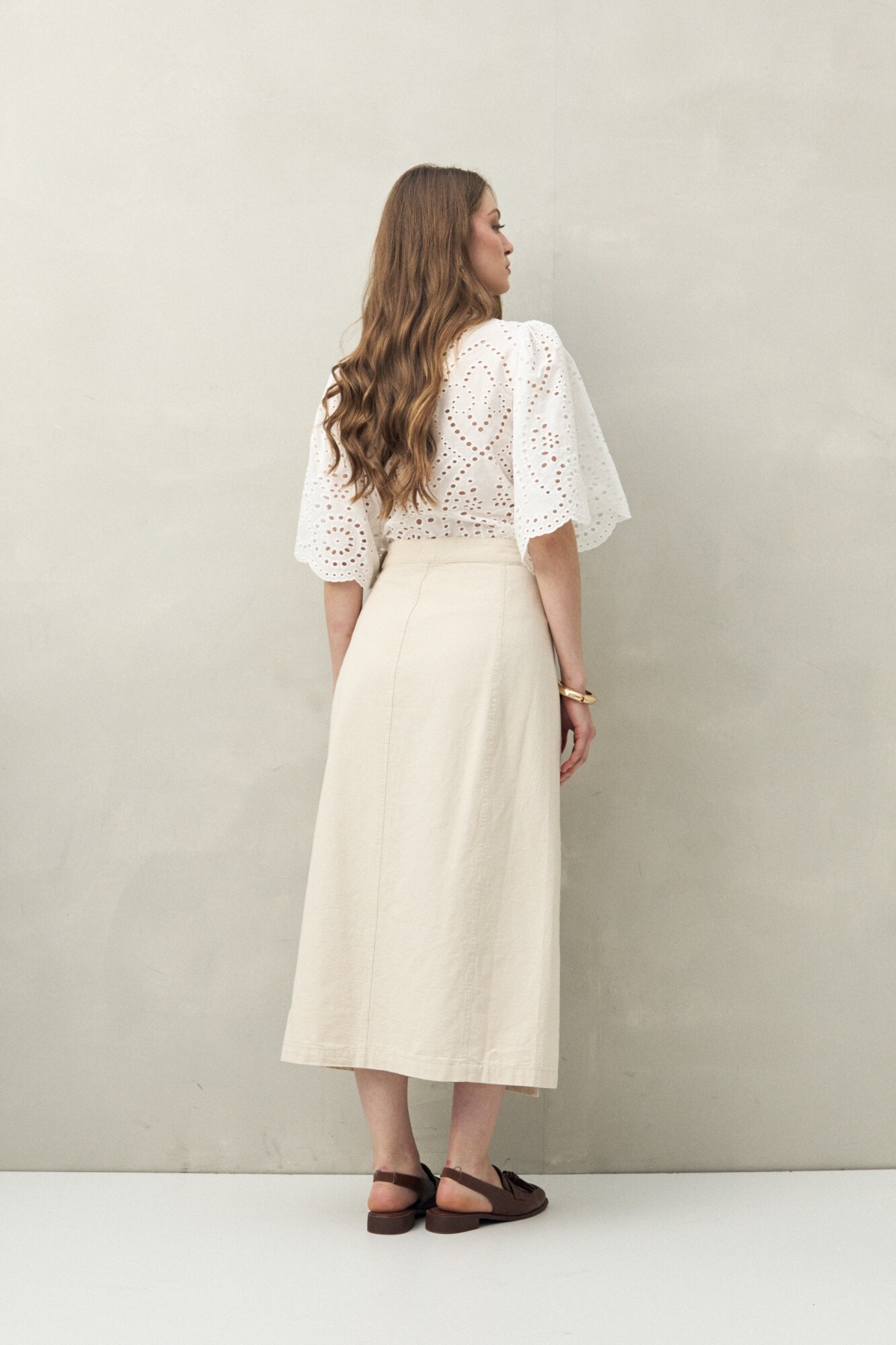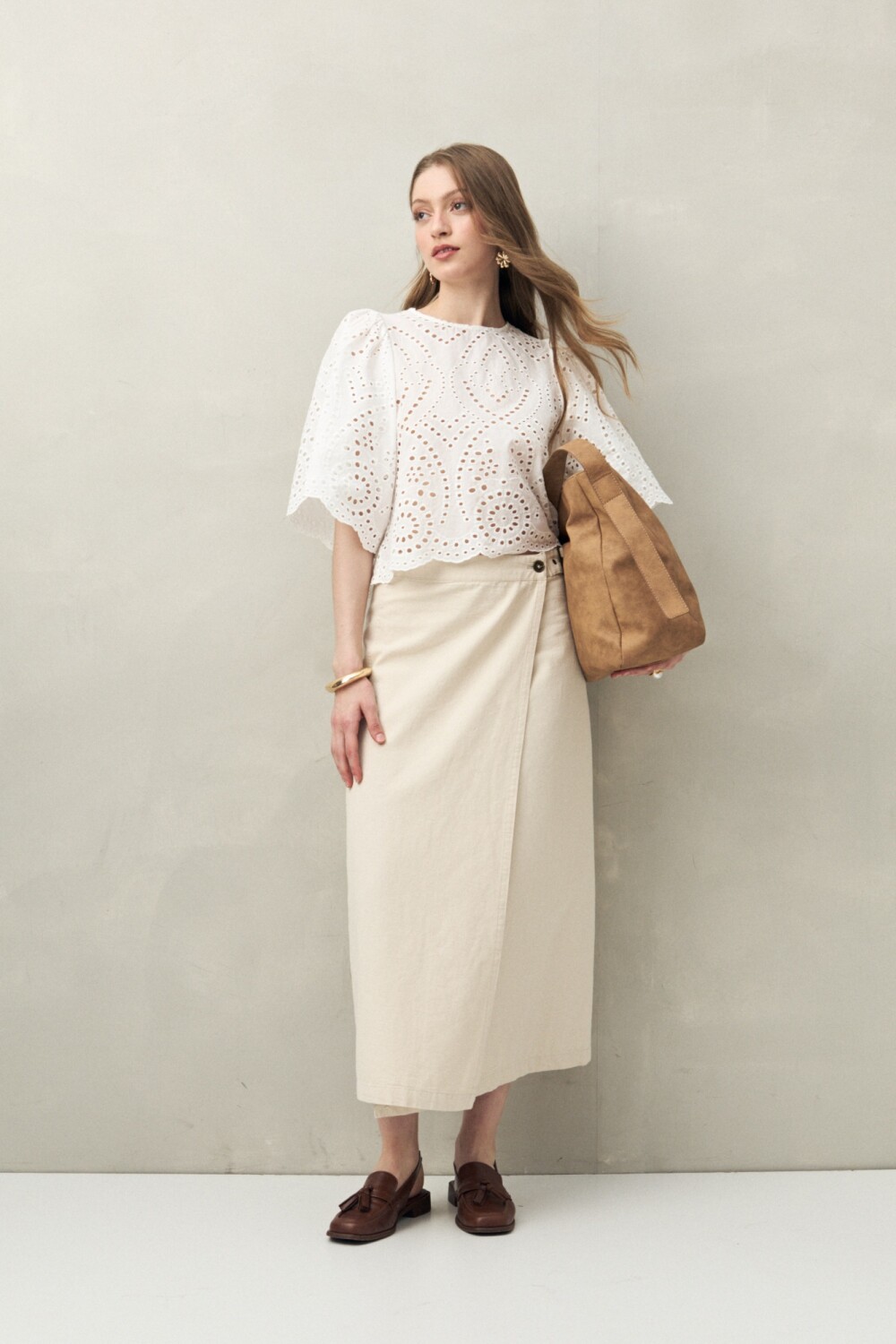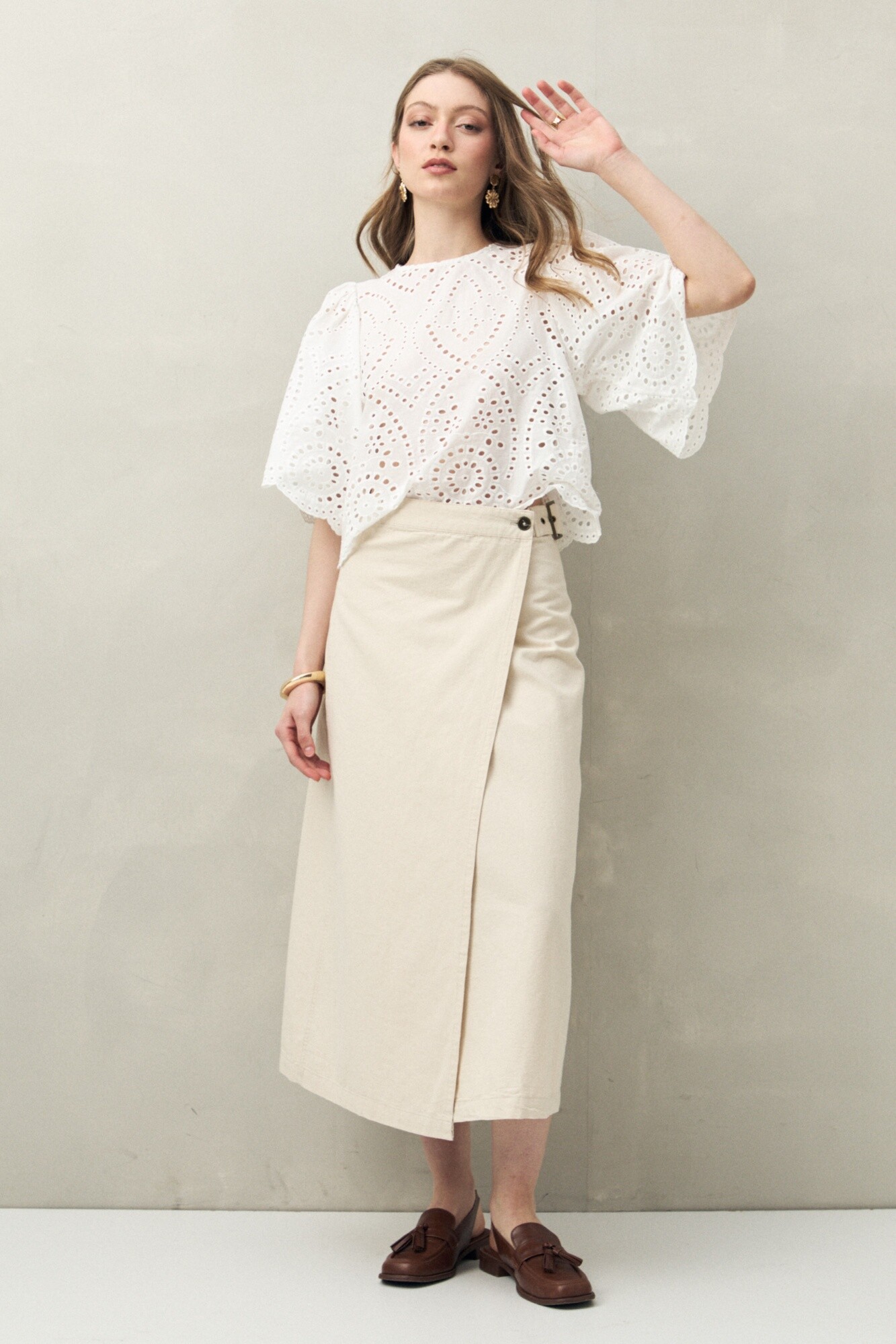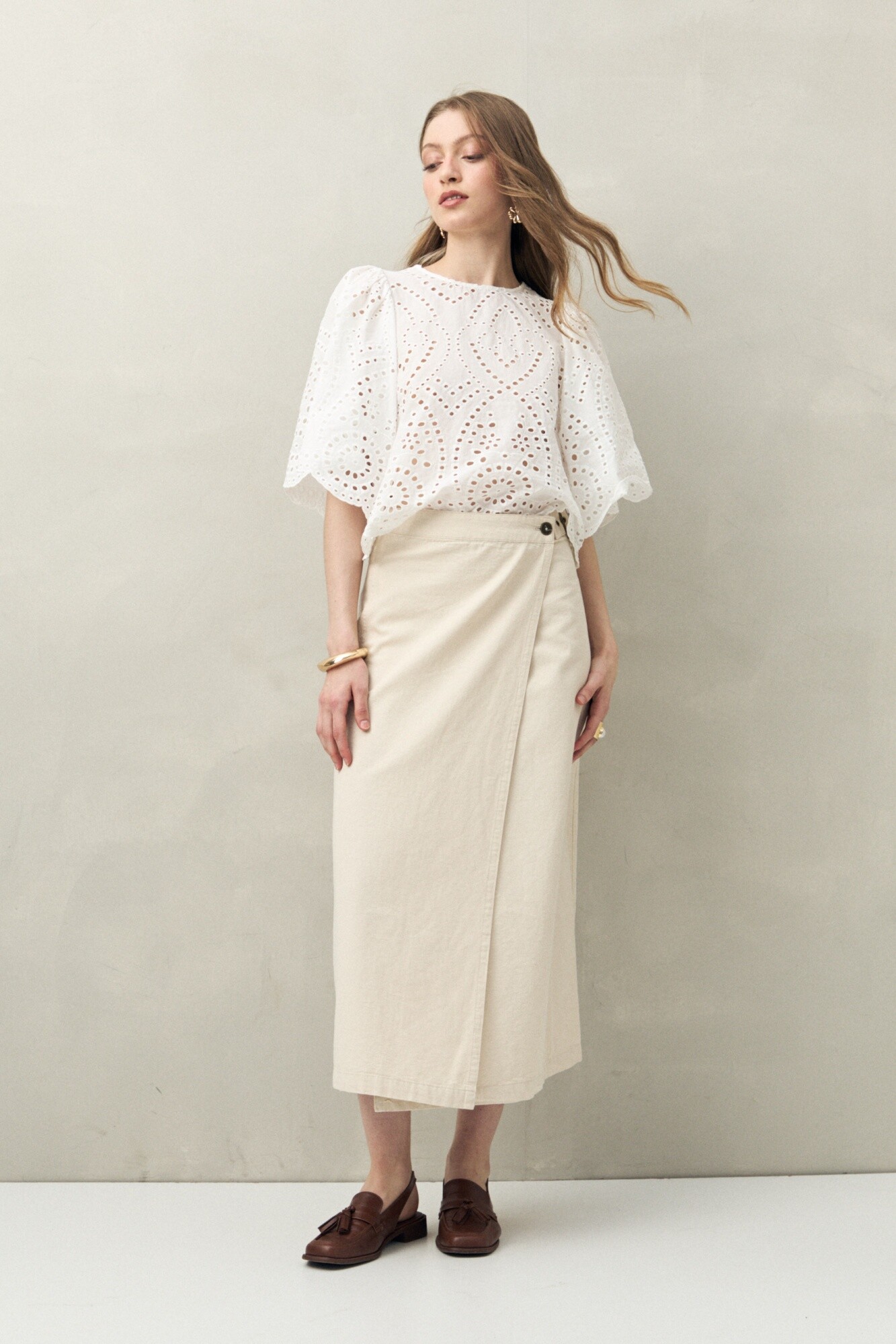 Falda larga confeccionada en 100% algodón, con diseño cruzado y cierre lateral con hebilla que realza la cintura. Su silueta amplia y fluida aporta movimiento y una caída natural, ideal para lograr looks frescos y modernos. Una prenda versátil que puede acompañar desde un top ajustado hasta una camisa liviana, perfecta para elevar cualquier outfit casual.