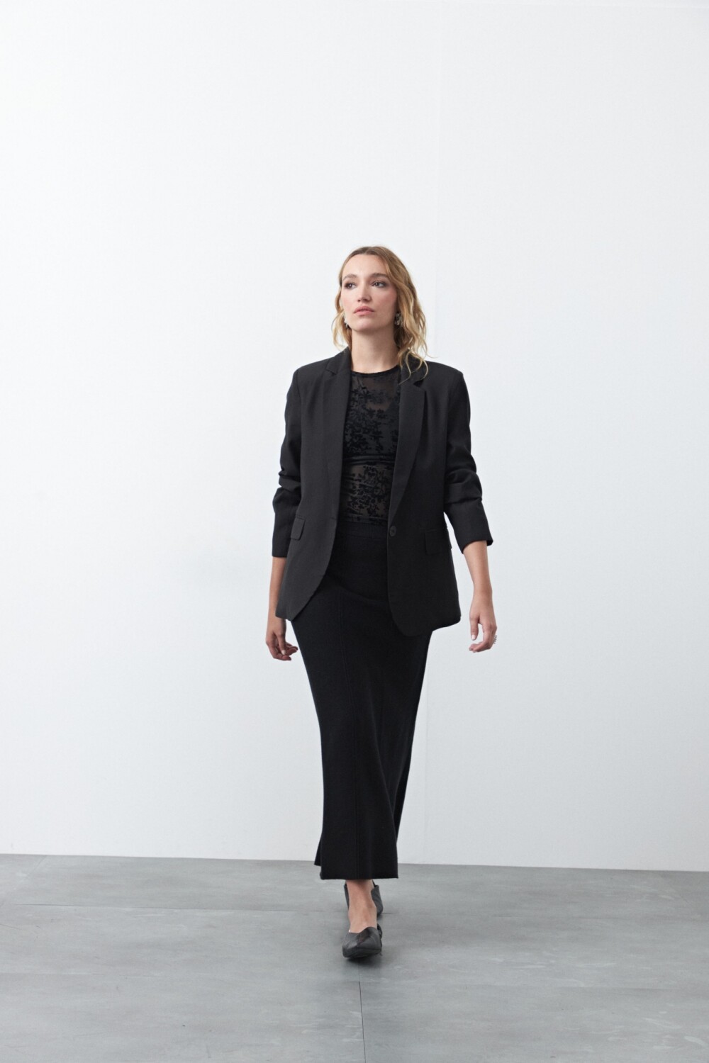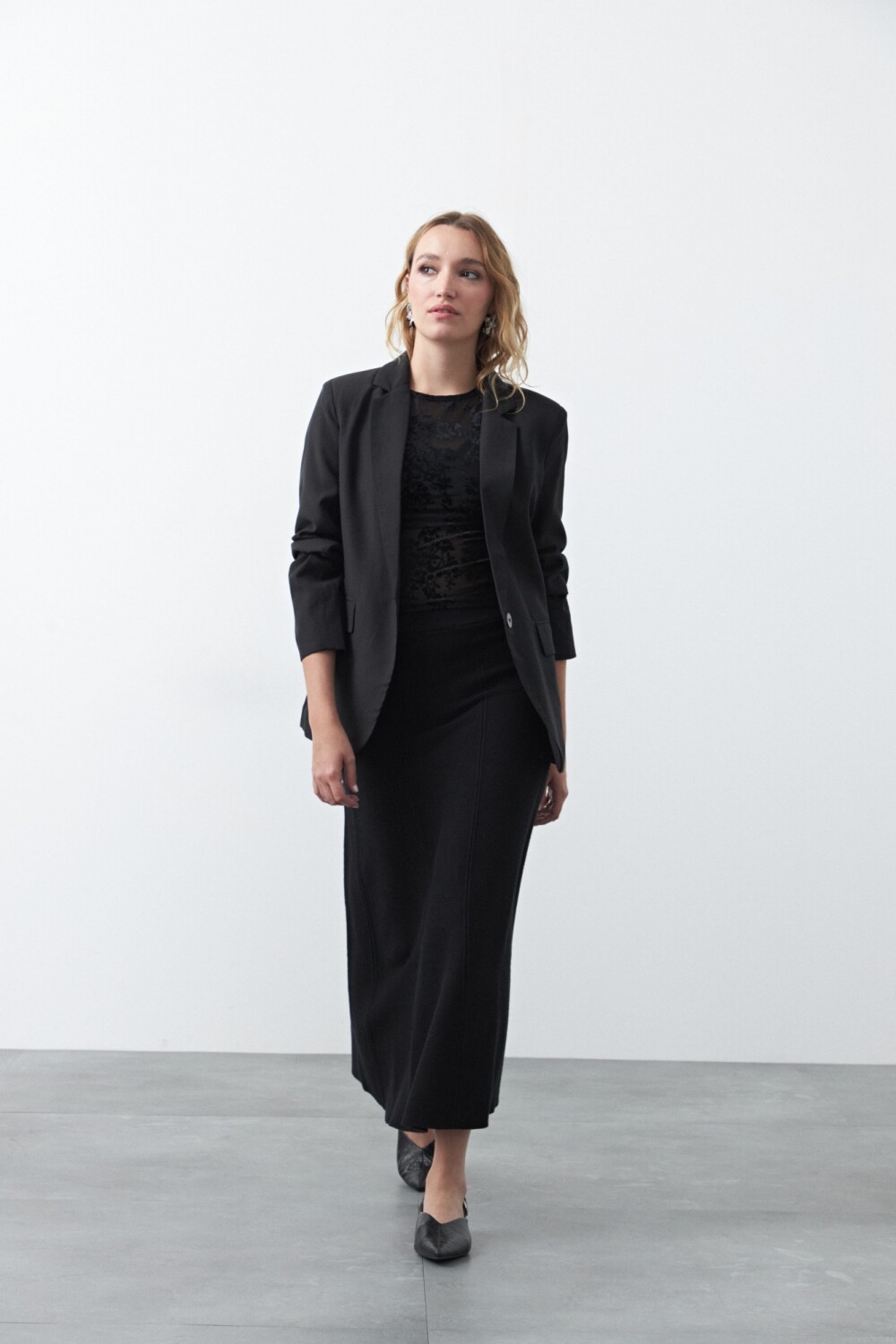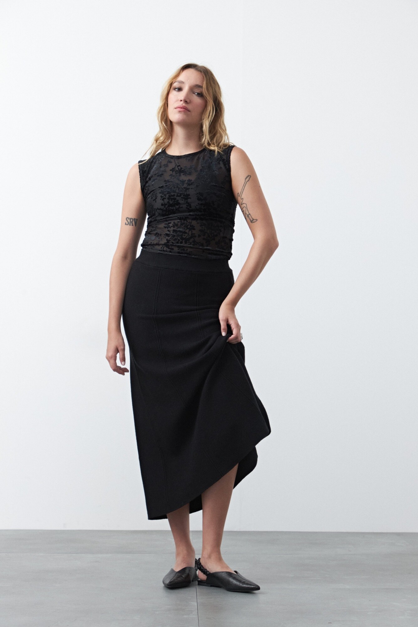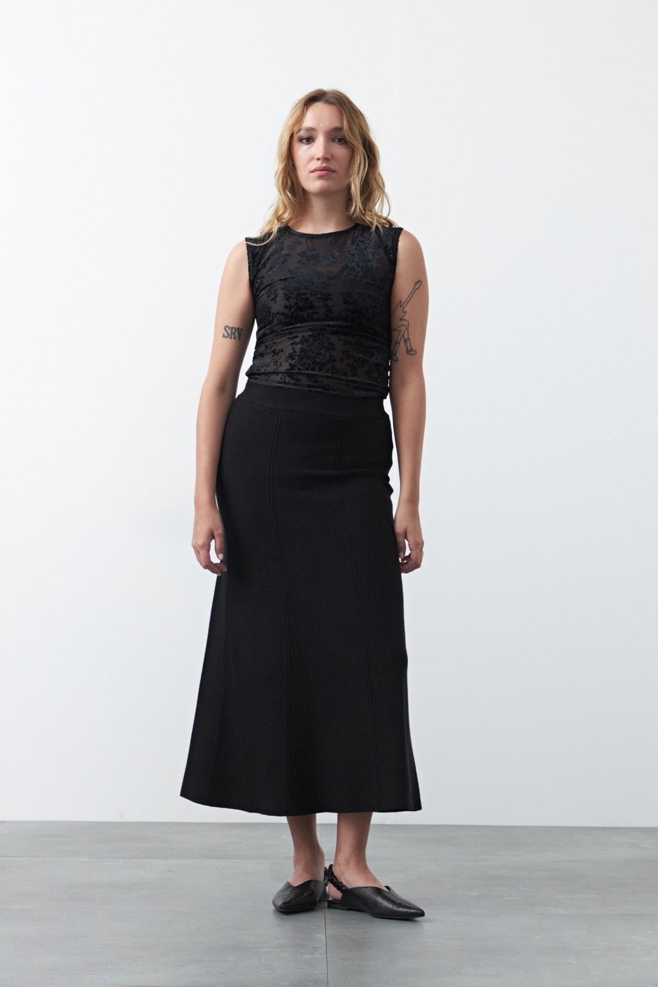 Falda midi tejida, de silueta evasé que aporta movimiento y una caída fluida. Su diseño limpio y minimalista la convierte en una prenda versátil, ideal para armar looks tanto formales como más relajados según cómo se combine. Un básico sofisticado que estiliza la figura y funciona perfecto para el día o la noche.