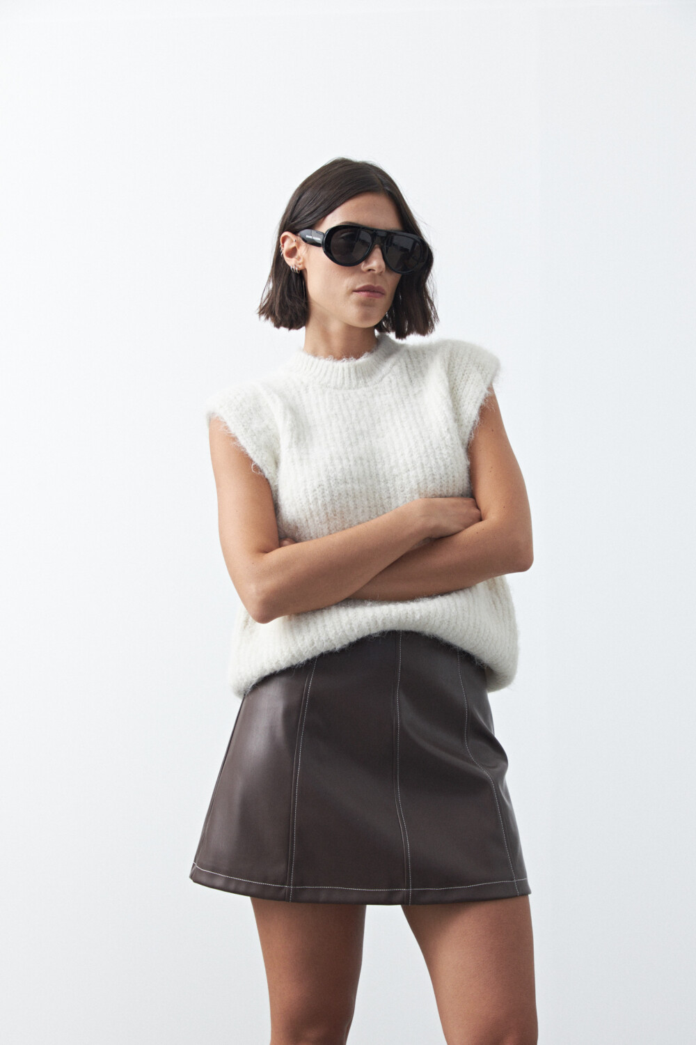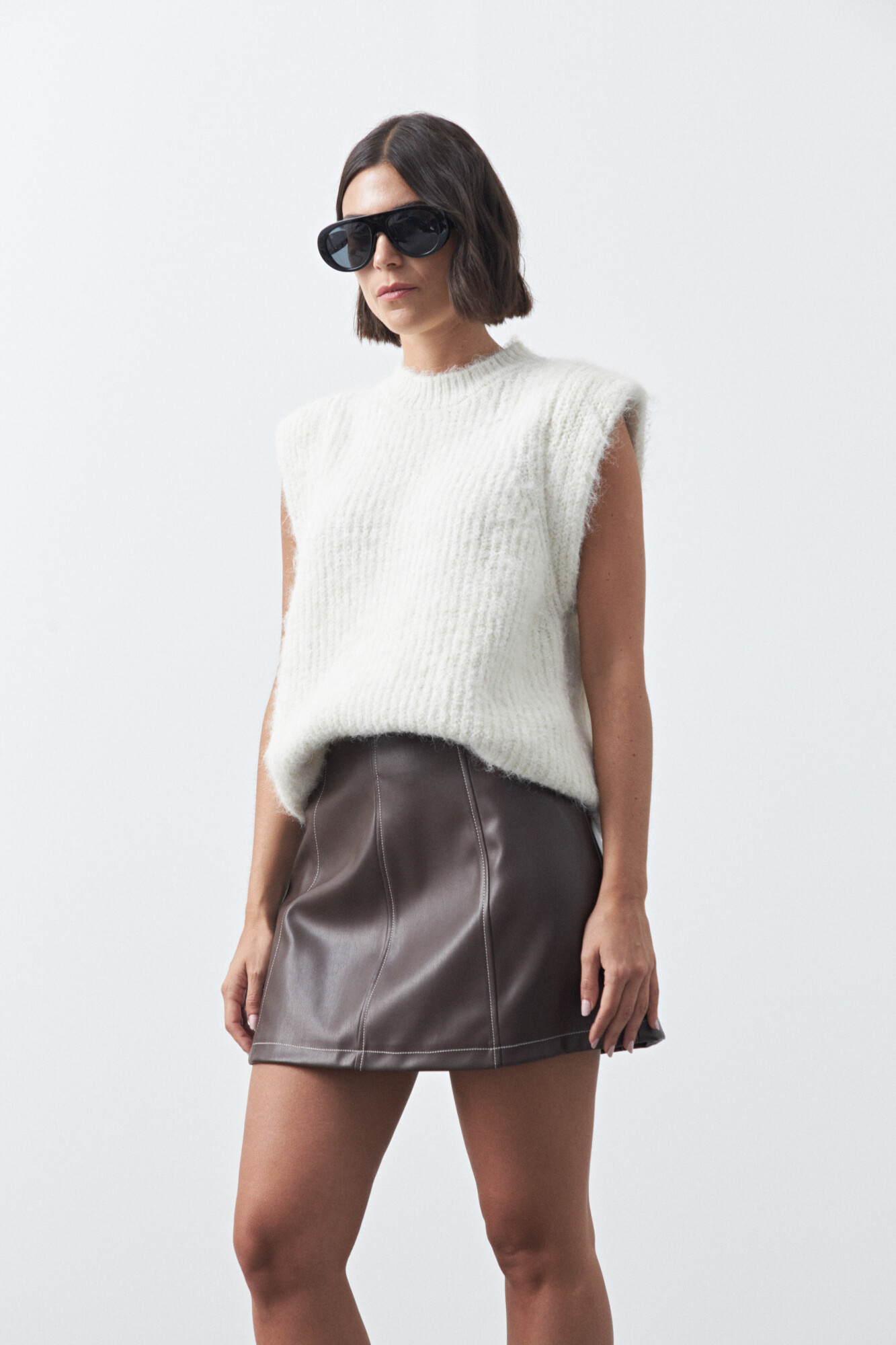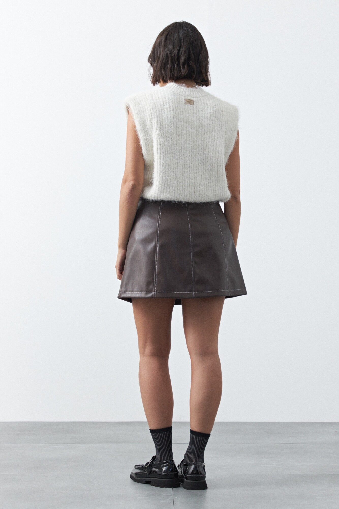 Minifalda en símil cuero de silueta en A que aporta estructura y un calce favorecedor. Su diseño limpio con recortes realza la forma y la convierte en una prenda versátil para combinar con knitwear, camisas o básicos y armar looks actuales con impronta. Ideal para sumar un toque moderno y elevar cualquier outfit.