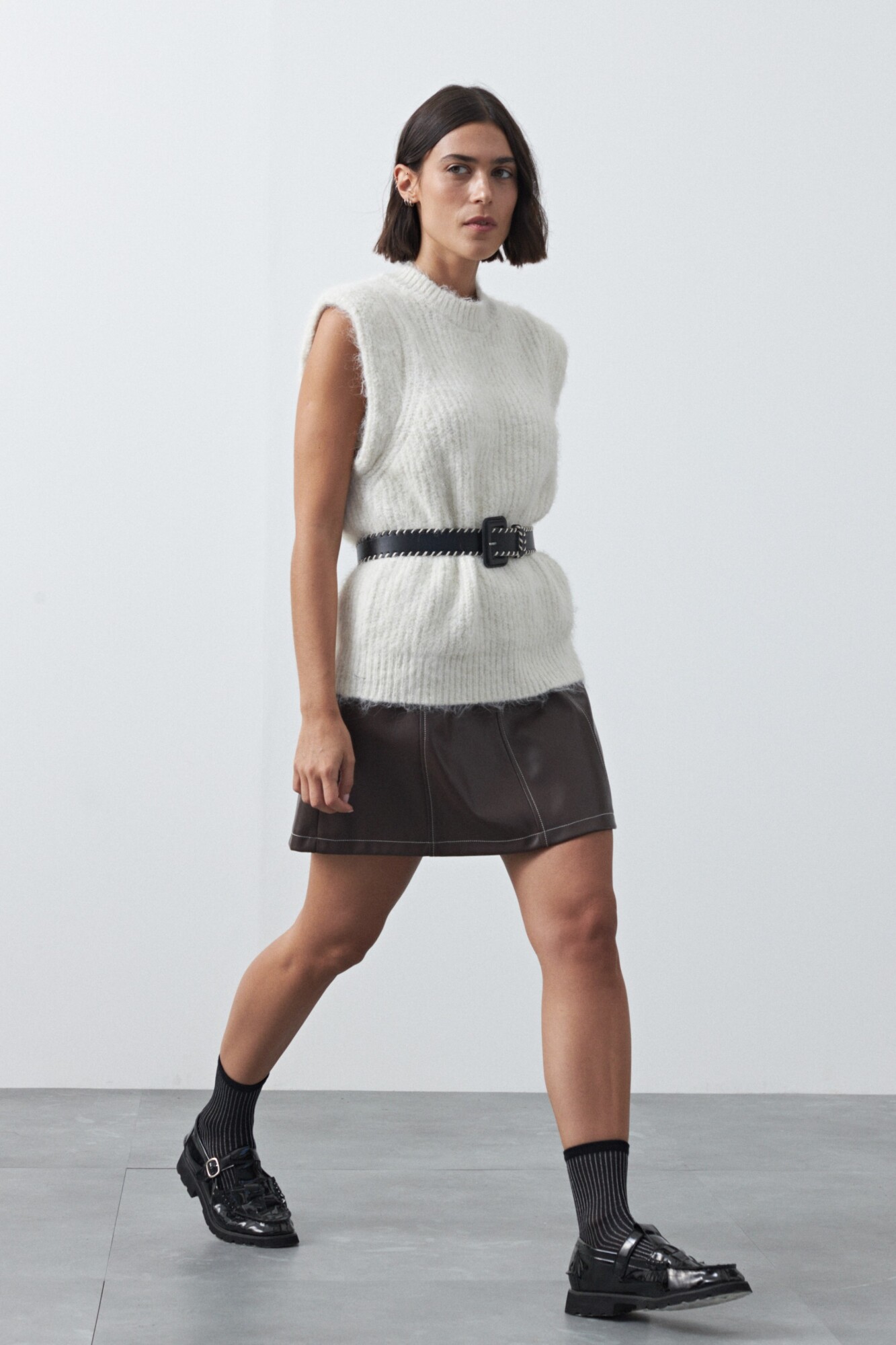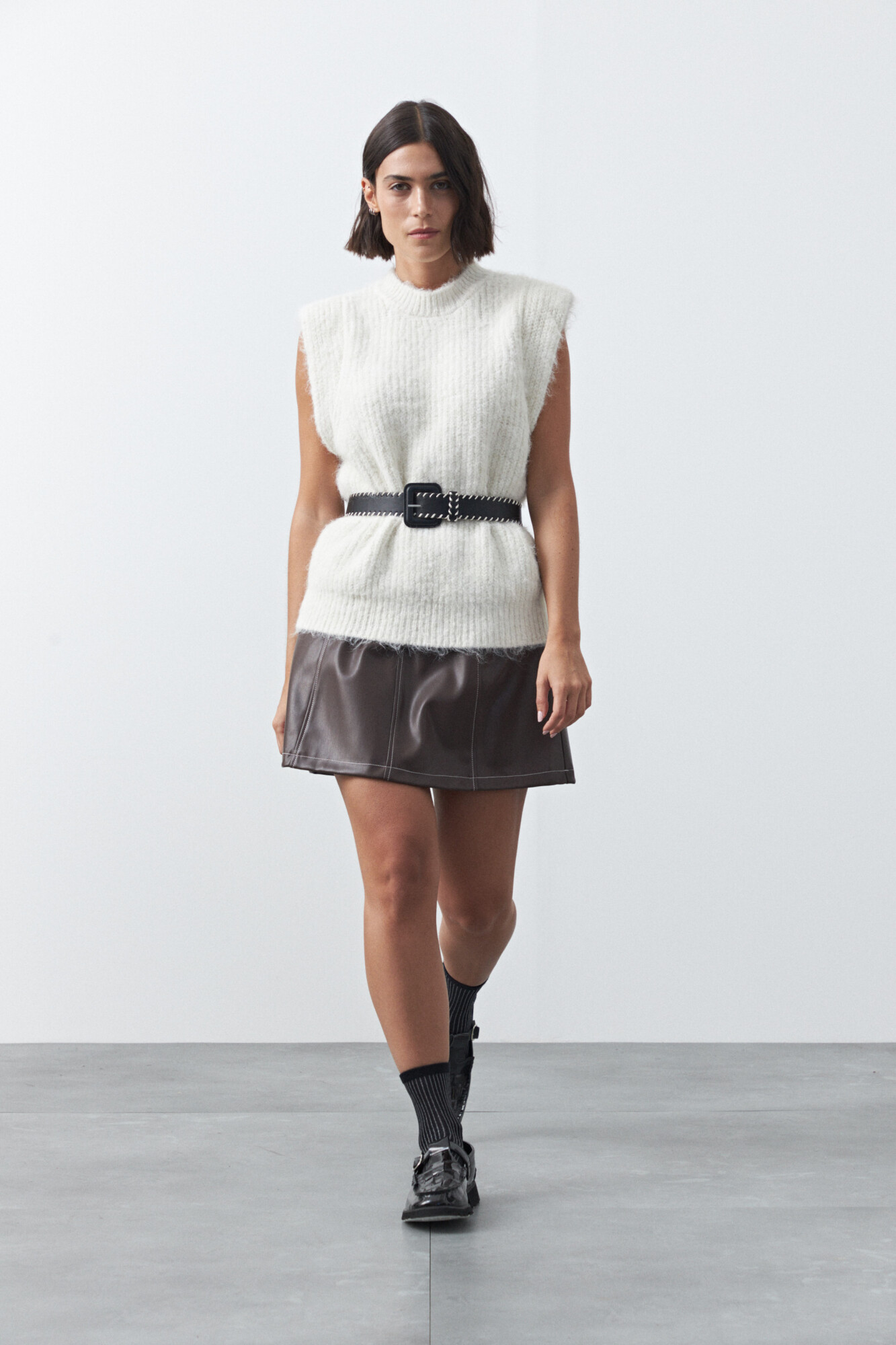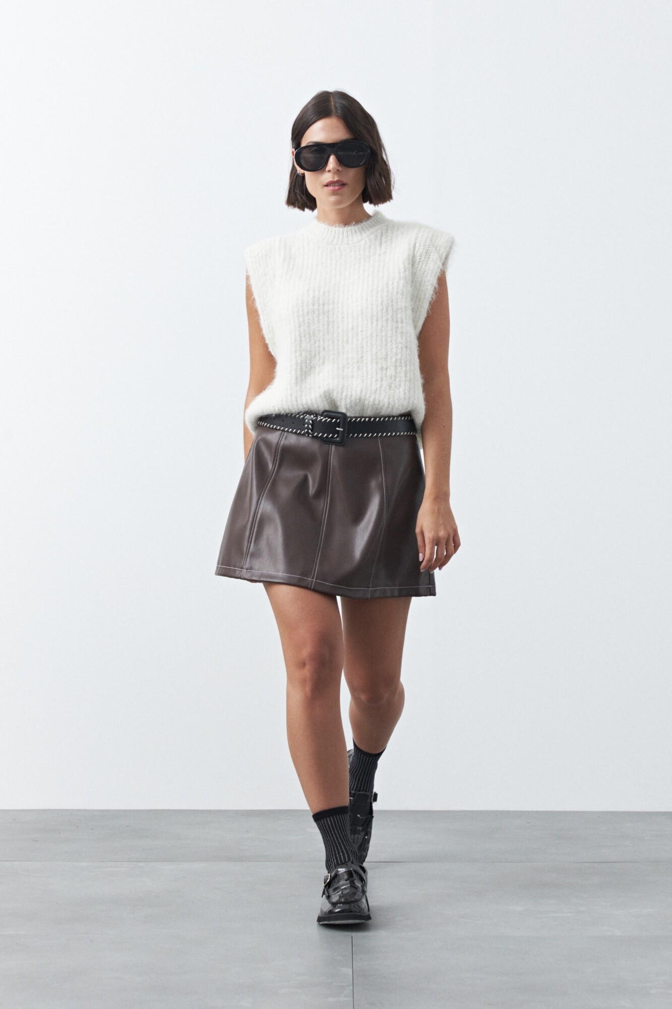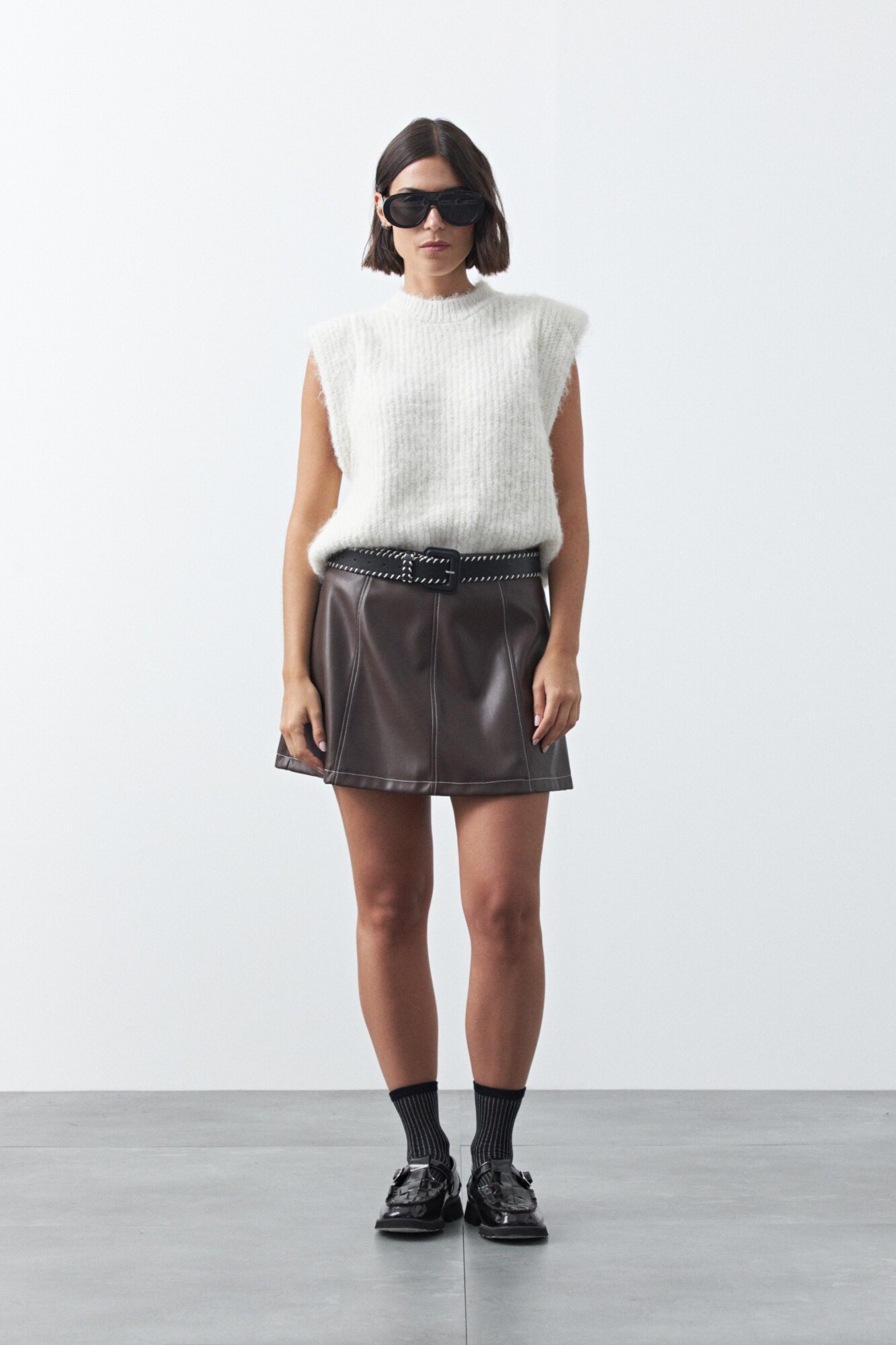 Minifalda en símil cuero de silueta en A que aporta estructura y un calce favorecedor. Su diseño limpio con recortes realza la forma y la convierte en una prenda versátil para combinar con knitwear, camisas o básicos y armar looks actuales con impronta. Ideal para sumar un toque moderno y elevar cualquier outfit.