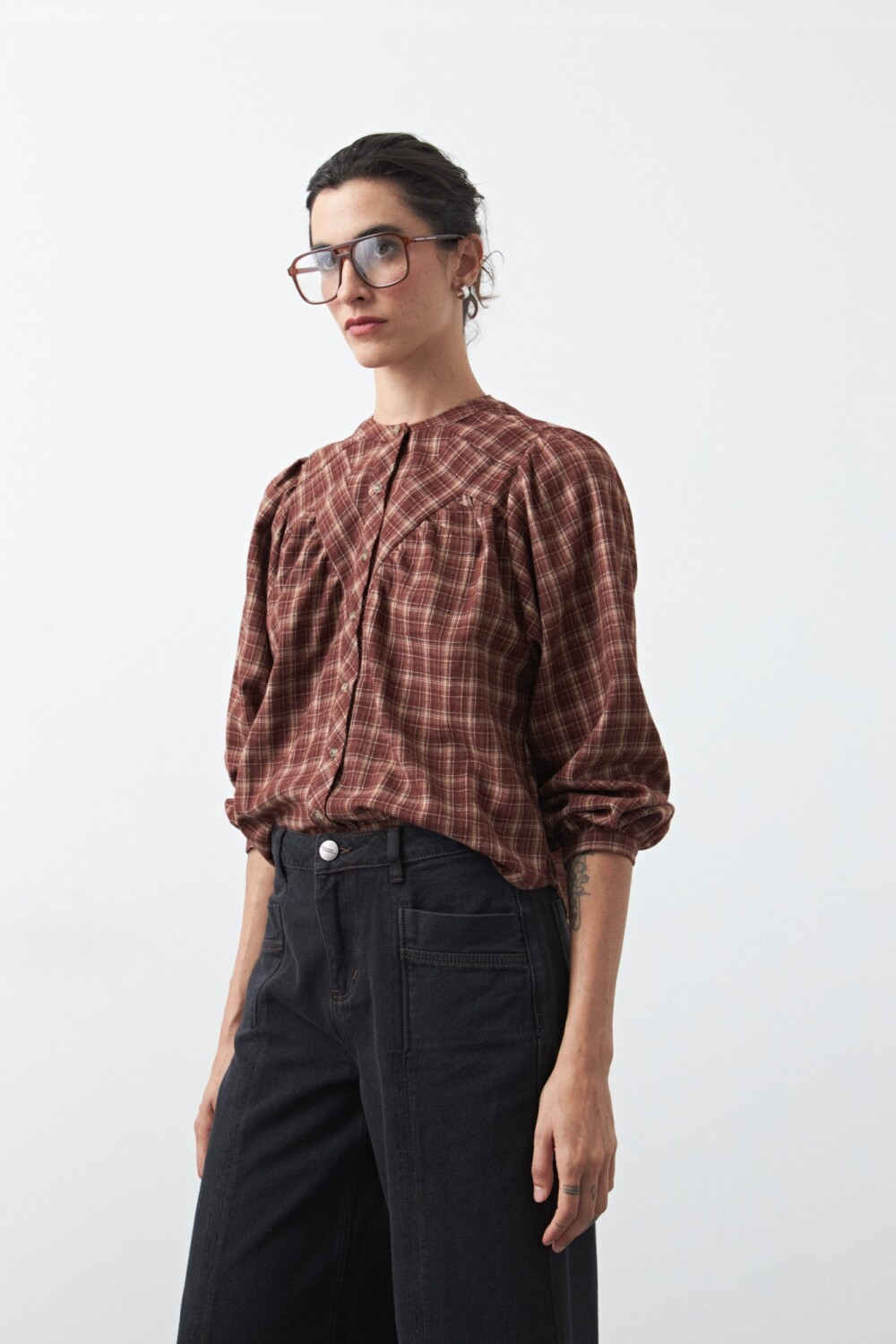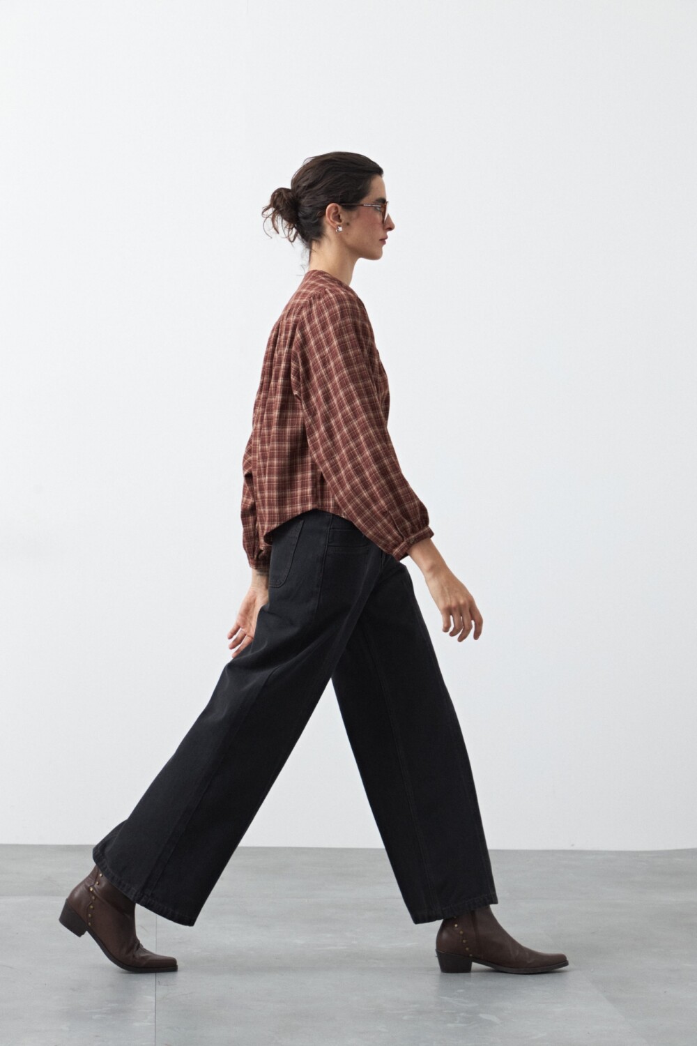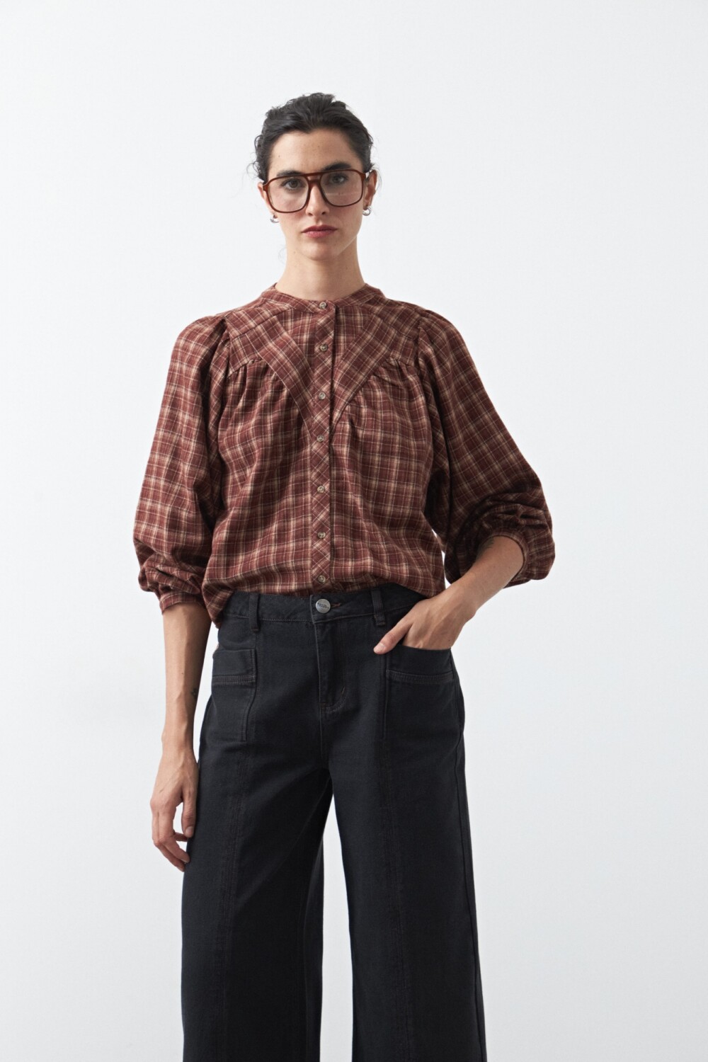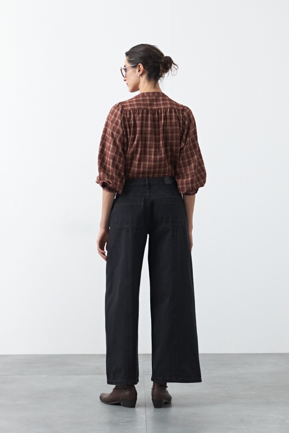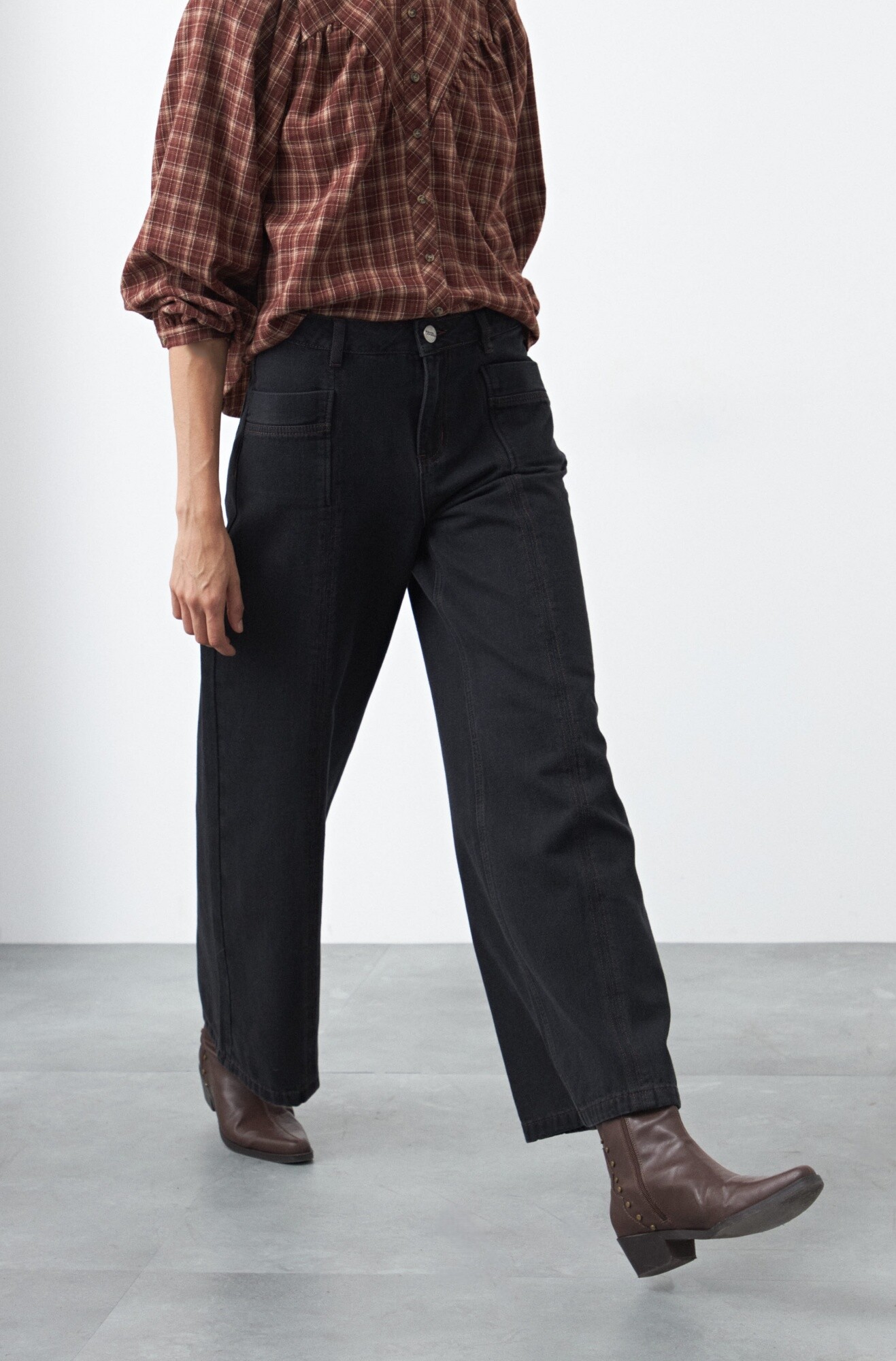 Jean fit flare de inspiración retro, con calce entallado en la parte superior y apertura progresiva hacia el bajo que estiliza la figura. El diseño se completa con pespuntes a contratono que realzan su construcción y aportan un detalle distintivo, en línea con la estética denim en tendencia.