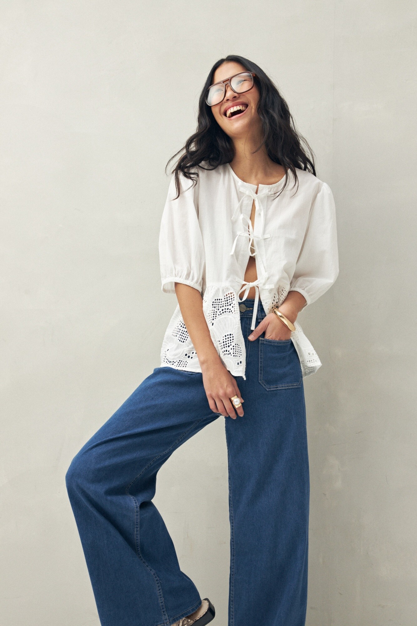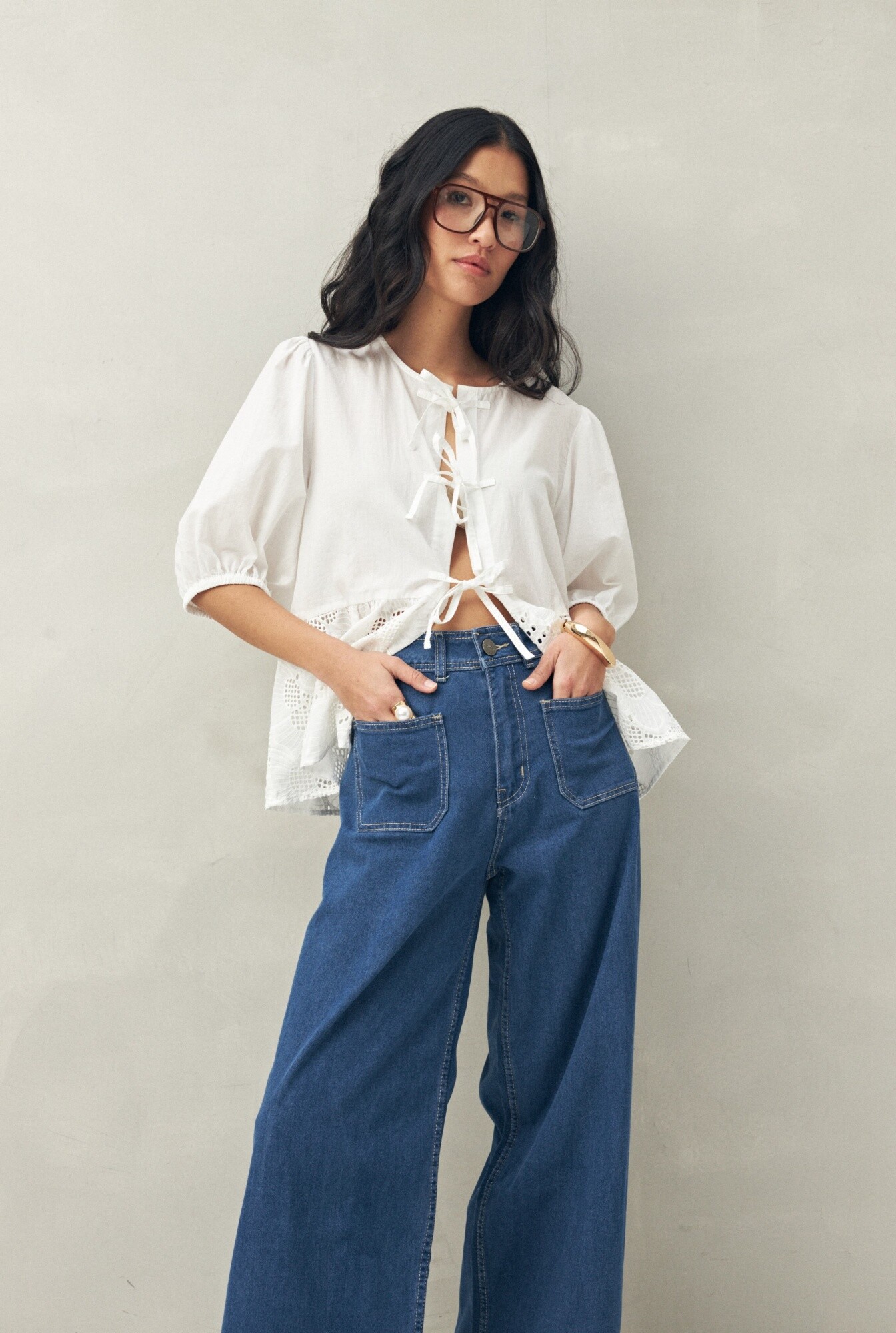 Jean ancho de tiro alto con bolsillos delanteros amplios que aportan un detalle moderno y funcional. Su fit estiliza y al mismo tiempo brinda comodidad, convirtiéndose en una prenda clave para looks urbanos y relajados. Perfecto para combinar con blusas, camisas o tops y elevar cualquier outfit de temporada.