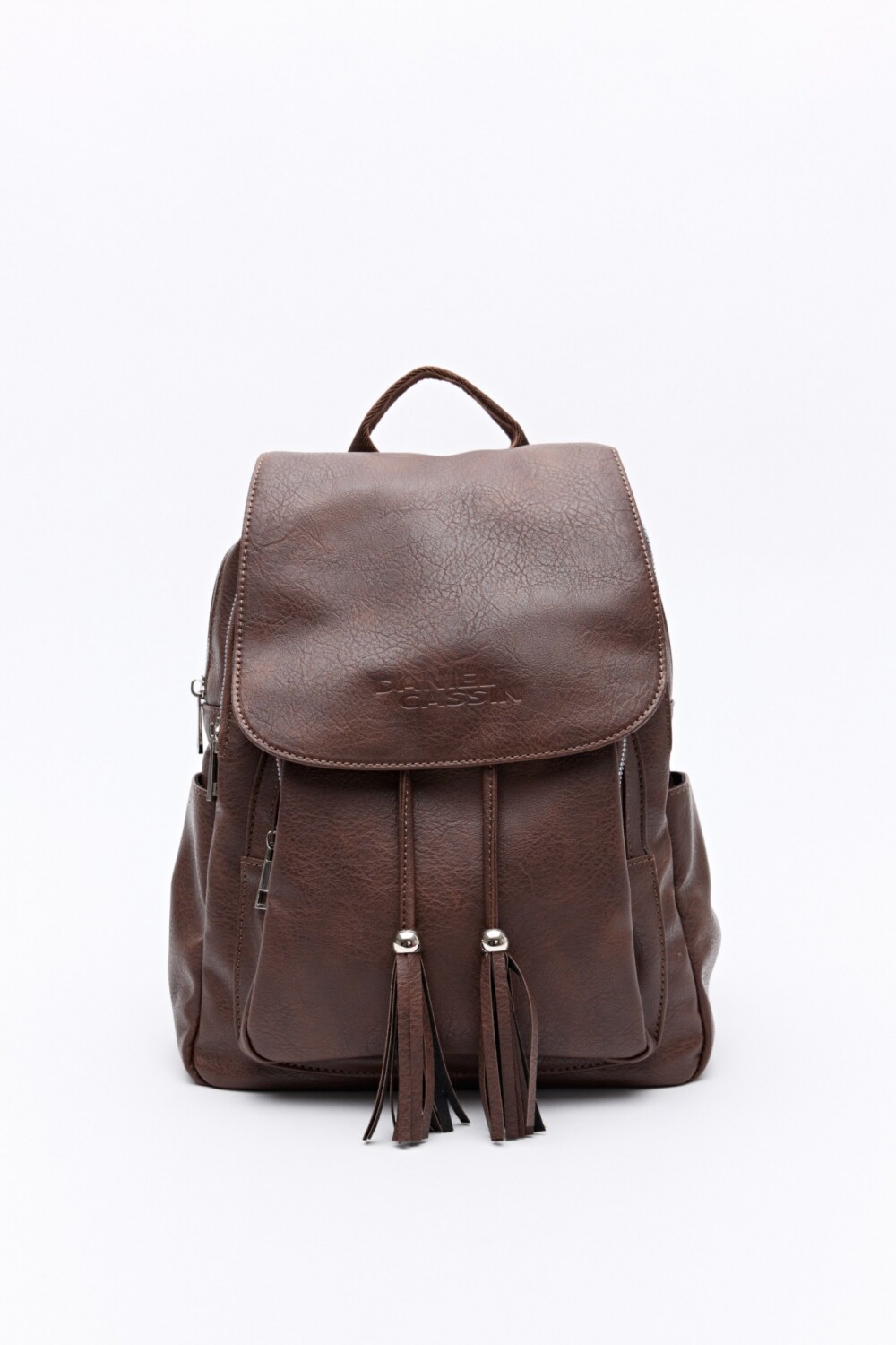 Un clásico de Cassin que no falla! La mochila Tulipa es en símil cuero con dos flecos con terminación de cuentas plateadas. Tiene tres reparticiones con bolsillos internos adicionales y dos bolsillos más en los laterales. Con un asa fija en la parte superior y dos regulables en cinta en la espalda y otro bolsillo también en la parte trasera. Mide 35cm de alto, 23 de ancho y 15cm de base.