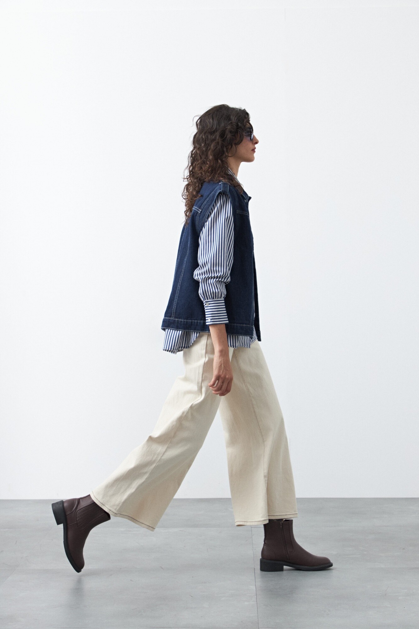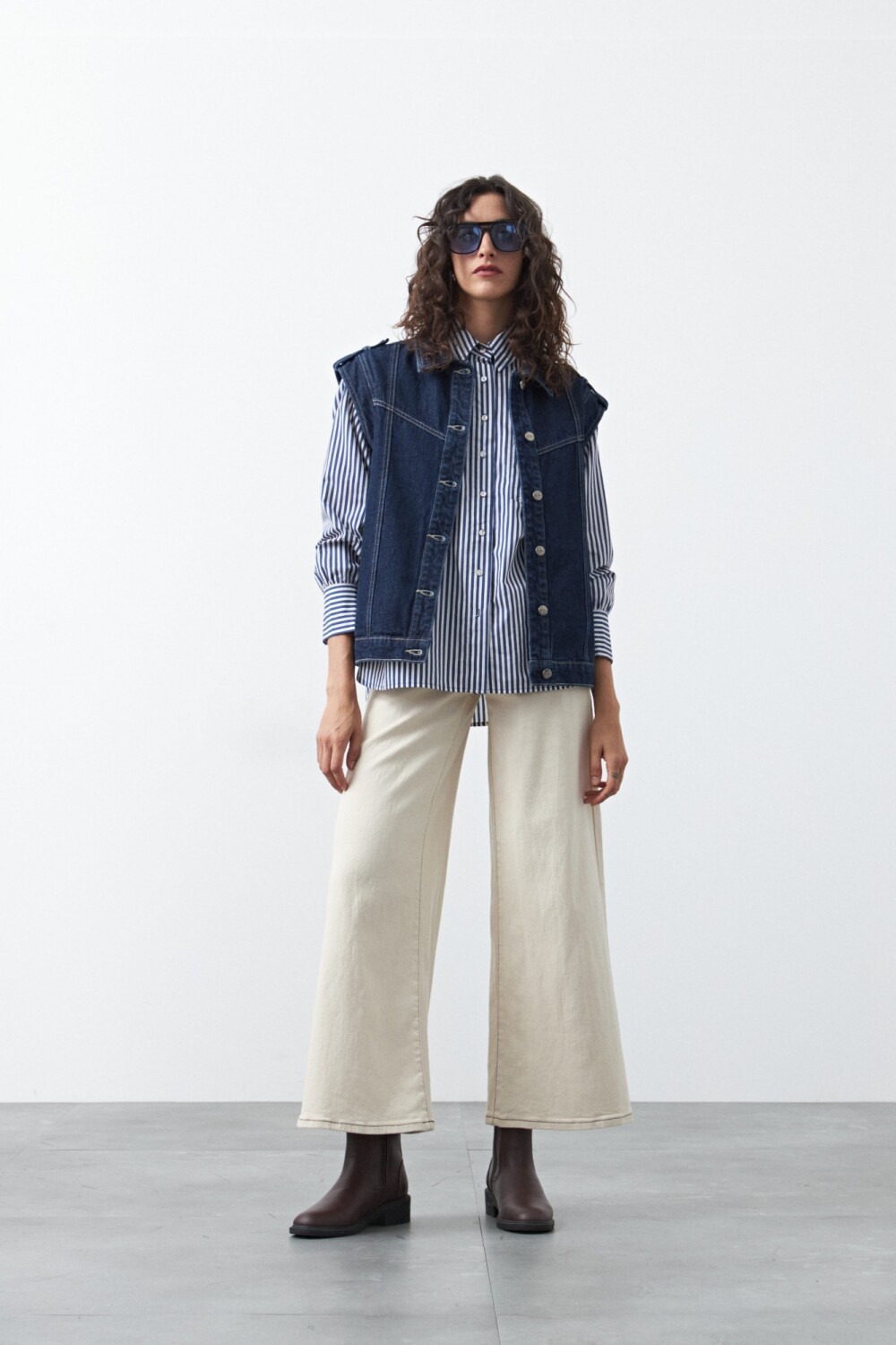 Pantalón wide leg de algodón con elastano, de calce amplio y caída recta que estiliza la silueta. El diseño de tiro alto realza la cintura y equilibra el volumen de la pierna, logrando un look moderno y relajado a la vez. Con pespuntes a contratono, aporta comodidad sin perder estilo.