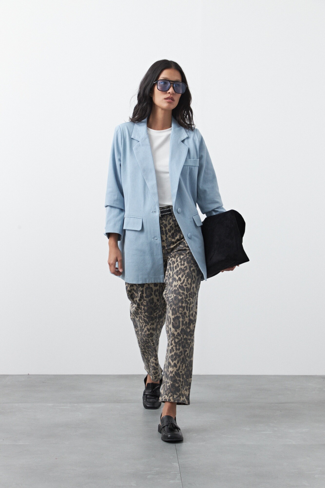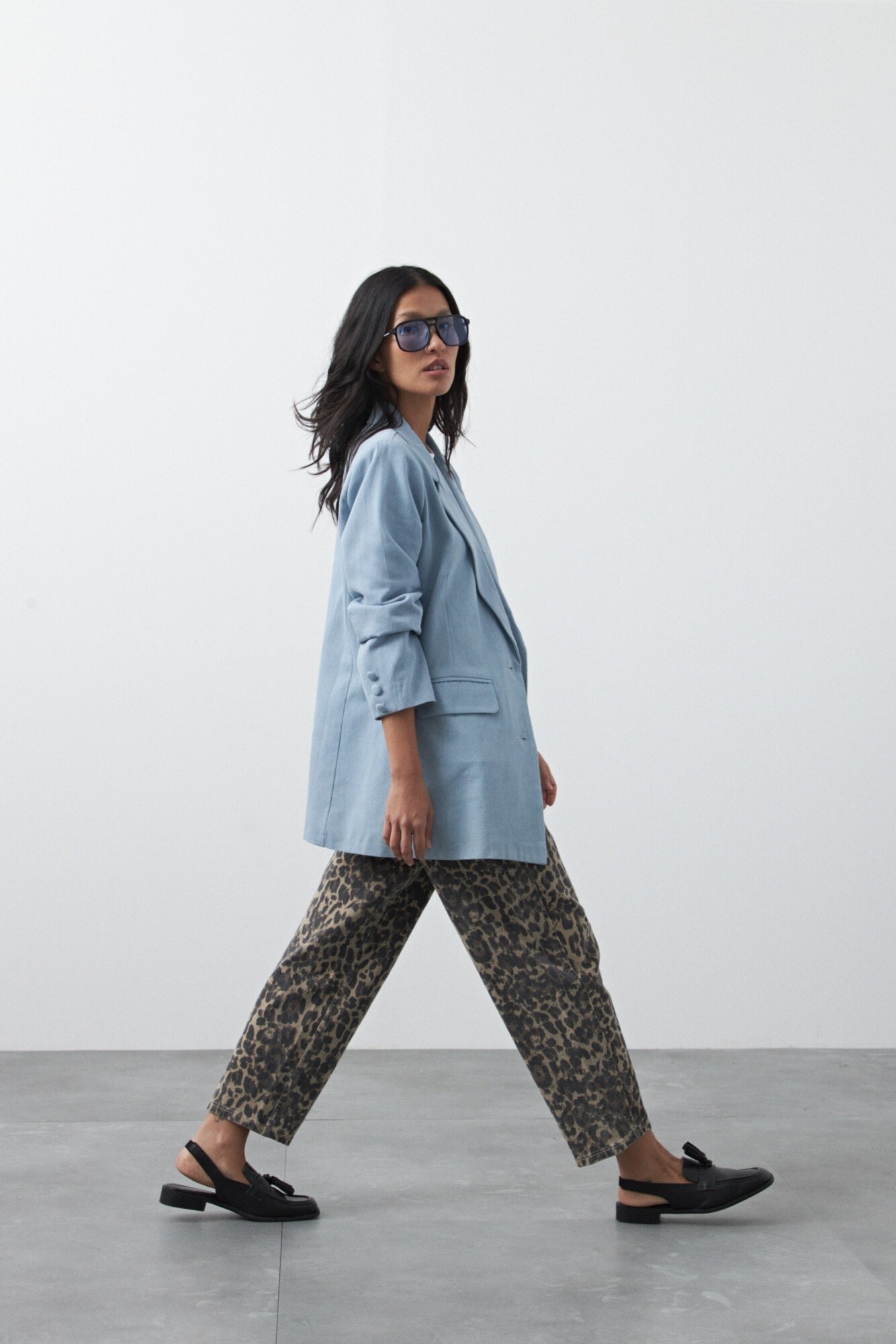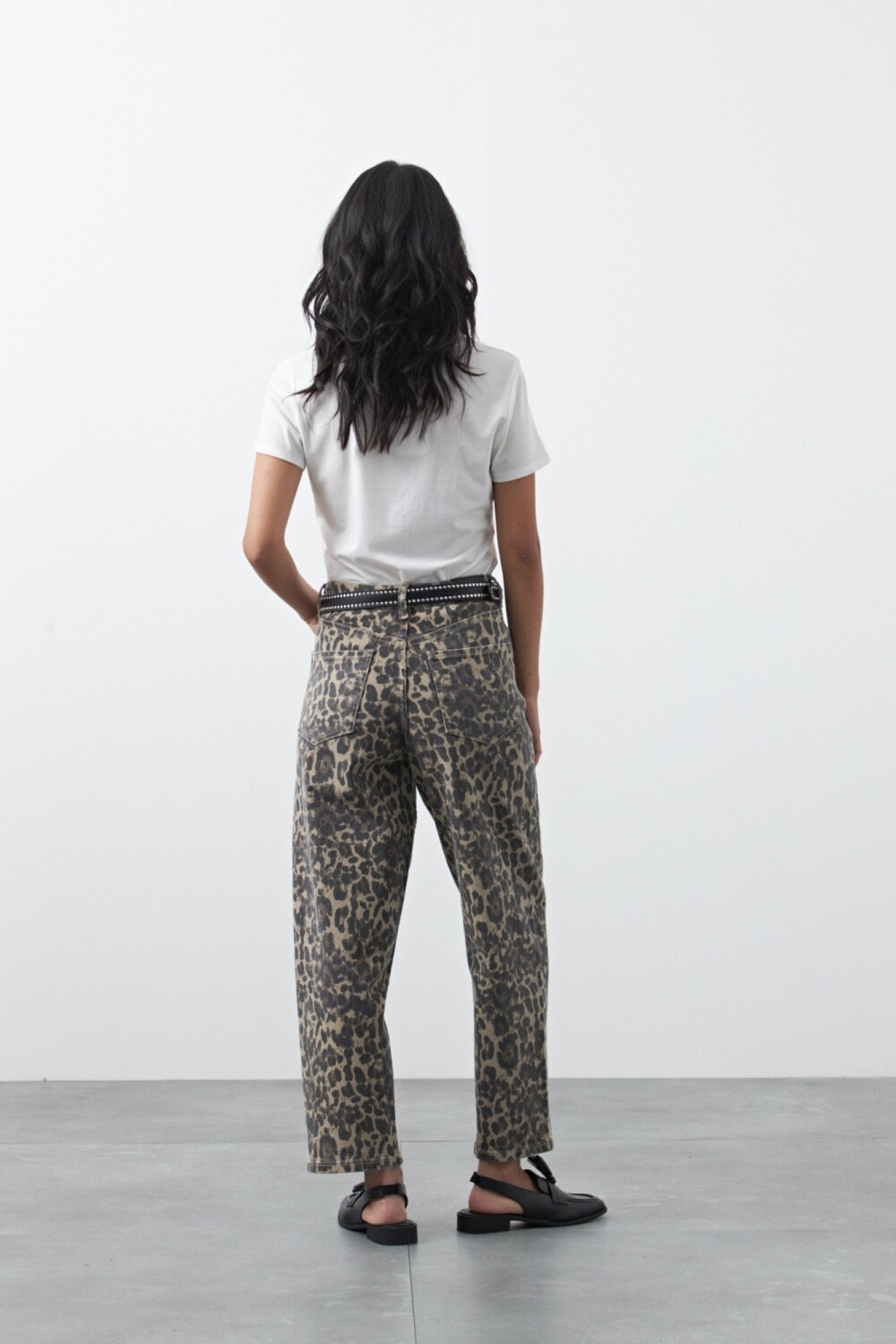 Pantalón animal print de fit barrel, con silueta curvada que aporta volumen controlado y un aire moderno al clásico denim estampado. Su tiro medio–alto define la cintura, mientras que la pierna levemente abombada y el bajo más ajustado crean una estructura distintiva y en tendencia.