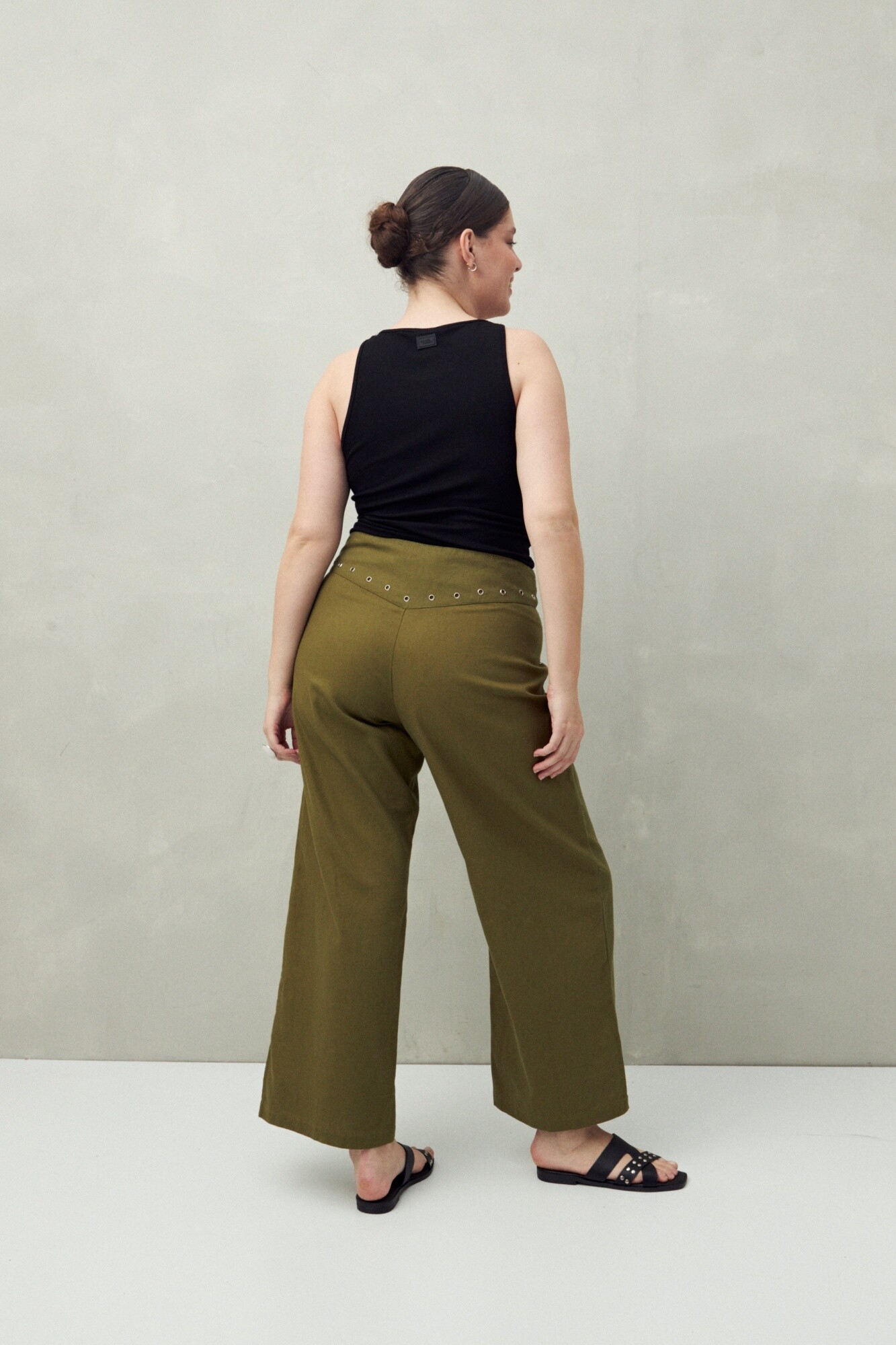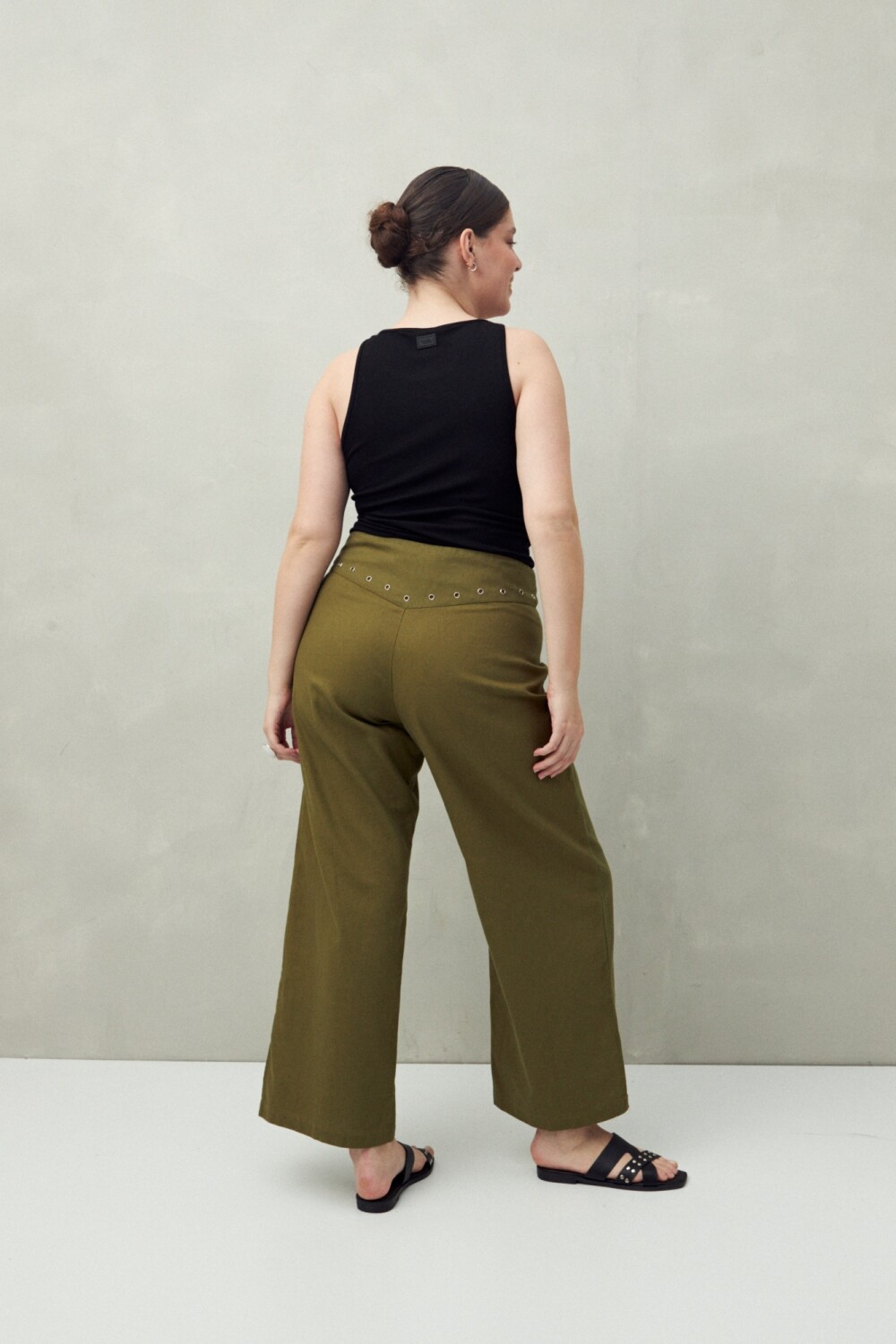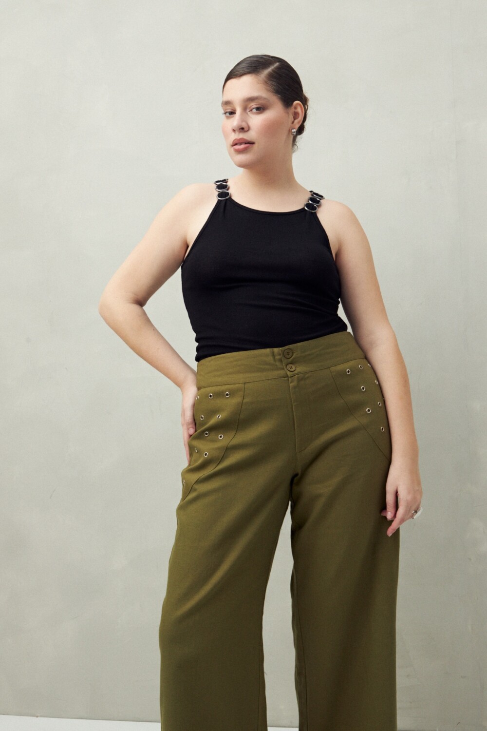 20 Pantalón de tiro medio confeccionado en algodón con detalle de ojalillos metálicos en los laterales, que aportan un guiño contemporáneo y urbano. Su silueta amplia y estructura firme lo convierten en una opción cómoda y versátil para looks diarios con carácter.
