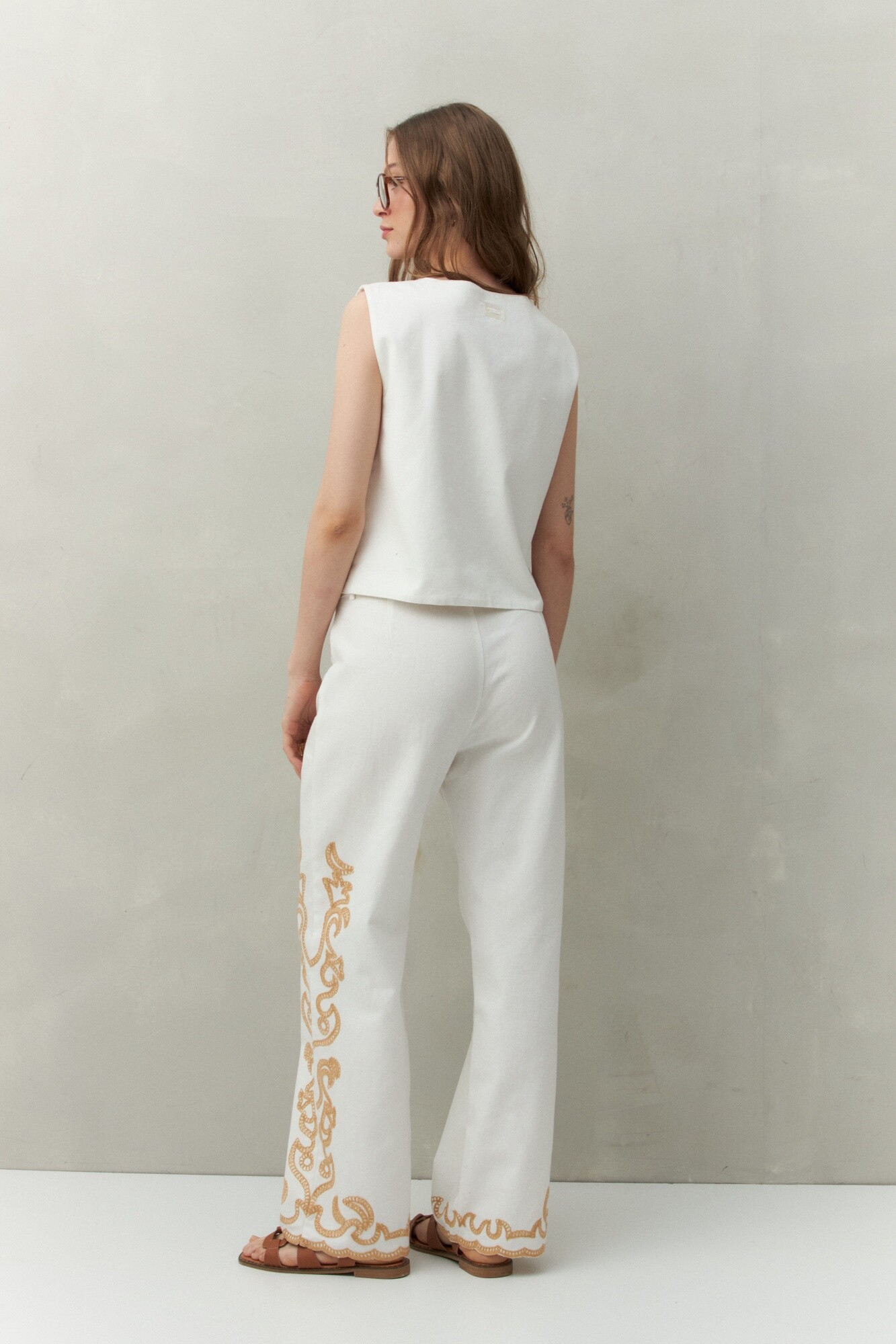 Pantalón recto de algodón con bordado artesanal a contratono en los laterales y ruedo. Su caída fluida y los detalles bordados le aportan un aire bohemio y relajado, ideal para combinar con tops livianos o camisas sueltas en looks de espíritu libre.