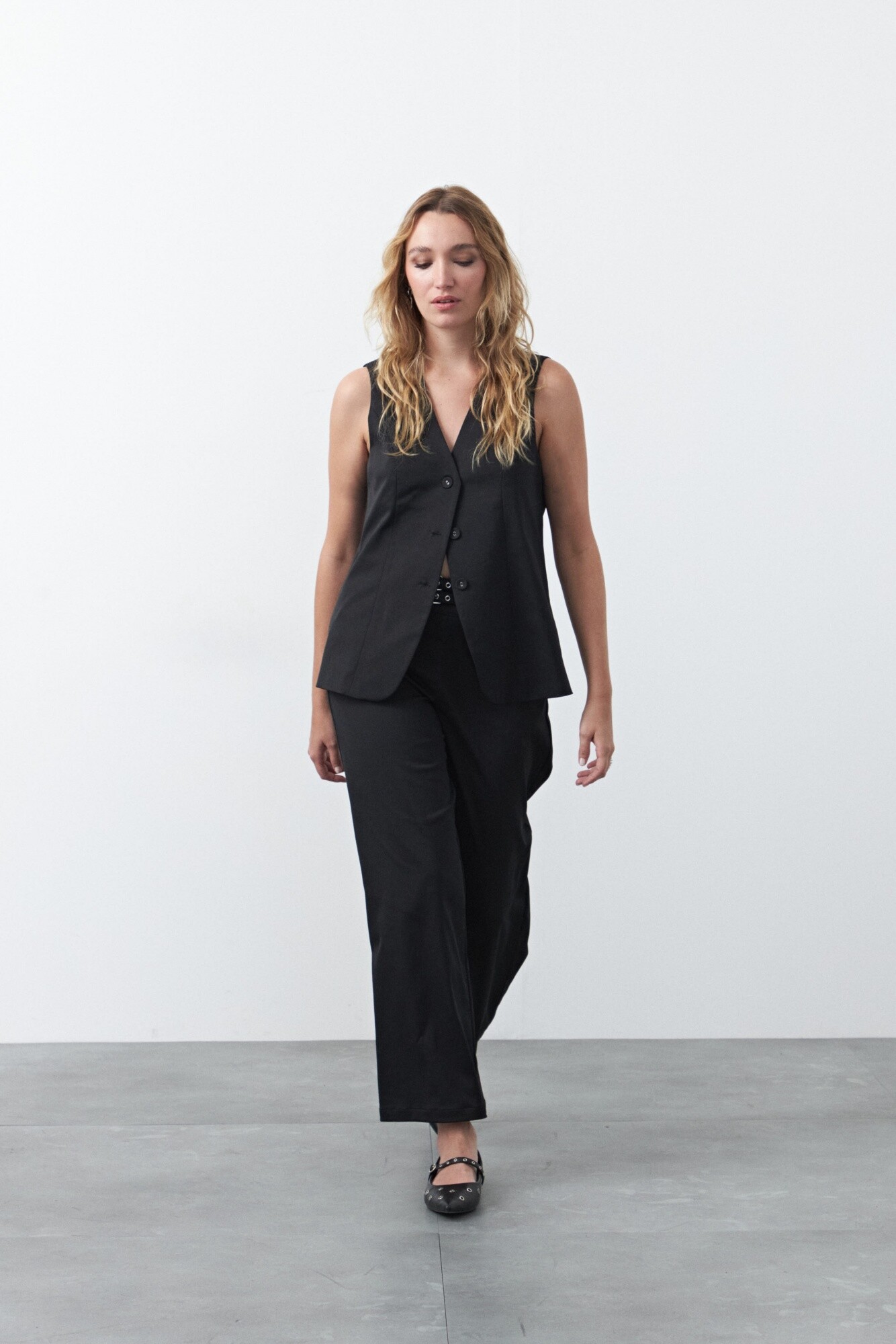 Pantalón ancho de tiro medio y calce relajado, diseñado para estilizar la silueta a través de una caída fluida y una línea amplia que acompaña el movimiento. Su estructura limpia y el detalle de hebillas laterales con ojales metálicos en la cintura aportan un guiño moderno que eleva la prenda y suma carácter.