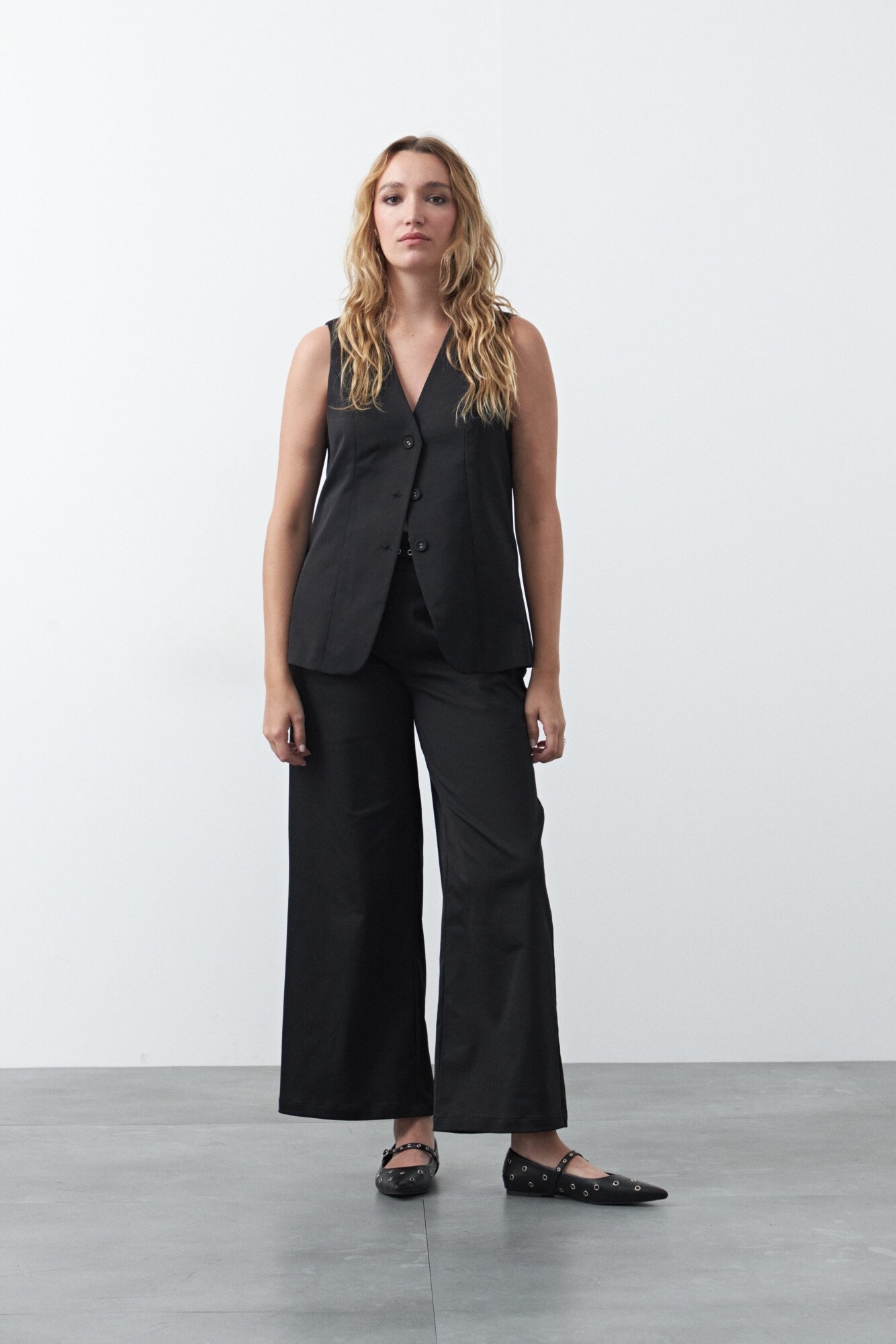 El tejido con cuerpo mantiene la forma y realza el volumen del wide leg, logrando un equilibrio entre sastrería y actitud urbana. Ideal para combinar con chalecos, blazers o tops más ajustados y crear looks en tendencia con una impronta sofisticada.