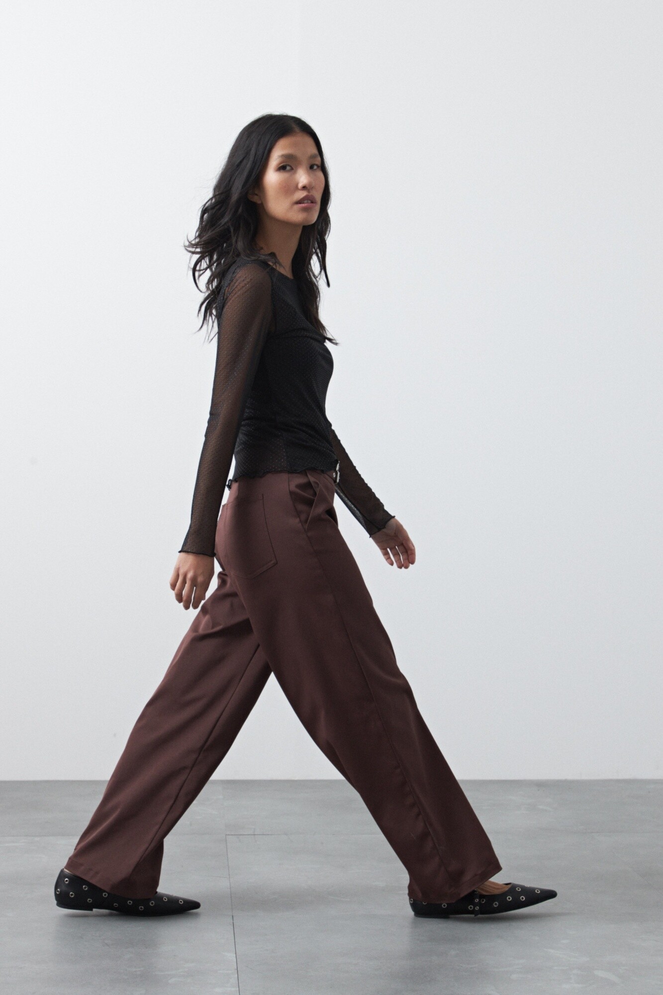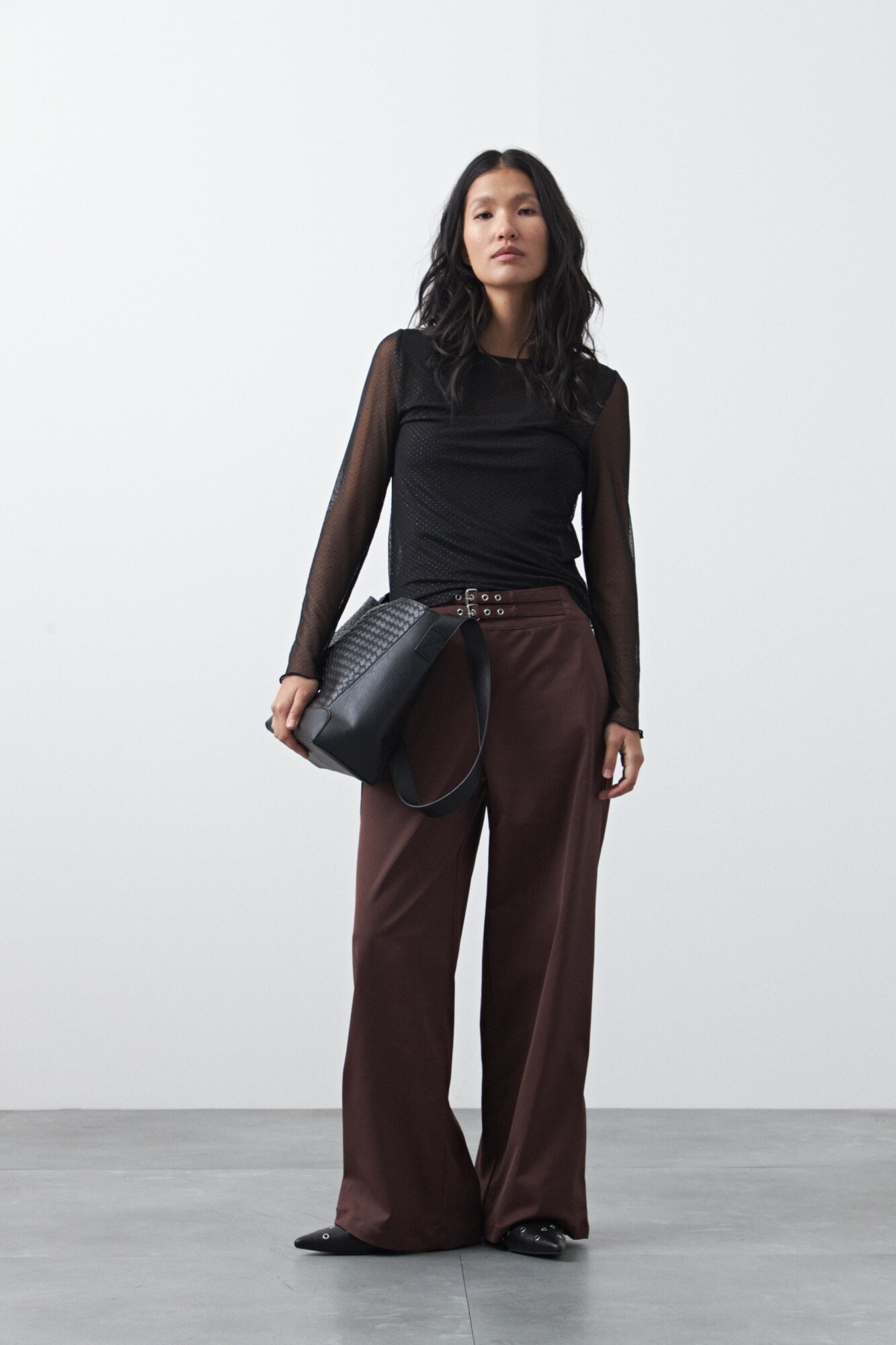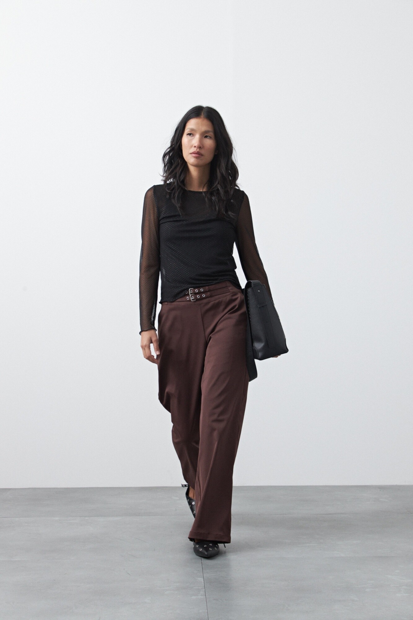 Pantalón ancho de tiro medio y calce relajado, diseñado para estilizar la silueta a través de una caída fluida y una línea amplia que acompaña el movimiento. Su estructura limpia y el detalle de hebillas laterales con ojales metálicos en la cintura aportan un guiño moderno que eleva la prenda y suma carácter.