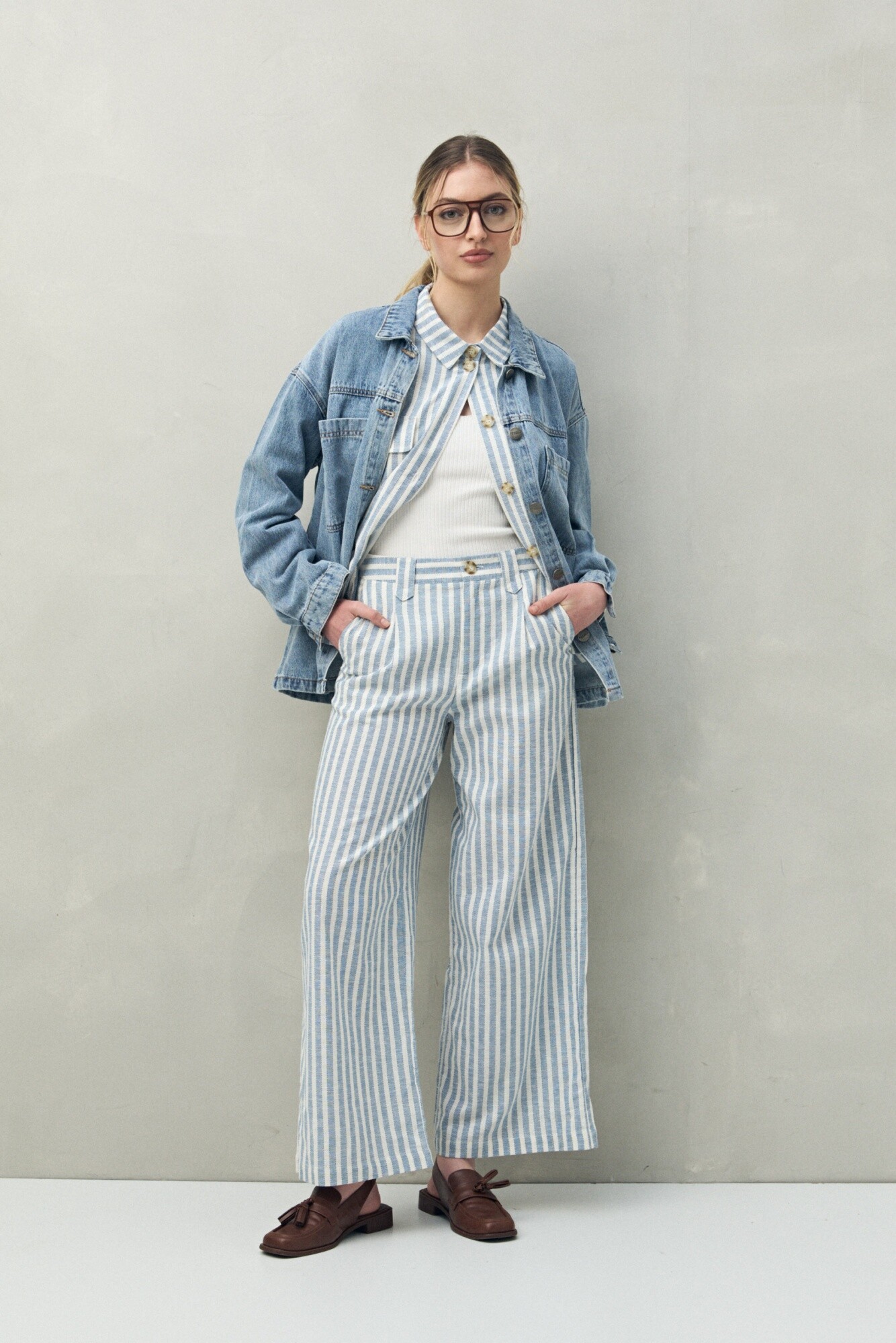 Con un calce amplio y relajado, este pantalón flare combina comodidad y estilo en una versión ideal para el día a día. Su textura natural aporta frescura y movimiento, mientras que las rayas verticales estilizan la figura y suman un aire casual chic. Perfecto para combinar con camisas livianas o tops básicos y crear un look urbano con un toque effortless.