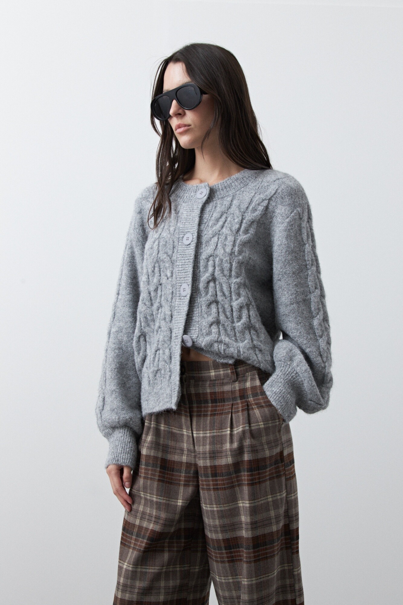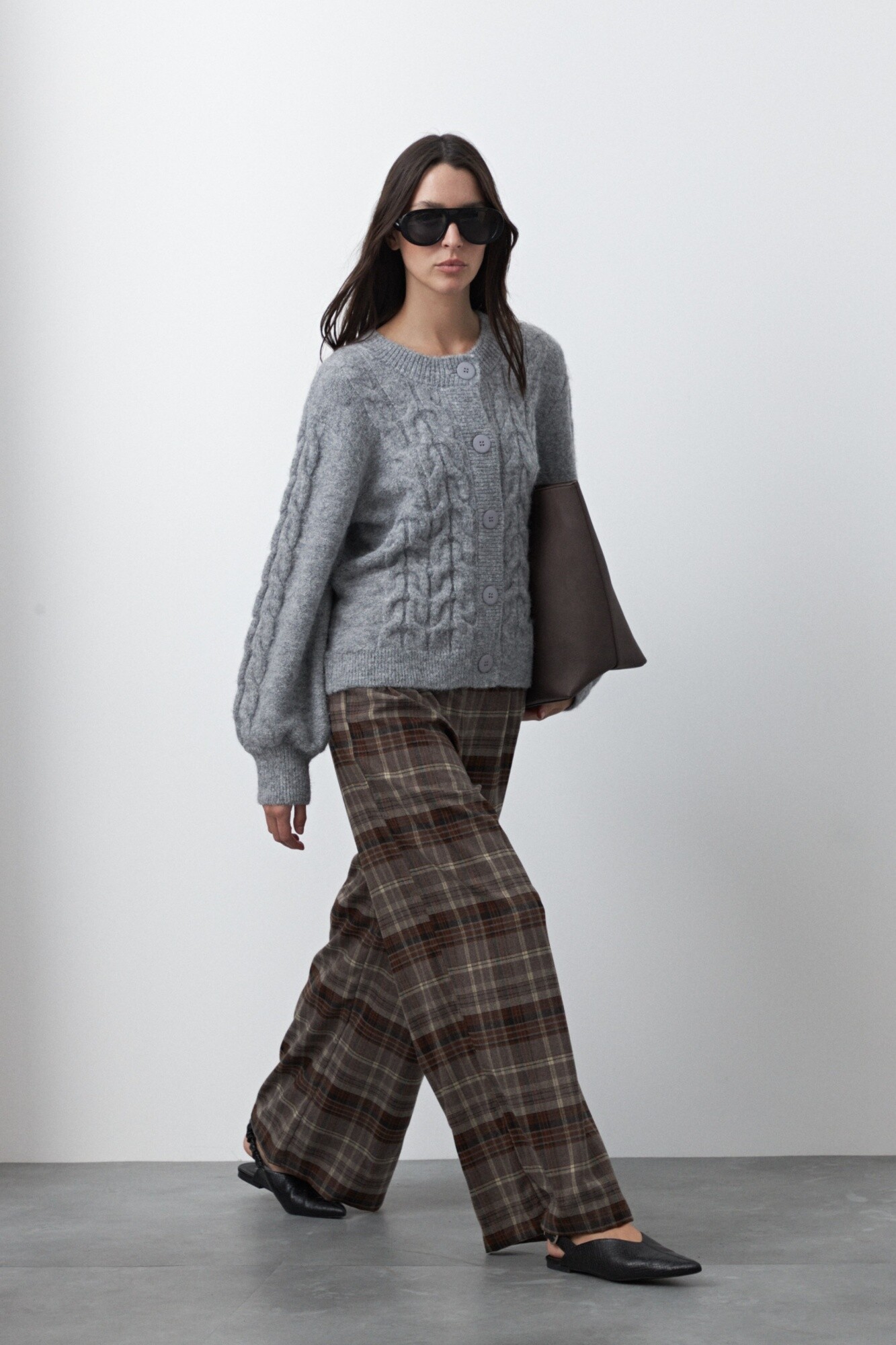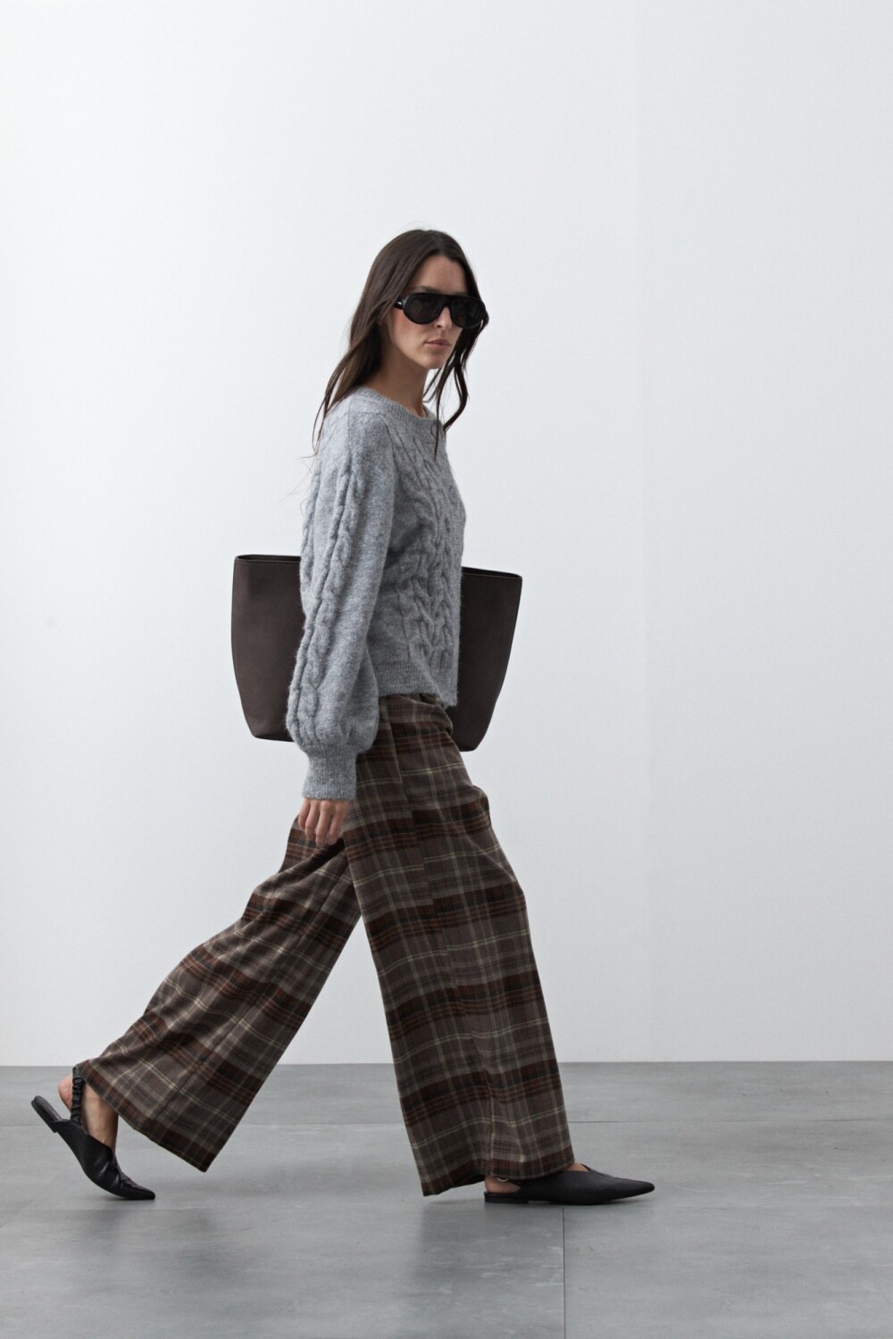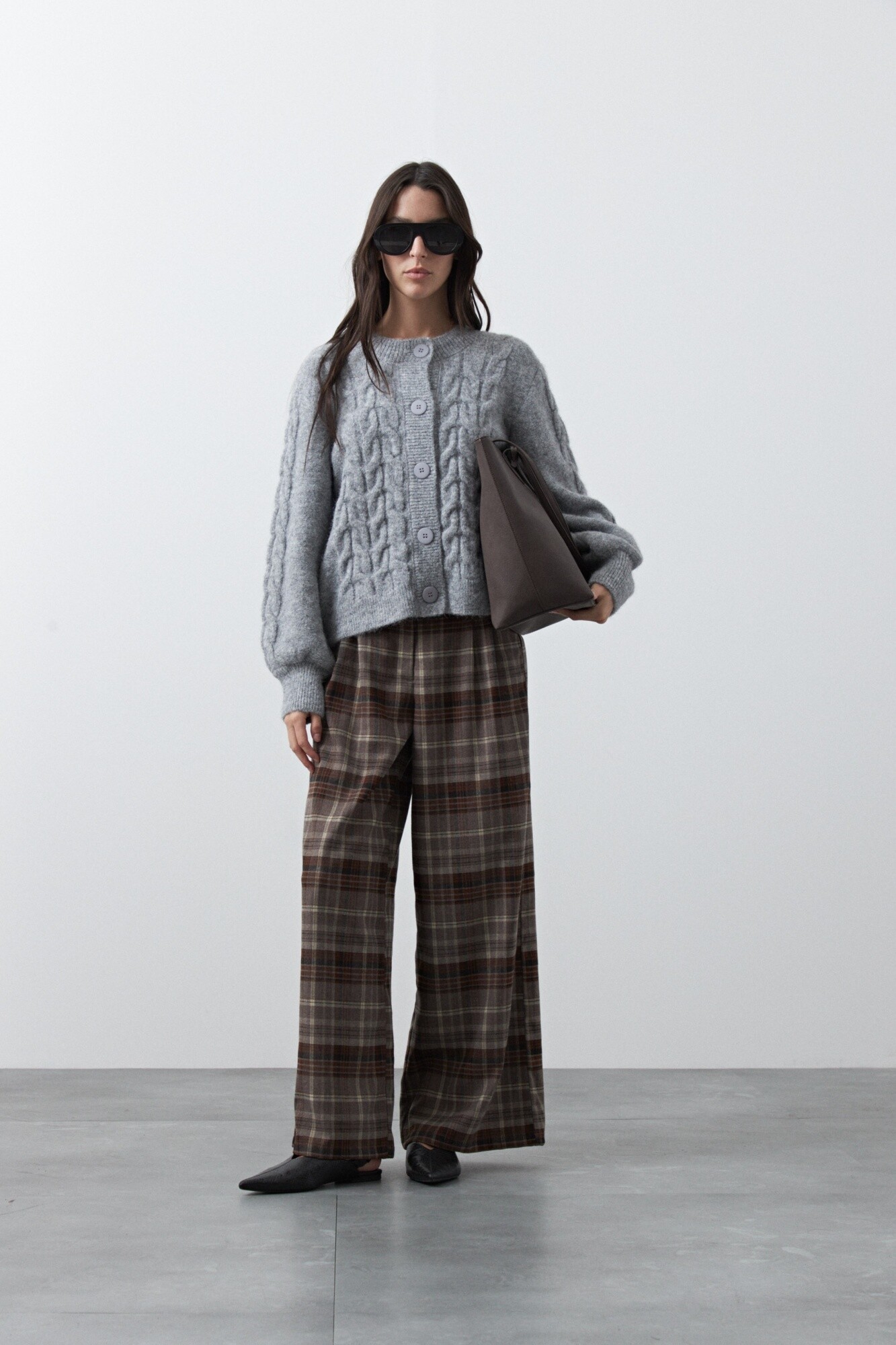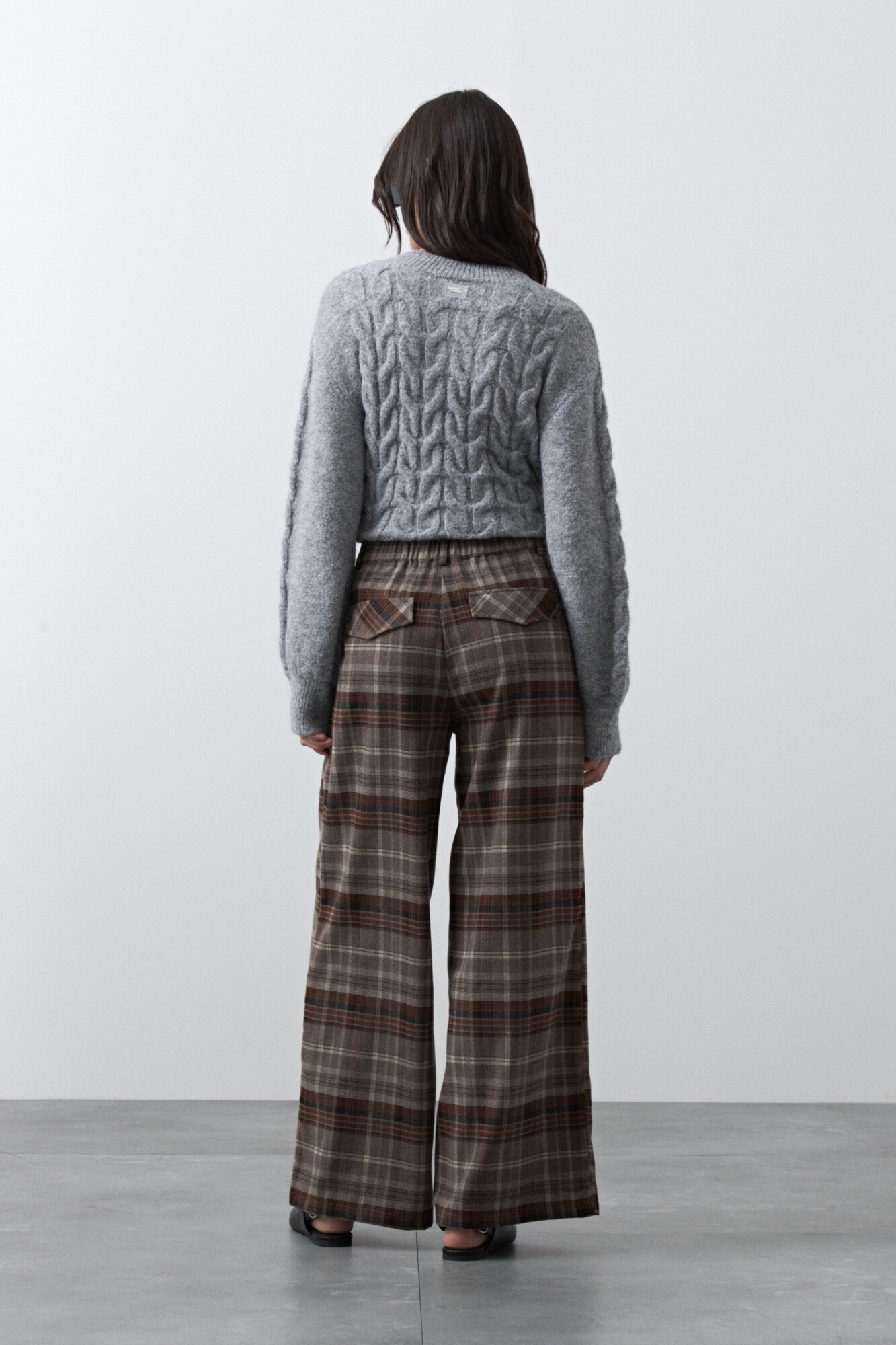 Pantalón a cuadros wide leg de estética sastrera y aire clásico renovado, donde el patrón plaid vuelve a posicionarse como protagonista de la temporada. Su silueta amplia aporta movimiento y sofisticación, mientras que el diseño de tiro alto estiliza y equilibra la figura.
