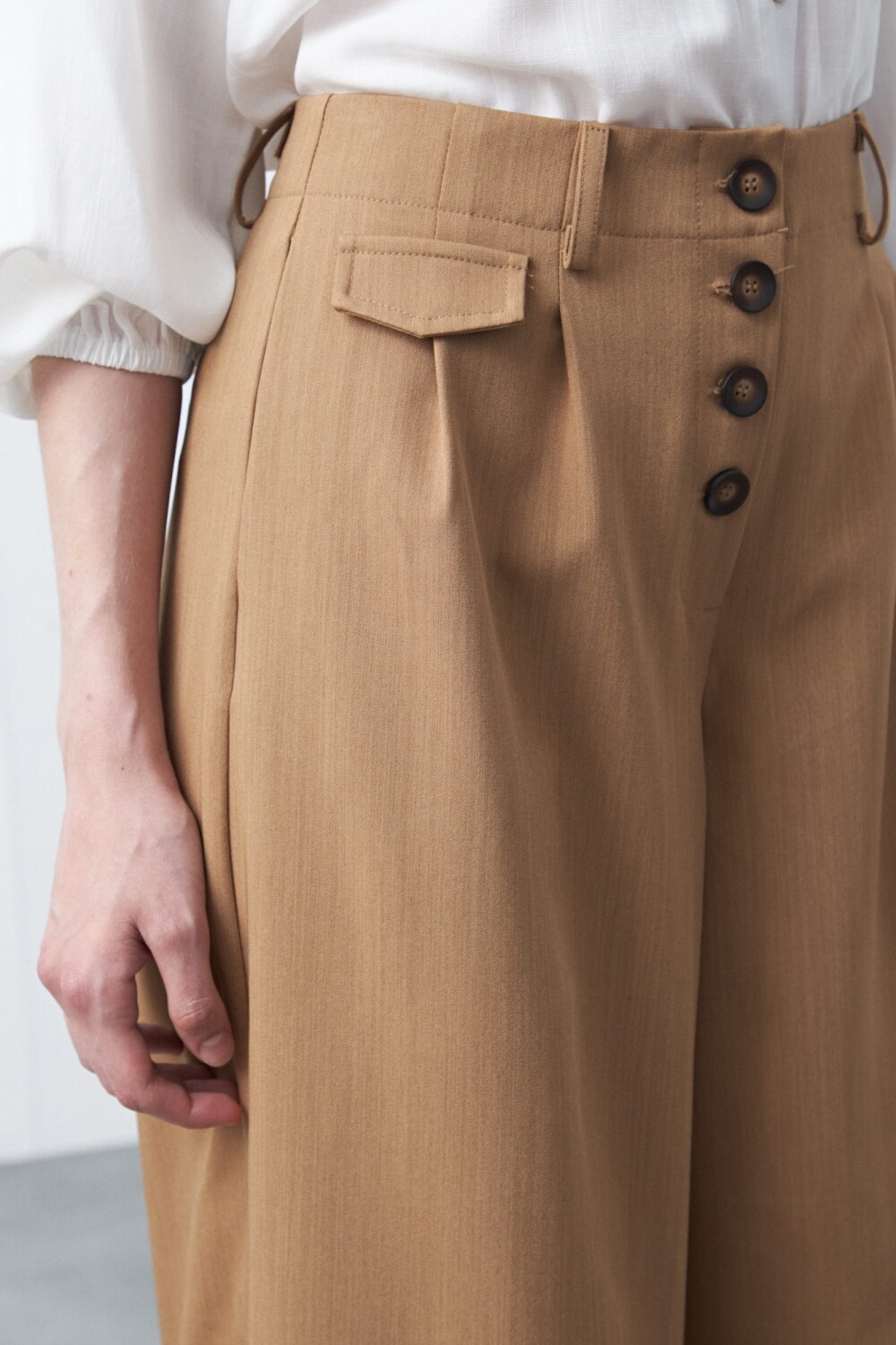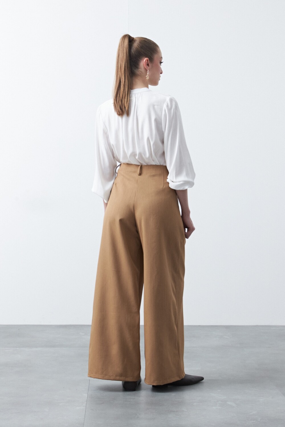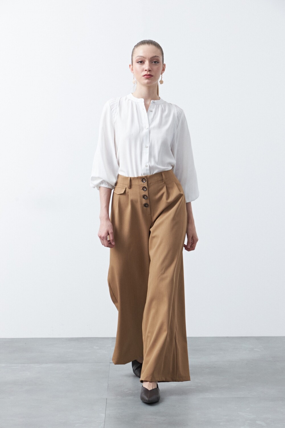 Pantalón wide leg de tiro alto con caída fluida y silueta amplia que estiliza la figura. El diseño presenta cintura alta con botonadura frontal visible, detalle que aporta un aire sastrero y ordena visualmente el calce. La pierna ancha acompaña el movimiento sin perder prolijidad, logrando un equilibrio ideal entre comodidad y elegancia. Un modelo versátil, clave para elevar cualquier look, tanto en estilismos de oficina como en propuestas más urbanas.
