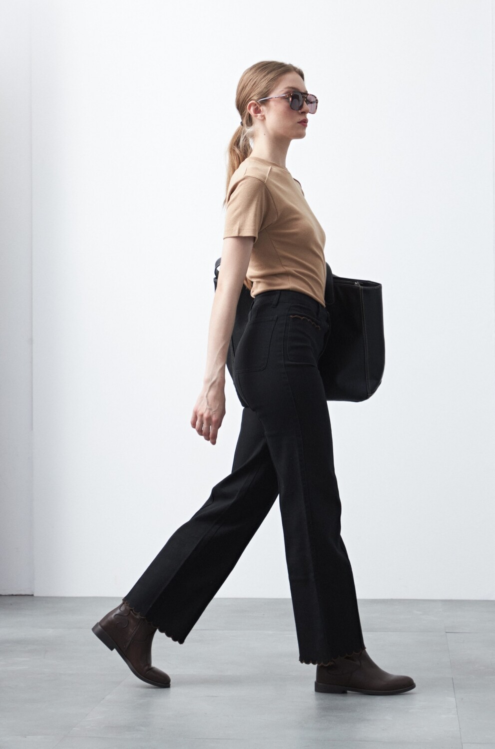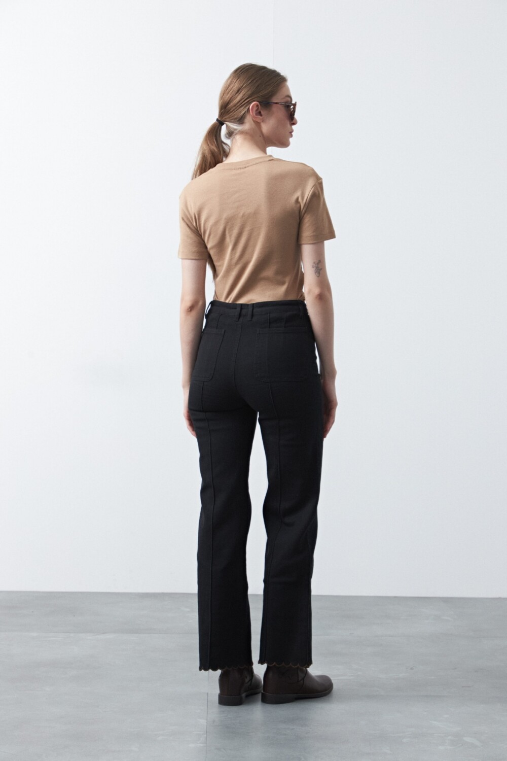 Pantalón de fit recto confeccionado en cotton spandex, con una estructura que equilibra confort y definición. Presenta costuras visibles que recorren la prenda y ayudan a estilizar la pierna, aportando un detalle de diseño sutil pero distintivo. Los bordados decorativos suman identidad y terminación artesanal, elevando el diseño sin perder versatilidad. Ideal para looks de día con impronta cuidada o para combinaciones más armadas.