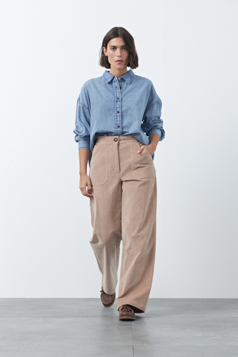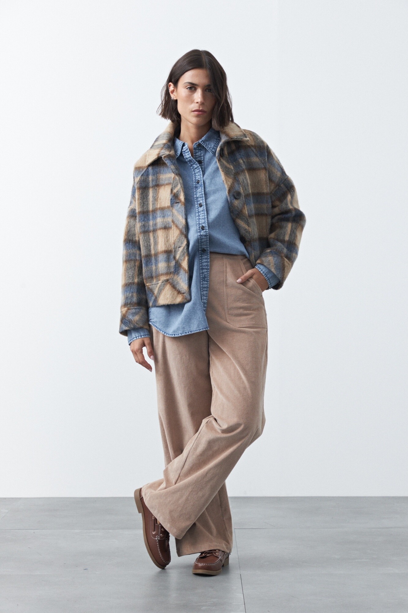 20 Pantalón de pana fit flare de inspiración retro que vuelve a escena como uno de los fits clave de la temporada. Su silueta entallada en cadera y leve apertura hacia el bajo estiliza la figura y aporta equilibrio al look.