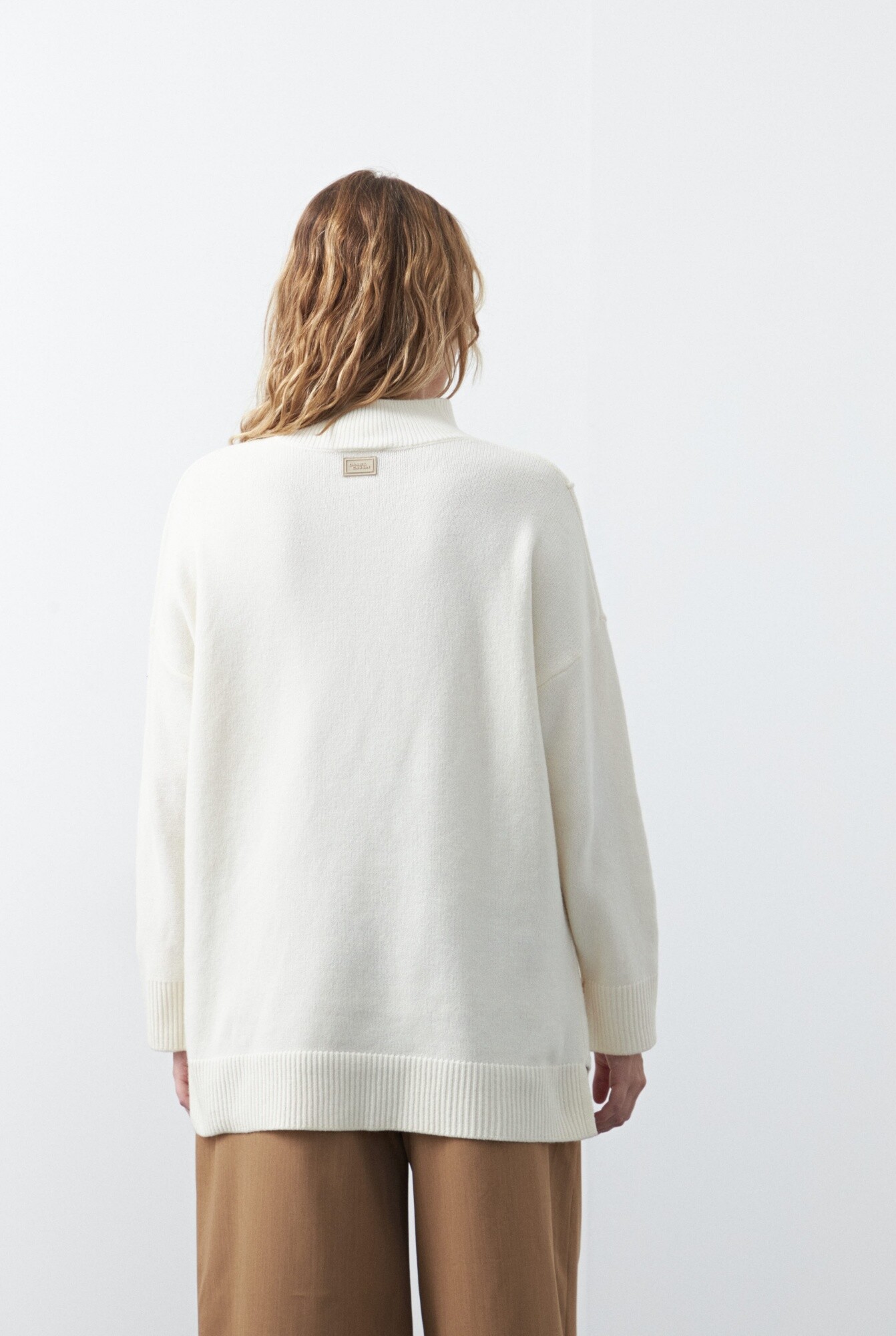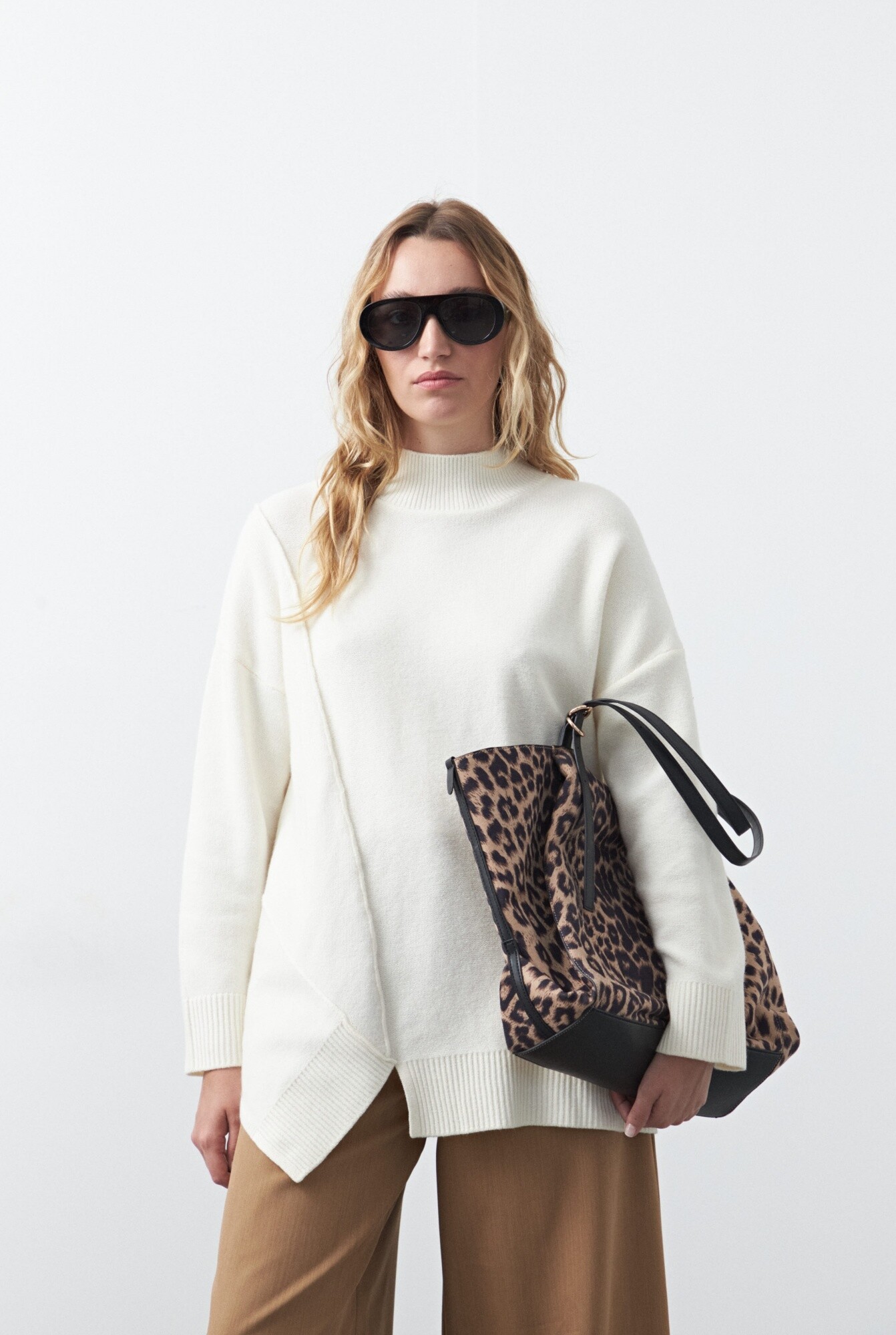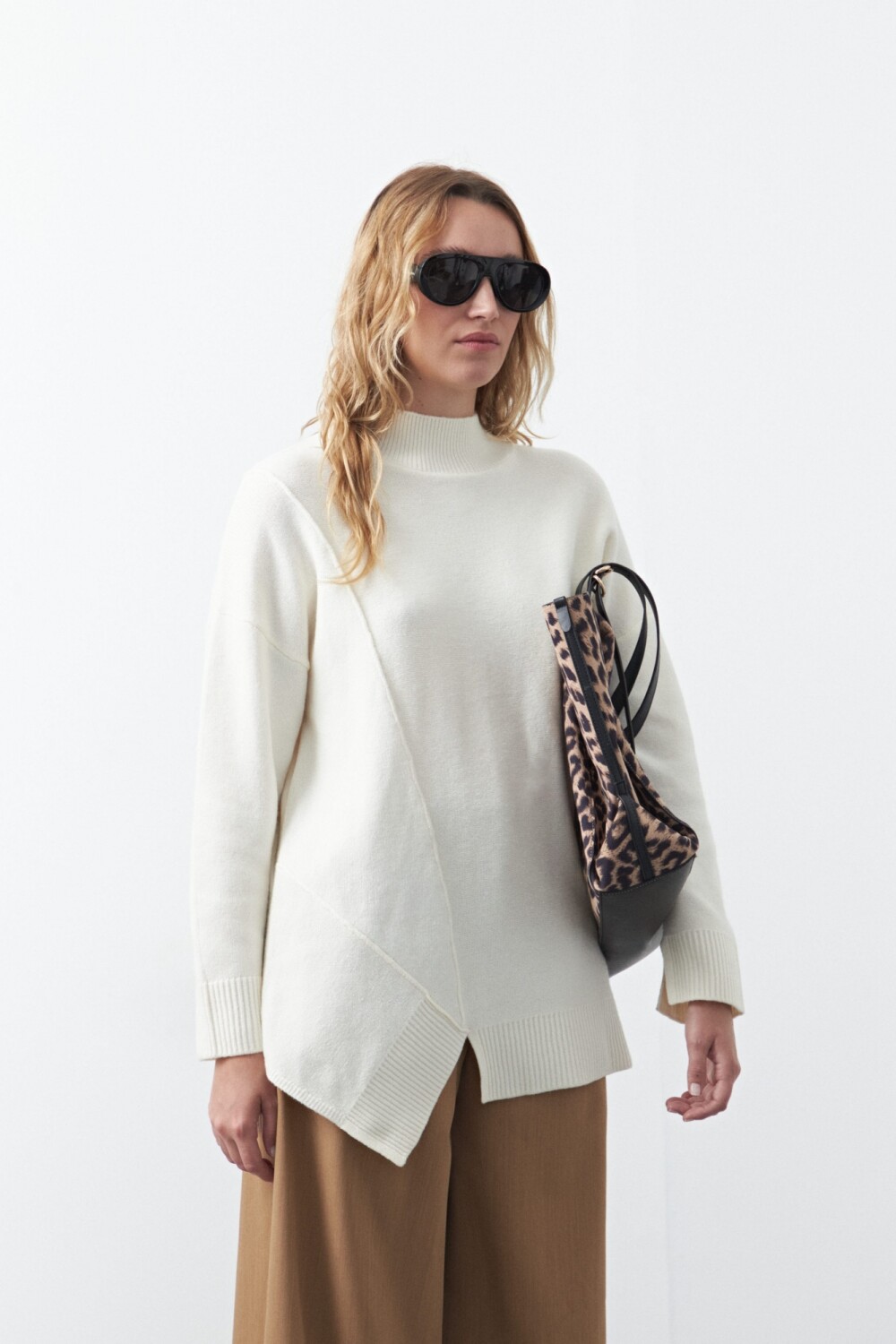 Polera oversized de tejido suave y diseño asimétrico. Con silueta amplia y hombros caídos que aportan una estética relajada y contemporánea. Su diseño incorpora una costura diagonal en el frente que genera un efecto visual original, acompañado por terminaciones acanaladas en cuello, puños y ruedo que equilibran la prenda.