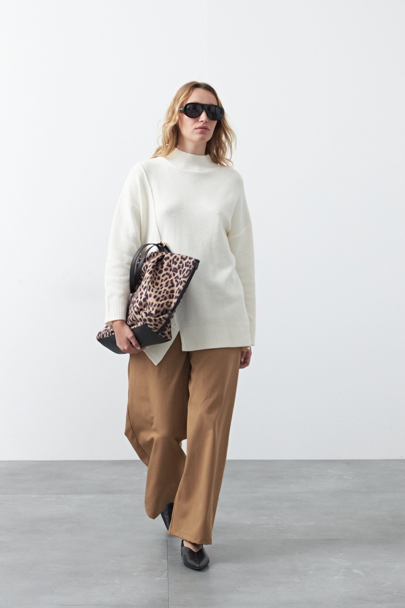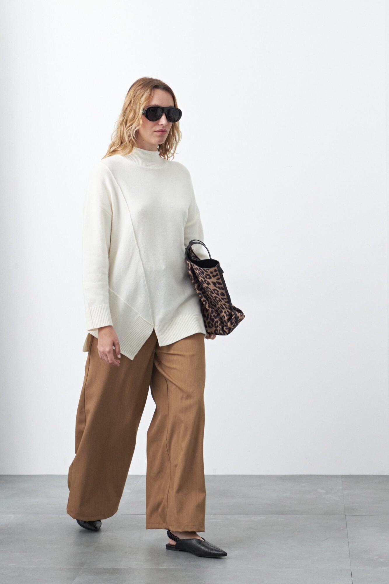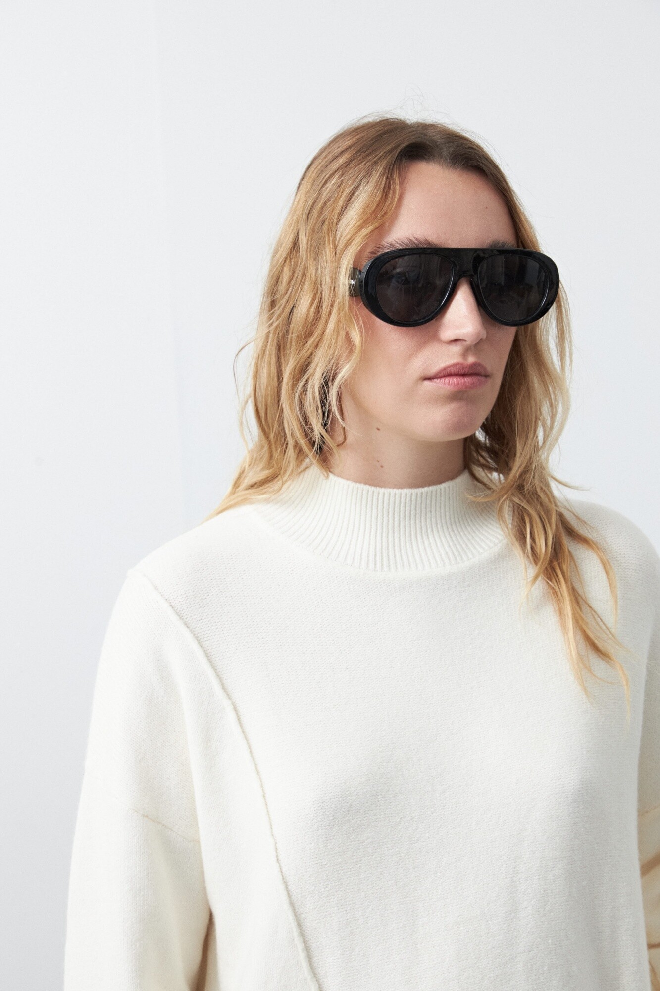 Polera oversized de tejido suave y diseño asimétrico. Con silueta amplia y hombros caídos que aportan una estética relajada y contemporánea. Su diseño incorpora una costura diagonal en el frente que genera un efecto visual original, acompañado por terminaciones acanaladas en cuello, puños y ruedo que equilibran la prenda.