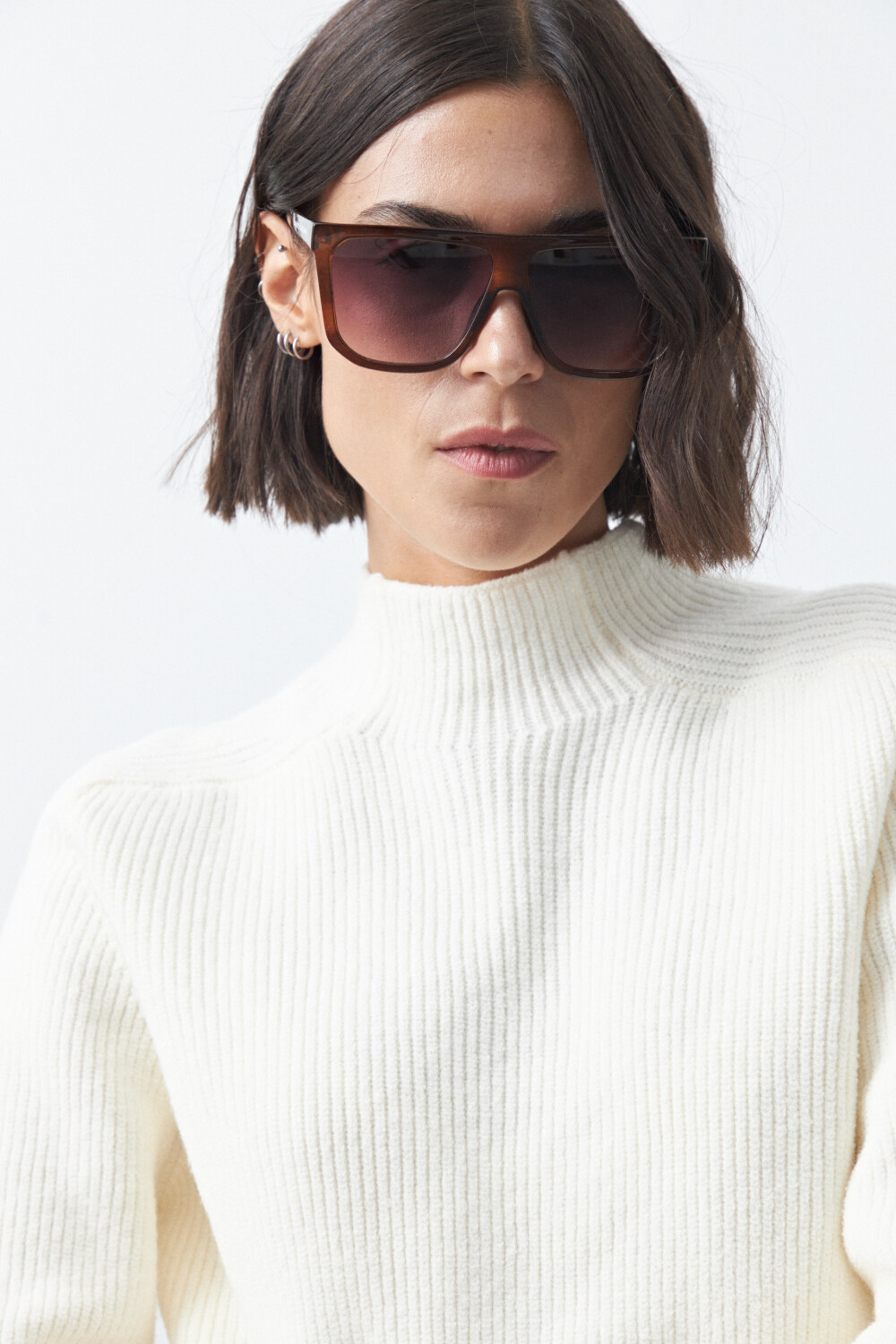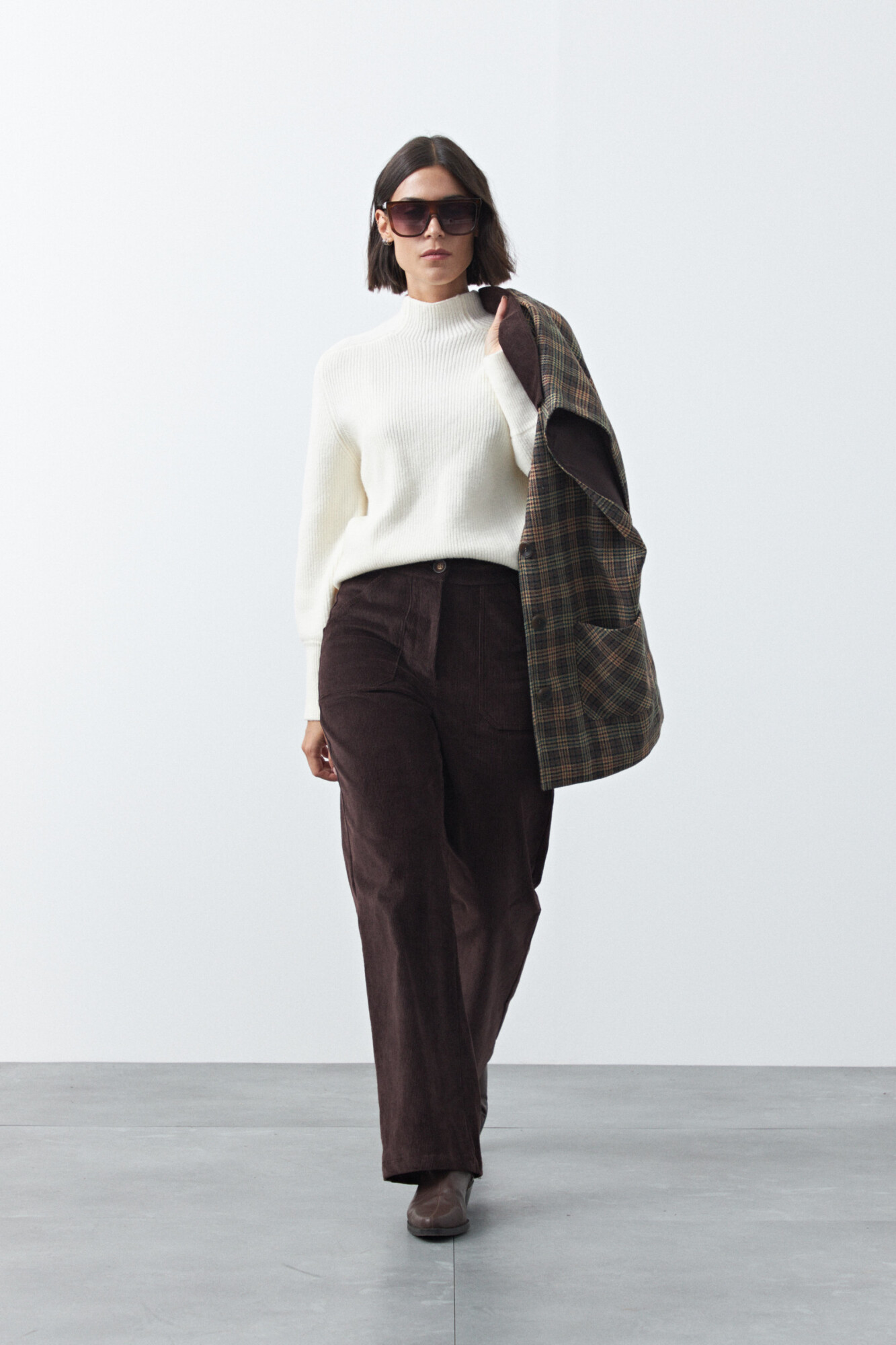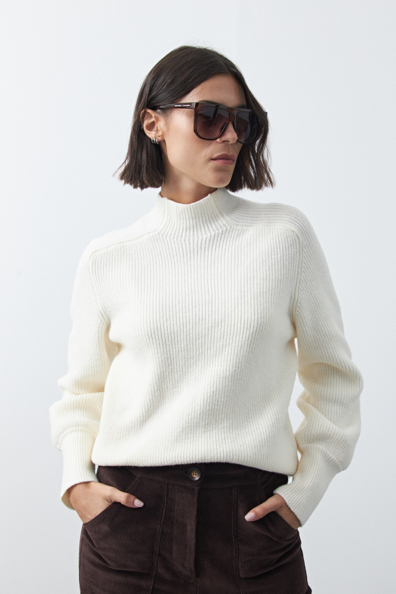 20 Polera tejida de silueta relajada con cuello alto, pensada para sumar abrigo con un look limpio y actual. Su diseño minimalista la convierte en un básico versátil, fácil de combinar tanto en outfits de oficina como en propuestas más casuales.