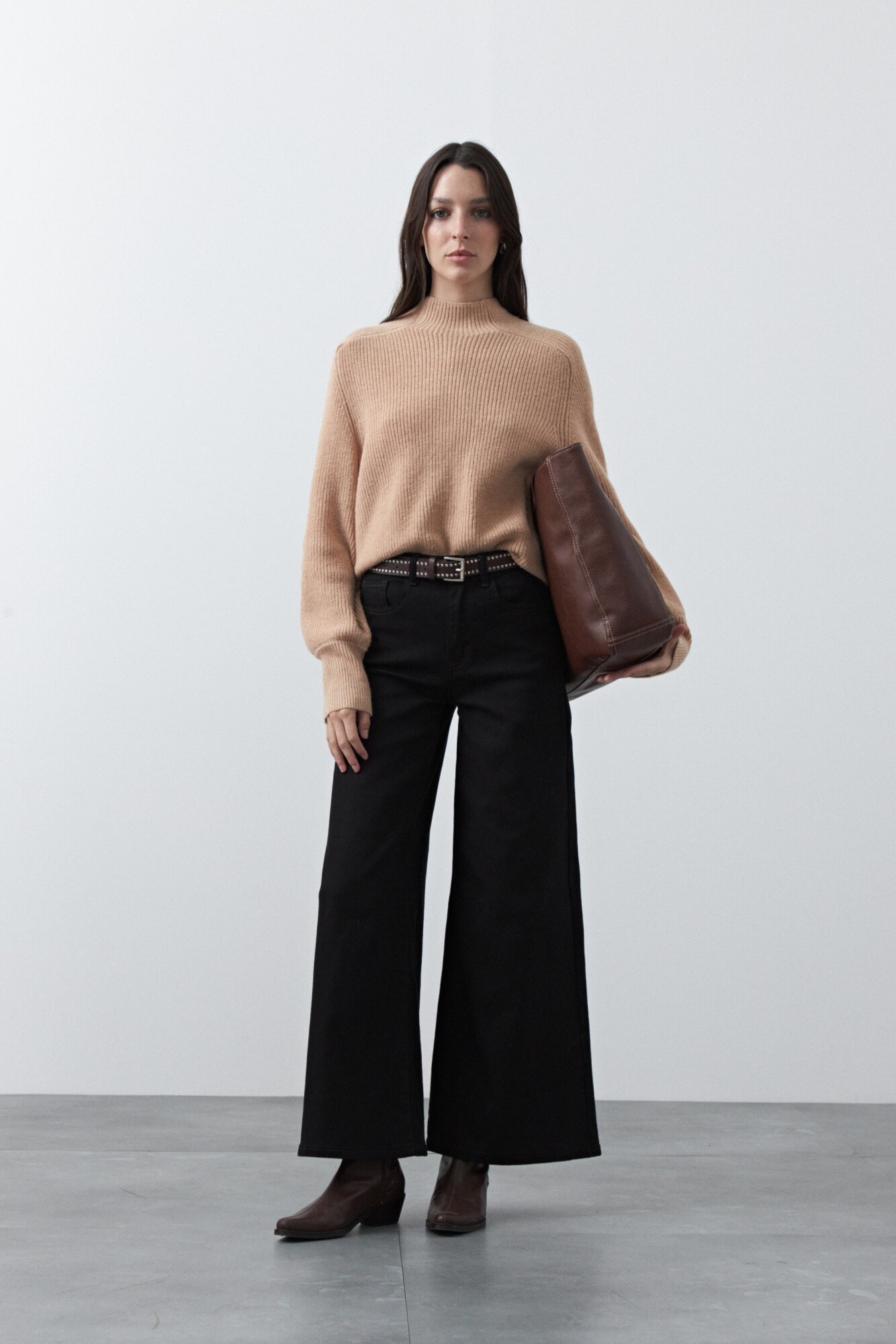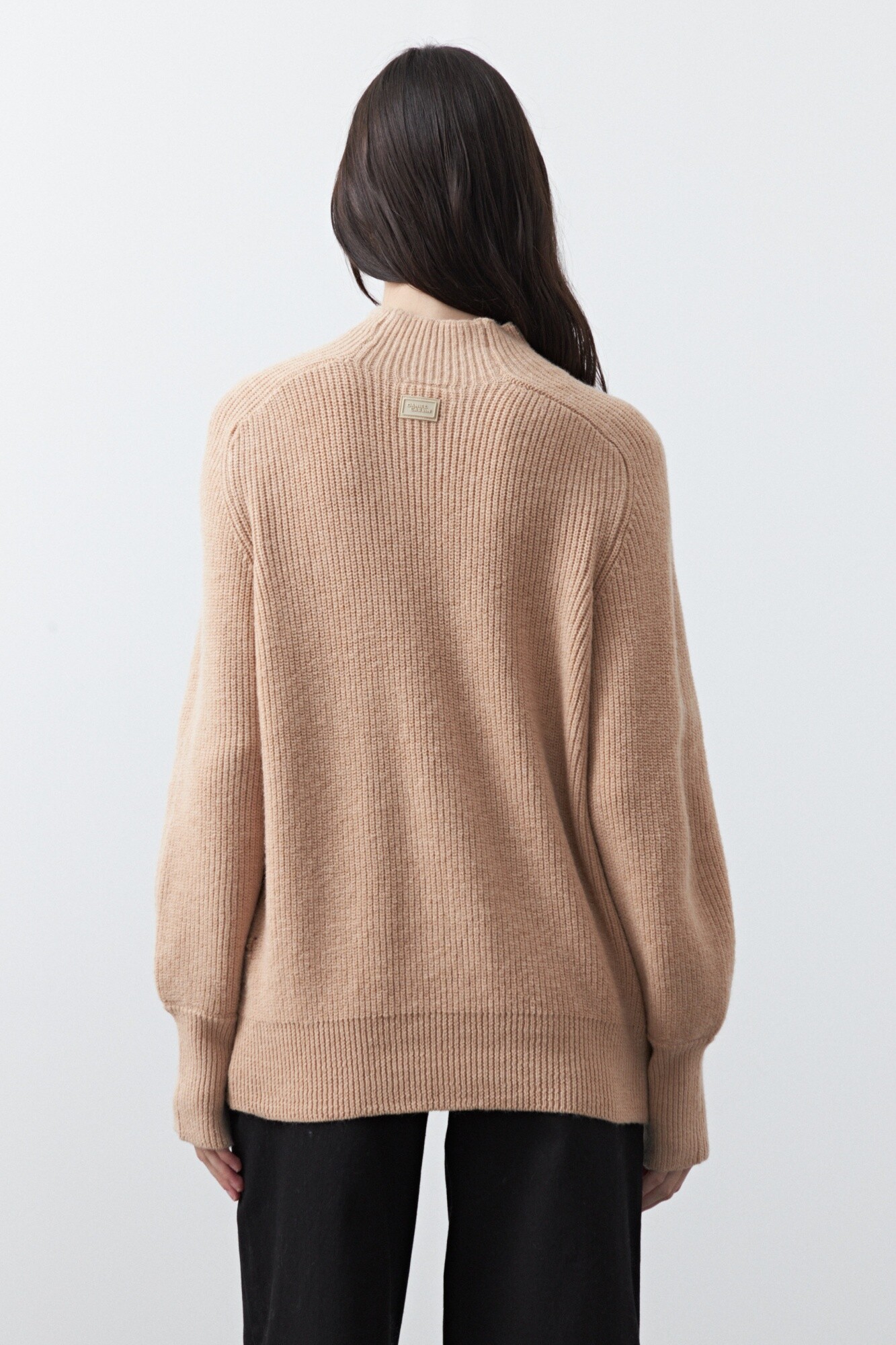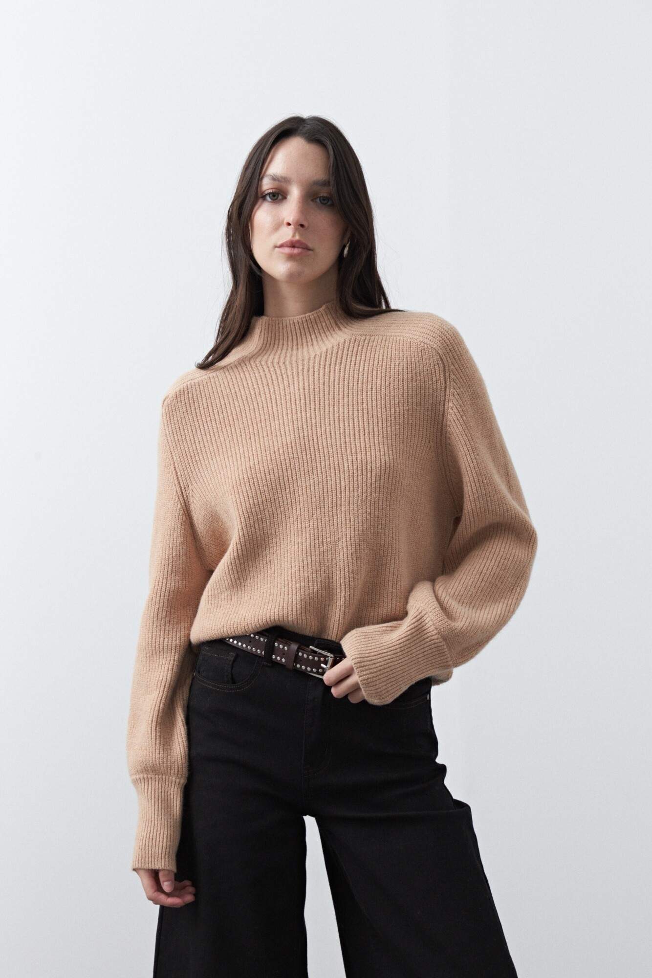 20 Polera tejida de silueta relajada con cuello alto, pensada para sumar abrigo con un look limpio y actual. Su diseño minimalista la convierte en un básico versátil, fácil de combinar tanto en outfits de oficina como en propuestas más casuales.
