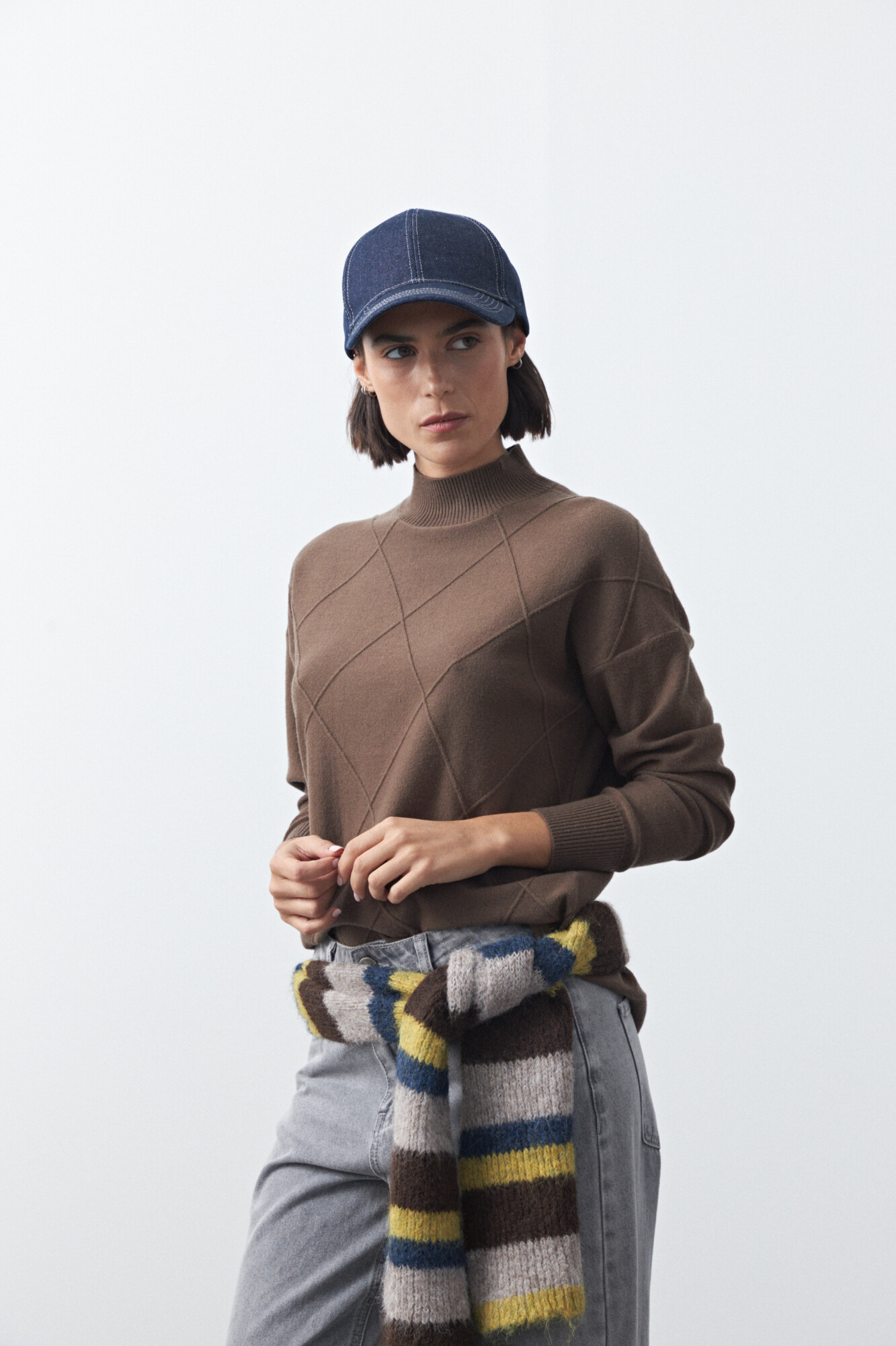 20 Polera tejida de cuello alto con diseño tramado en delantero que aporta textura y un diferencial sutil, elevando una silueta clásica. Su calce relajado y terminaciones en rib en cuello, puños y ruedo refuerzan la estructura, logrando una prenda versátil y en tendencia.
