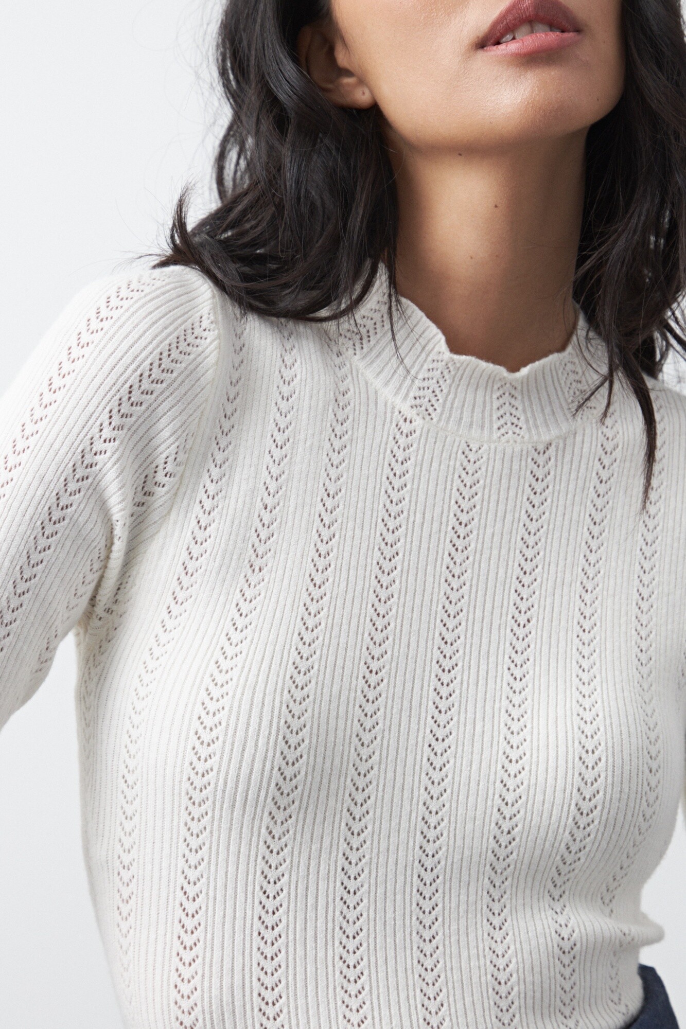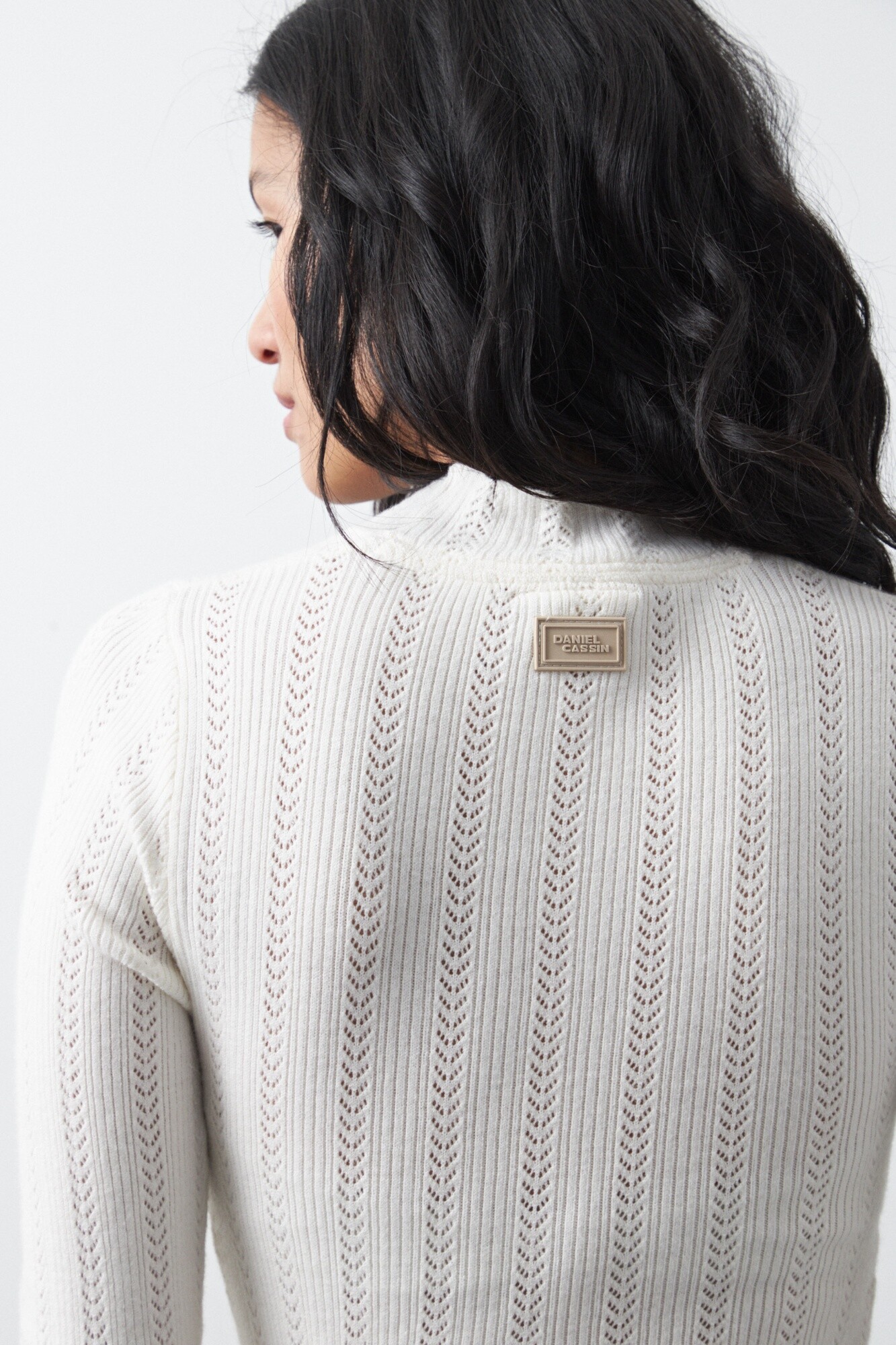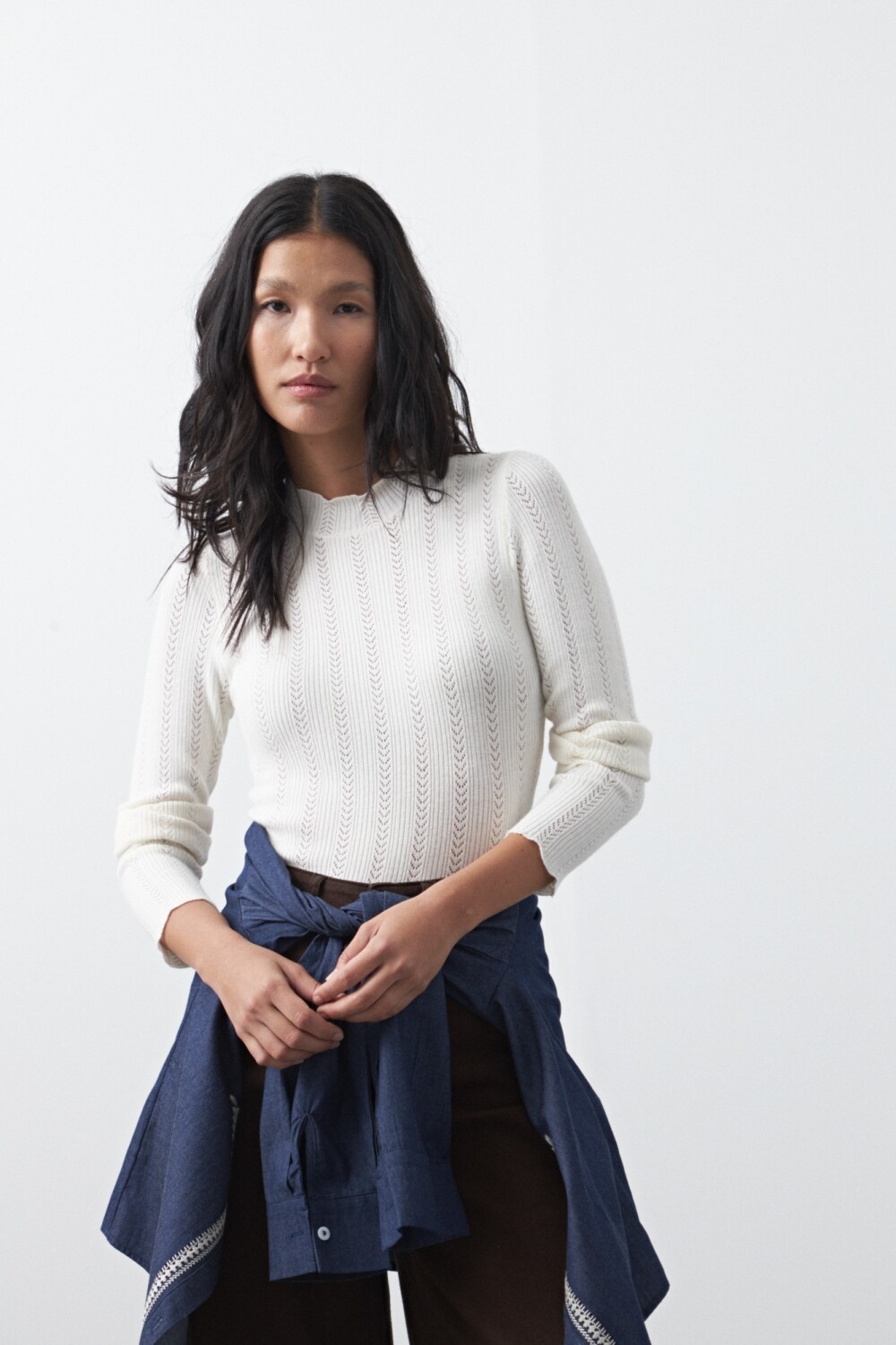 Polera tejida tramada con textura calada, de silueta entallada que acompaña el cuerpo con suavidad y elegancia. El diseño vertical combina líneas acanaladas con pequeños calados que aportan liviandad visual y un detalle sutil que la diferencia de una básica tradicional. El cuello levemente alto y los puños con terminación delicada refuerzan su impronta femenina y versátil. La mezcla de viscosa con nylon garantiza una mano suave, elasticidad confortable y excelente caída, ideal para usar sola o como primera capa bajo abrigos y blazers. Una pieza atemporal, en tendencia, que equilibra sofisticación y comodidad en partes iguales.