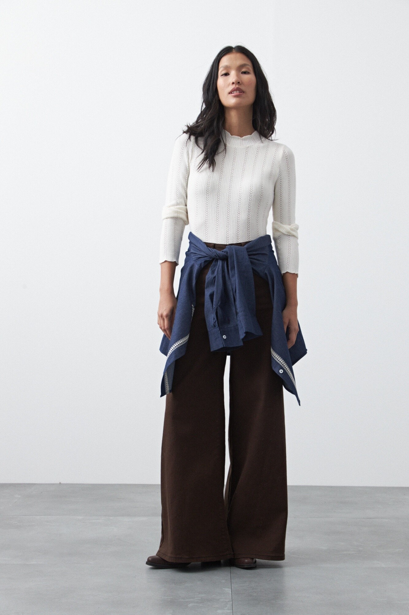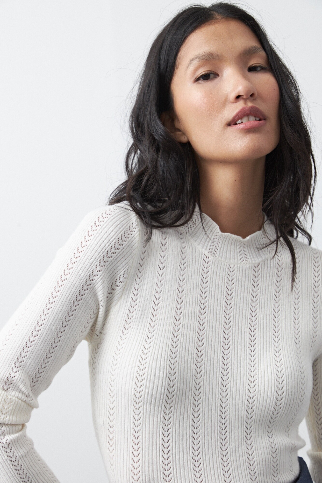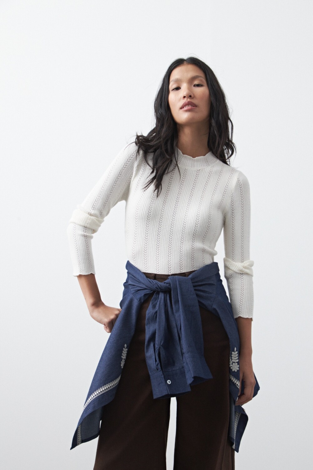 Polera tejida tramada con textura calada, de silueta entallada que acompaña el cuerpo con suavidad y elegancia. El diseño vertical combina líneas acanaladas con pequeños calados que aportan liviandad visual y un detalle sutil que la diferencia de una básica tradicional. El cuello levemente alto y los puños con terminación delicada refuerzan su impronta femenina y versátil. La mezcla de viscosa con nylon garantiza una mano suave, elasticidad confortable y excelente caída, ideal para usar sola o como primera capa bajo abrigos y blazers. Una pieza atemporal, en tendencia, que equilibra sofisticación y comodidad en partes iguales.