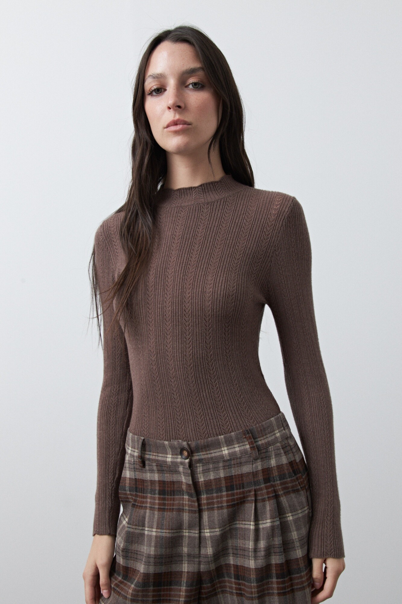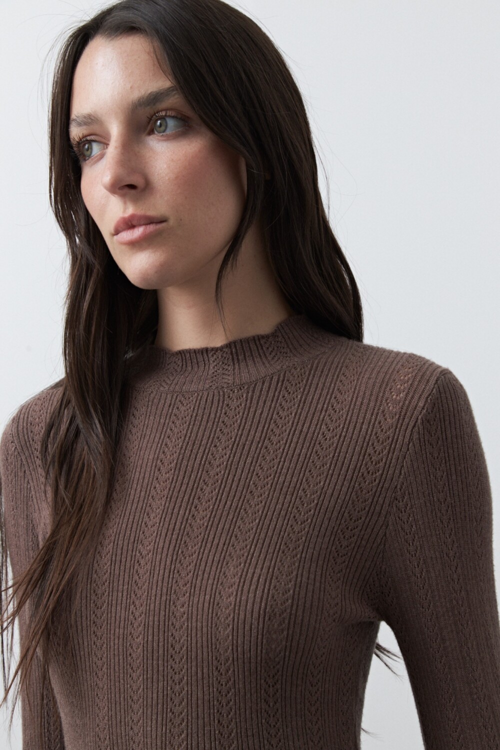 Polera tejida tramada con textura calada, de silueta entallada que acompaña el cuerpo con suavidad y elegancia. El diseño vertical combina líneas acanaladas con pequeños calados que aportan liviandad visual y un detalle sutil que la diferencia de una básica tradicional. El cuello levemente alto y los puños con terminación delicada refuerzan su impronta femenina y versátil. La mezcla de viscosa con nylon garantiza una mano suave, elasticidad confortable y excelente caída, ideal para usar sola o como primera capa bajo abrigos y blazers. Una pieza atemporal, en tendencia, que equilibra sofisticación y comodidad en partes iguales.