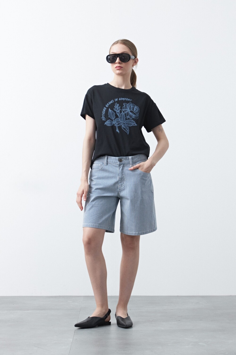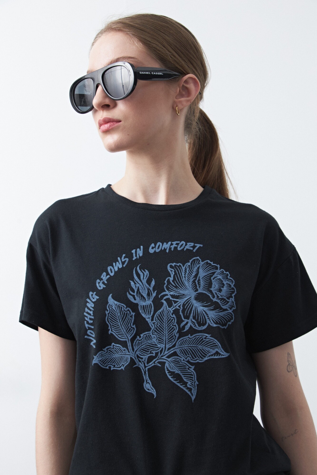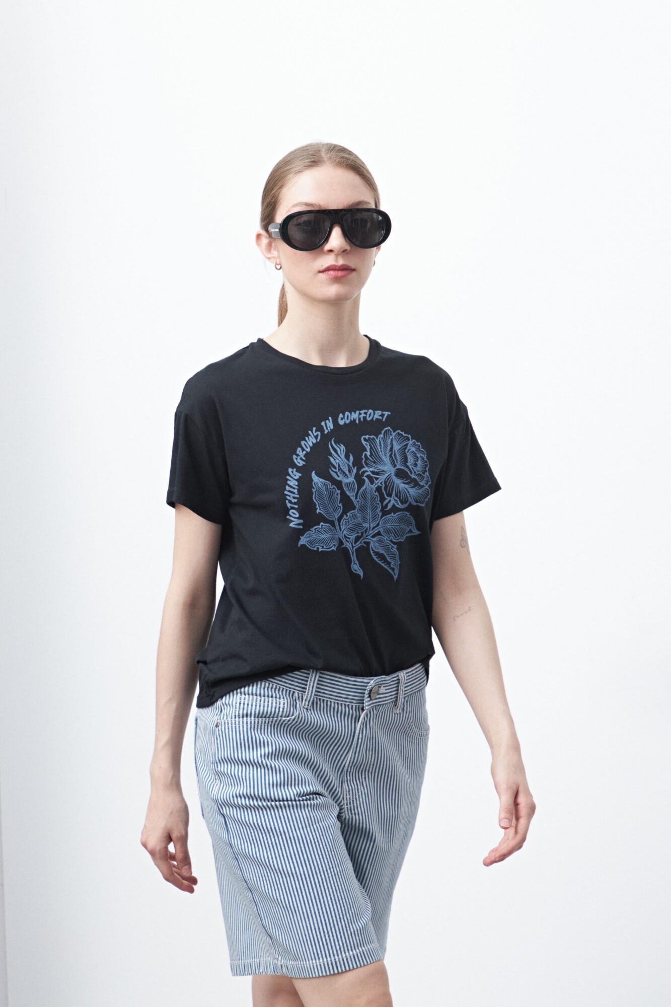 Remera de manga corta estampada que combina gráfica botánica y mensaje con impronta contemporánea. La estampa central aporta carácter y contenido visual, transformando un básico en una pieza con identidad propia. Su calce cómodo y relajado la vuelve ideal para el uso diario, sumando estilo sin resignar versatilidad, perfecta para looks urbanos con un toque expresivo.