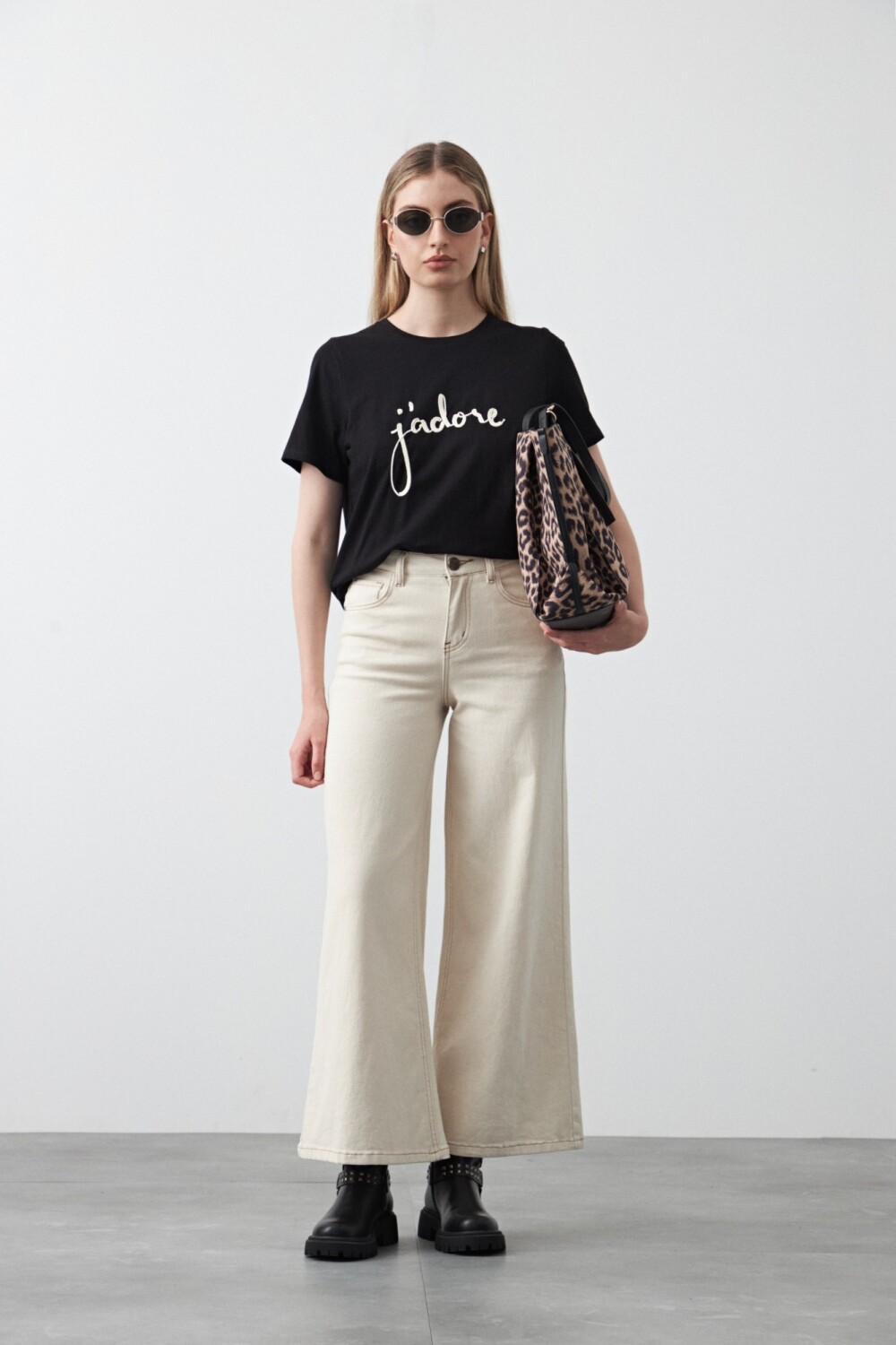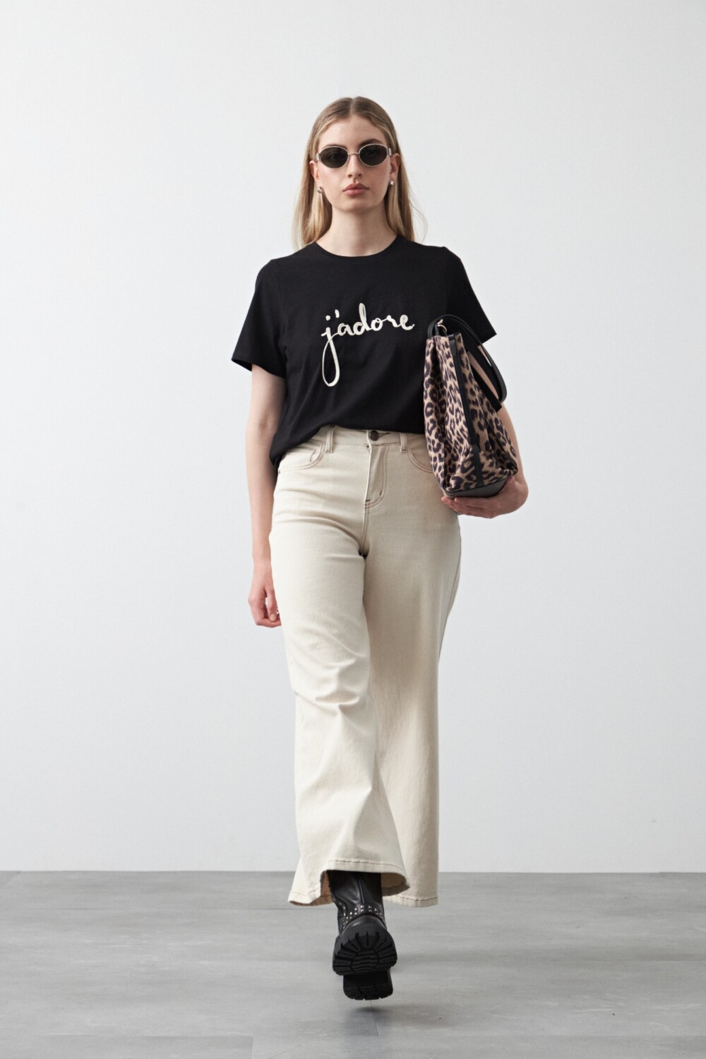 Remera de manga corta confeccionada en algodón de tacto suave y estructura liviana, pensada para un uso diario cómodo y versátil. El diseño incorpora un bordado frontal en tipografía cursiva con terminación en relieve, que suma un detalle sutil y femenino sin perder la impronta minimal. Una prenda fácil de combinar, ideal para looks relajados o más cuidados, clave para elevar cualquier look desde un básico con identidad.