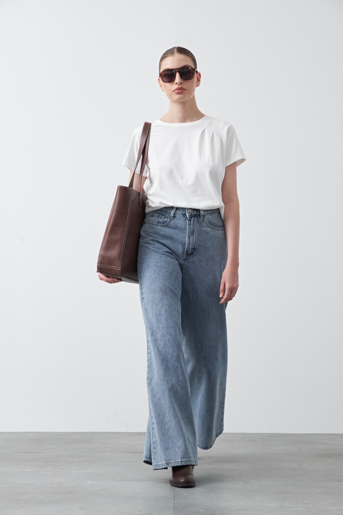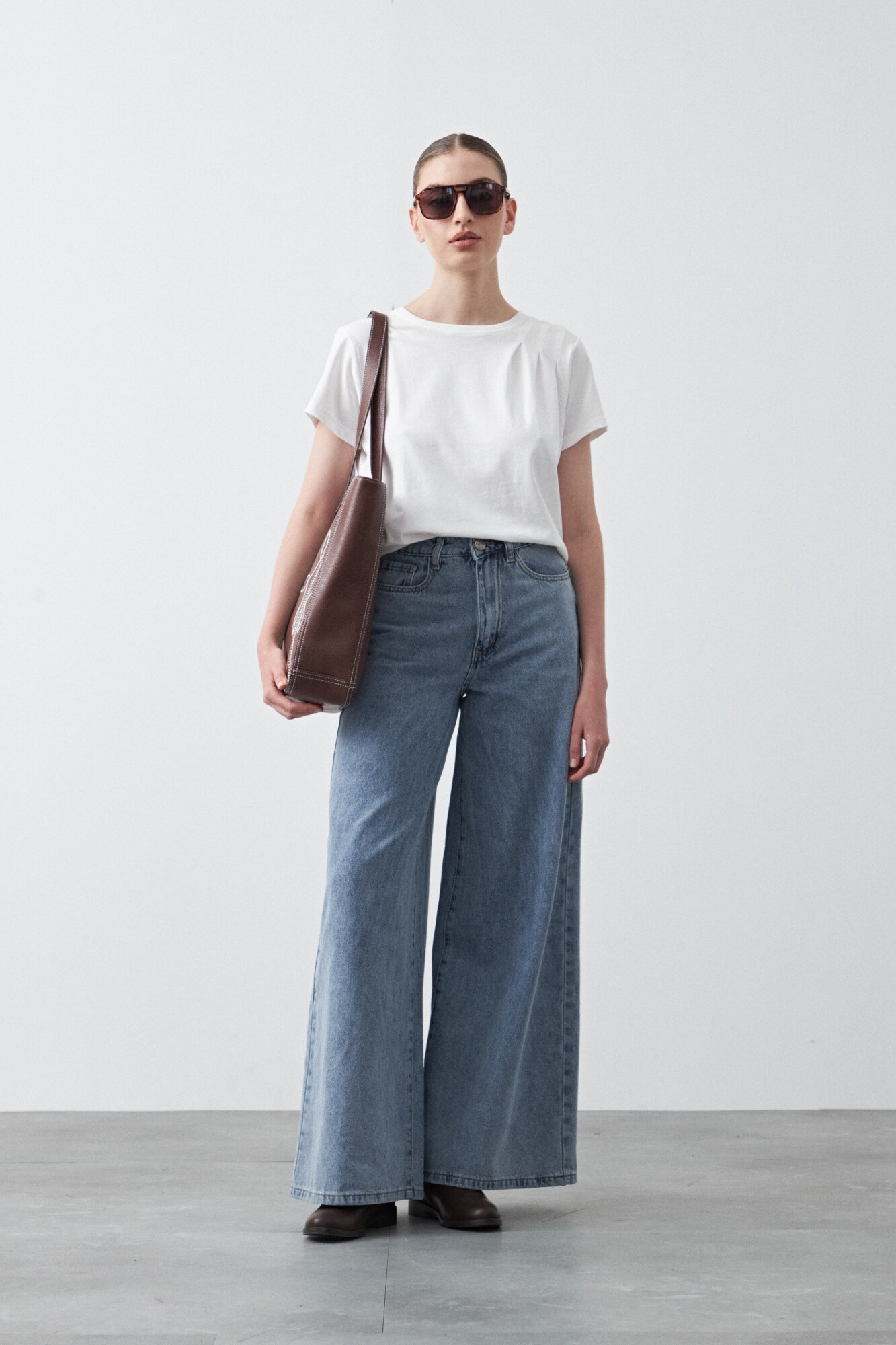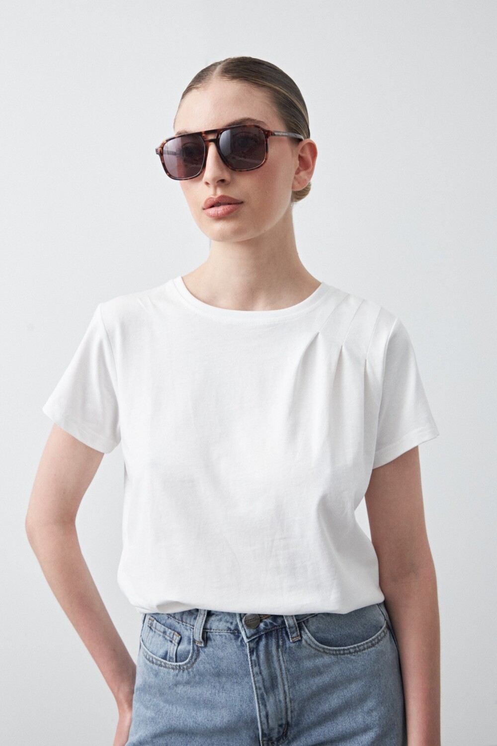 Remera básica de manga corta, un esencial del guardarropa que combina simplicidad y estilo. Su diseño de líneas limpias se realza con delicados pliegues sobre el hombro que aportan un detalle sutil y moderno. Con calce cómodo y versátil, es una prenda fácil de integrar en looks cotidianos, desde combinaciones casuales con denim hasta opciones más pulidas.
